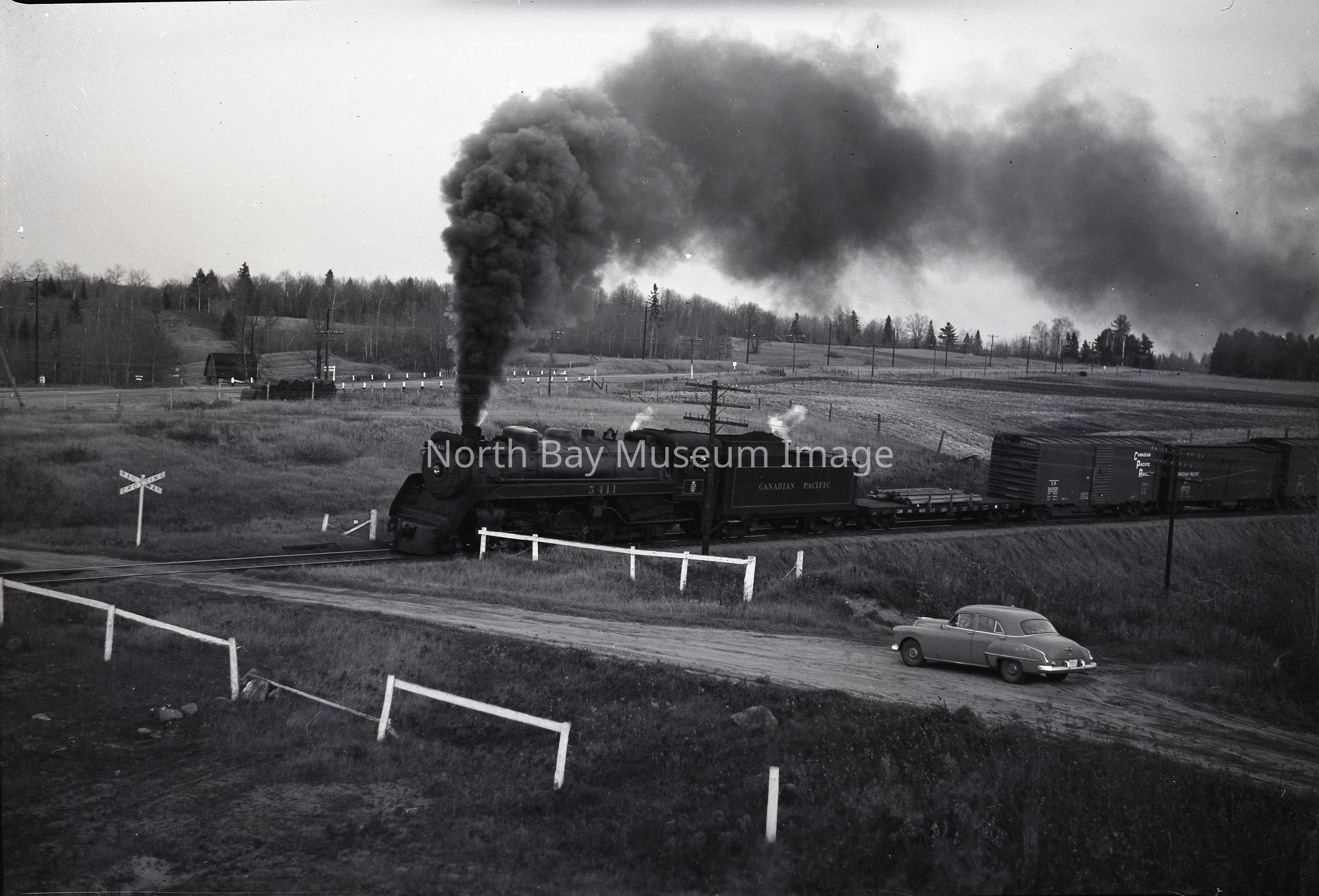 (a) is the Envelope that held this negative. The Inscriptions on the envelope are"C.P.R. Freight", "No. 11K6", "Larochelle's Crossing W / B", "Oct. 1952", "near Rutherlgen", "NEG".(b) is a Negative of CPR Steam Freight heading Westbound Near Rutherglen in October, 1952. There is dark cloud of smoke above the train. In the right hand corner a car can be seeing waiting by the tracks to continue driving once the train has passed. A part of the Forder Collection.Creator
