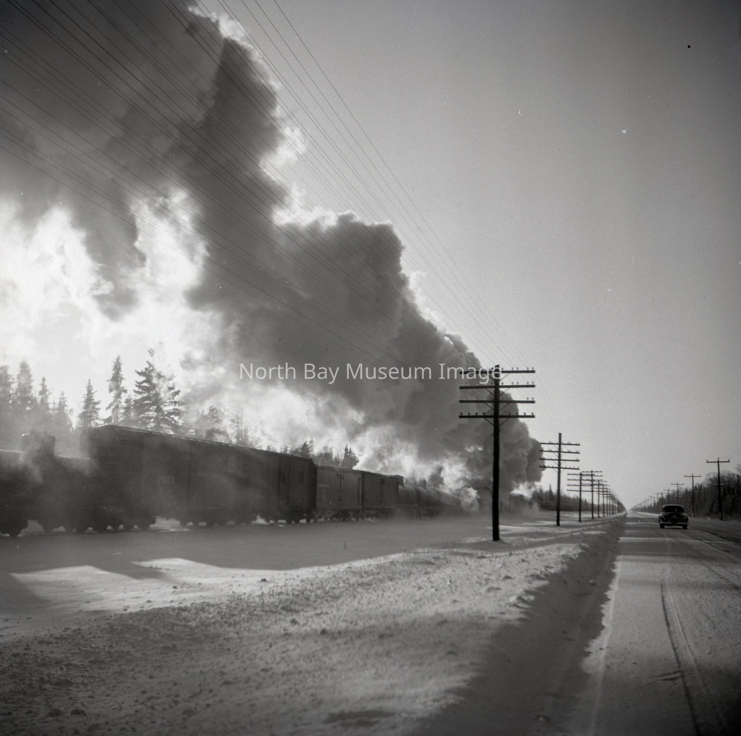 019.60.568a-b is a an Envelope and negative. (a) is the envelope and has the inscriptions "11K17. CPR Steam Freight, westbound, Meadowside, February 1953. Departing" written on it. (b) is the negative that shows the train passing. The front of the train has already past by the photographer when this photo is taken. There is snow on the ground. There is a large cloud of smoke coming from the train. Note the tall telephone poles lining the right hand side of the photo.Creator