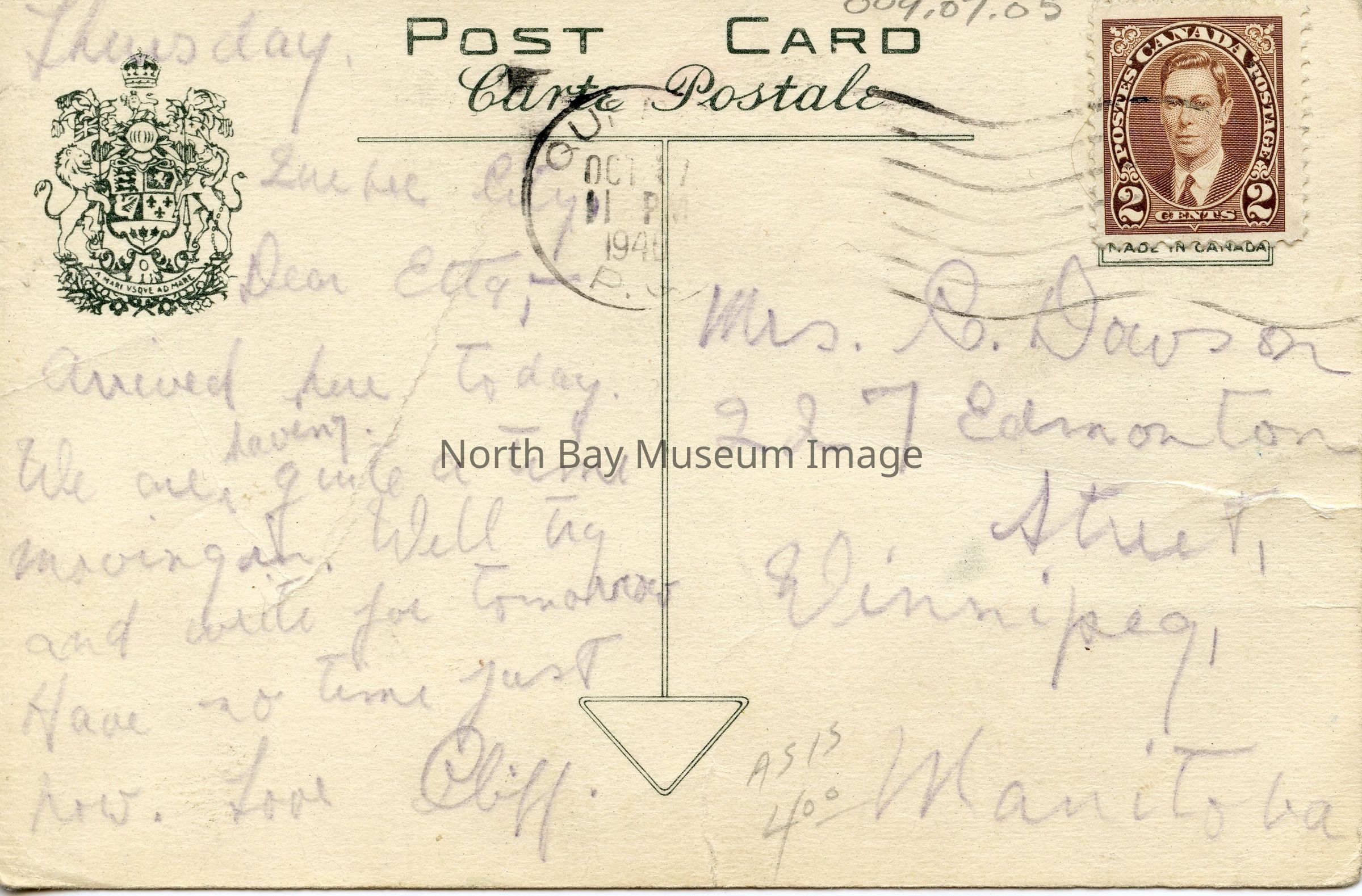"Thursday Quebec City Dear Etta, Arrived here today. We are having quite a time moving in. Will try and write for tomorrow. Have no time just now. Love Cliff.." The postcard is addressed to Mrs. C. Dowson, 227 Edmonton Street, Winnipeg, Manitoba.Date(s) of Creation