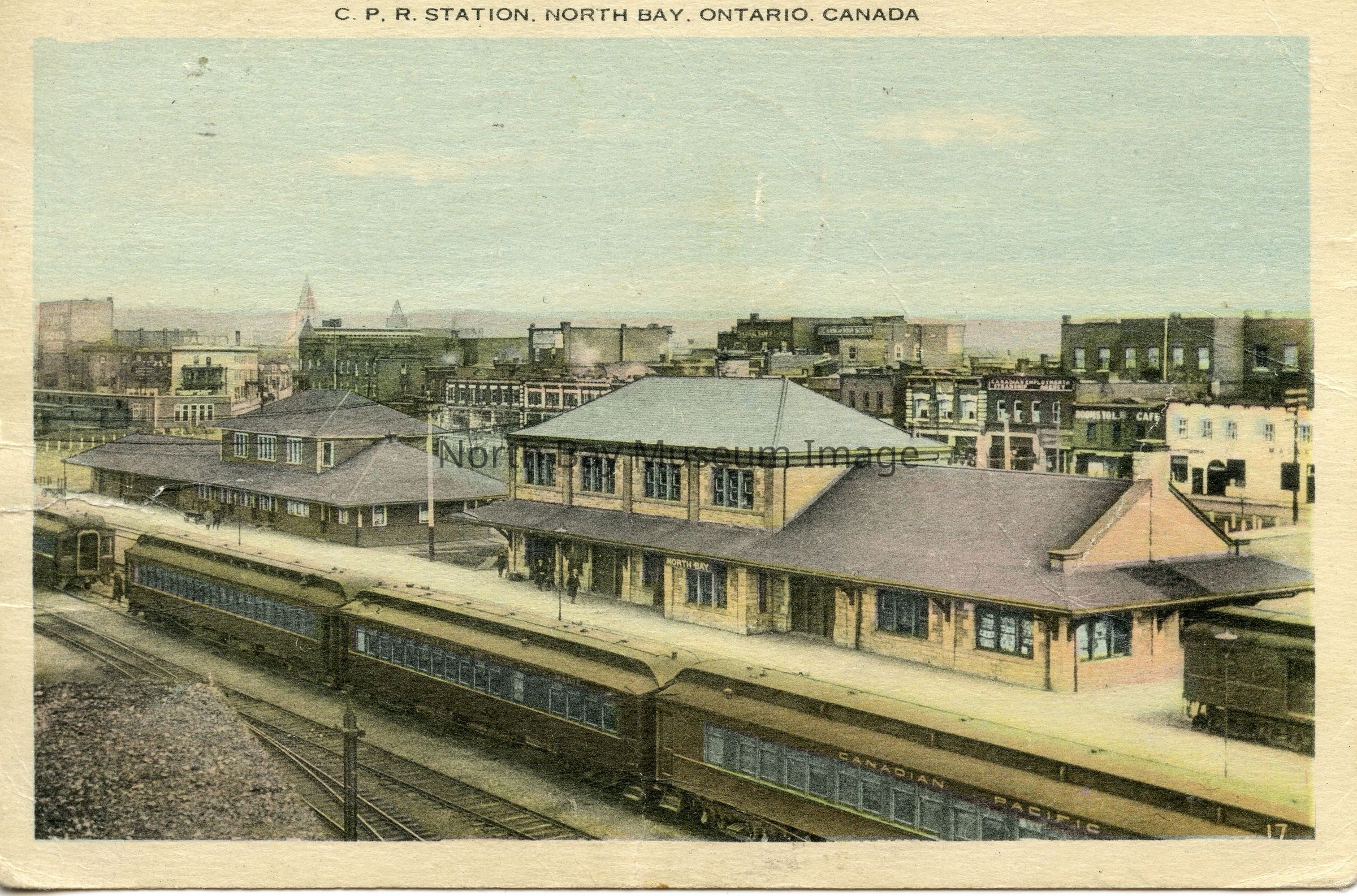 The front of the postcard has a coloured image of the of of C.P.R. Station, North Bay. There are CANADIAN PACIFIC carriages in foreground. Note the various traintracks in the back. There is also a clear view of North Bay downton buildings behind the two station buildings. The photo was taken prior to the extension of the 2nd floor of the main station which occured in 1946.