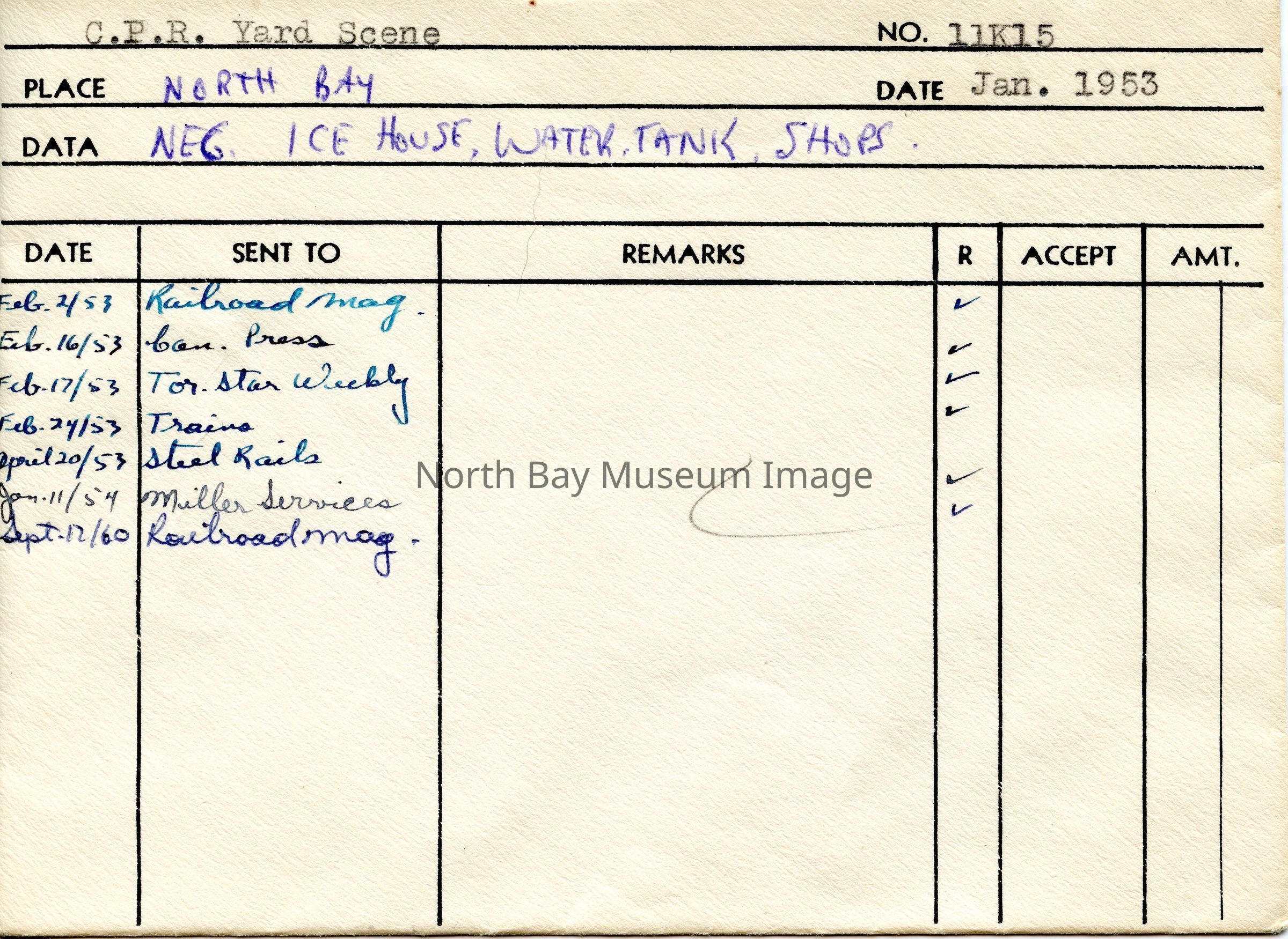 (a) is a photograph Envelope that was holding a negative. The envelope inscription (all of which are written in pen) reads: "C.P.R. Yard Scene", "11K15", "North Bay", "Jan. 1953", "Neg. Ice House, Water . Tank, Shops." All the publications are listed on the envelope. (b) is the negative. The negative is looking at all the amenities in the train yeard. There is small building, tall water tower. Most of the buildings have smoke coming from them. It appears to be winter in this image.Creator
