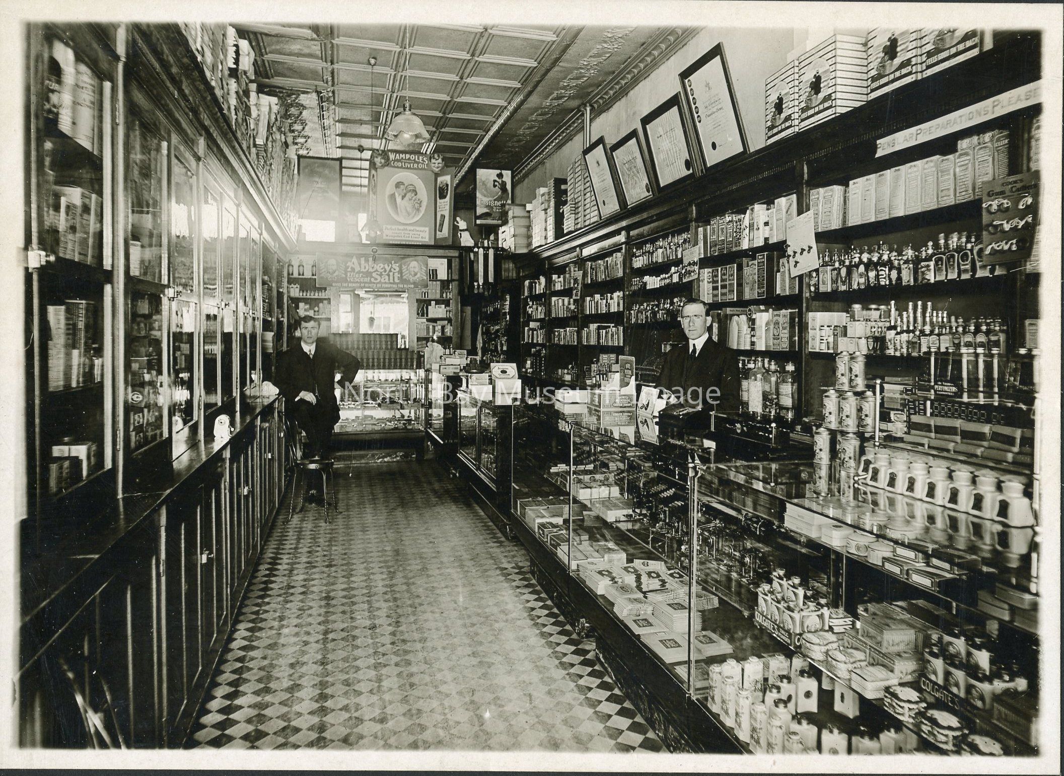 -Photograph. -Black & white. -7 x 5 x 8 x 10. -Interior of Lambertus Drug Store (1/2 store). -Man on left, James Lambertus. -Man on right, unidentified. -Date, 1912-1917, sometime between.