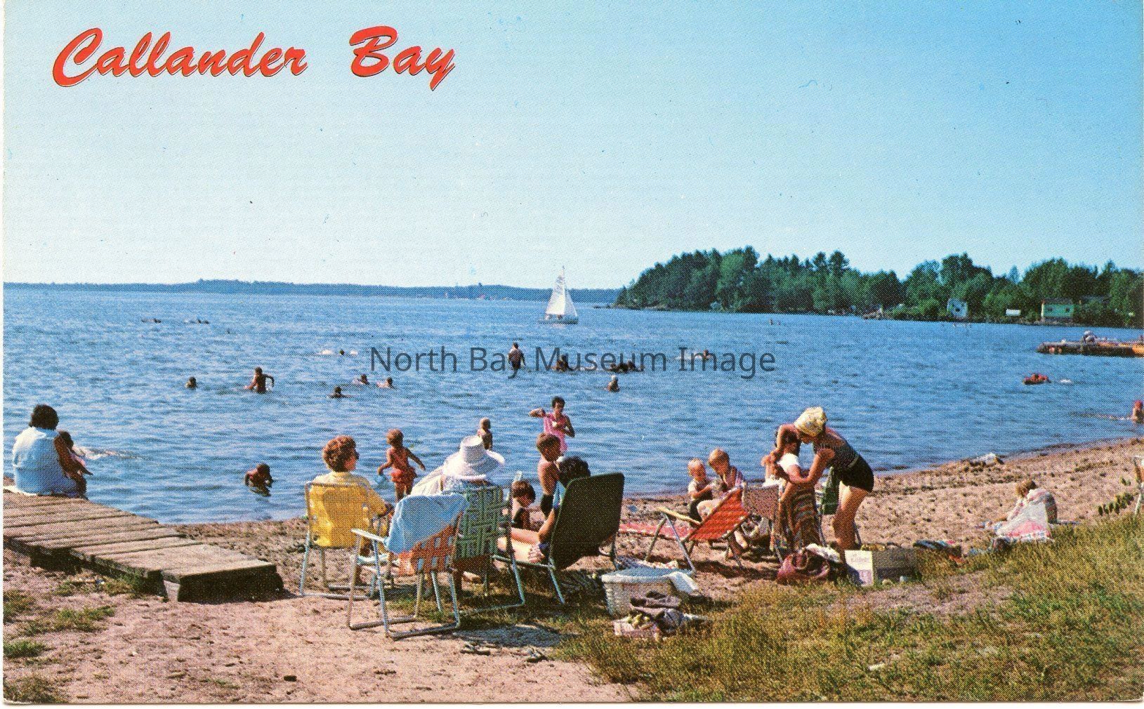 This is a coloured post card of Callander Bay. The postcard has a photograph on the front that is a view from beach showing Callander Bay, Lake Nipissing. The beach has a number of groups sitting on the beach lounging. There also appears to be people wadding in the water. This beach one of most popular spots in the area on hot, summer days.