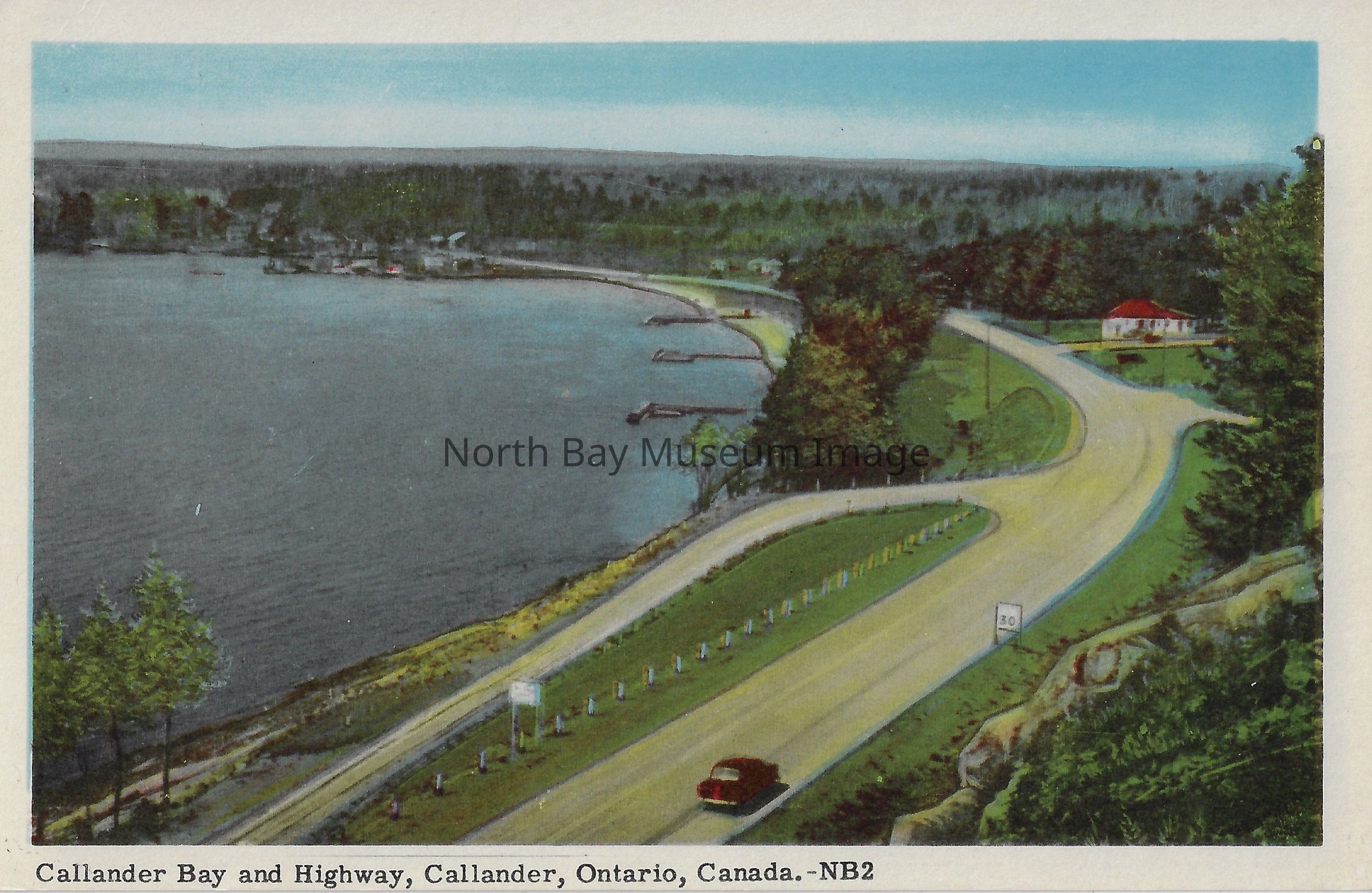 This is a Colour, painted postcard. The postcard depcits the highway coming into Callender. The highway has few cars on it. Note that the highway has a clear view out to the lake. The lake can be seen in the background. As well as the town of Callander can be seen in the background. "Callander Bay and Highway, Callander, Ontario, Canada".Date(s) of Creation