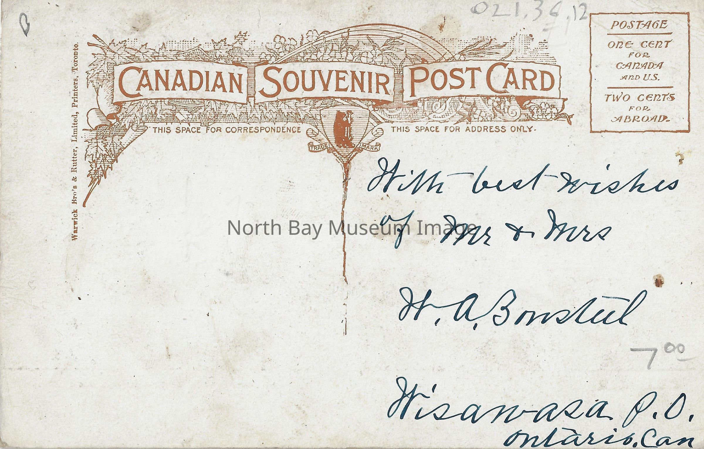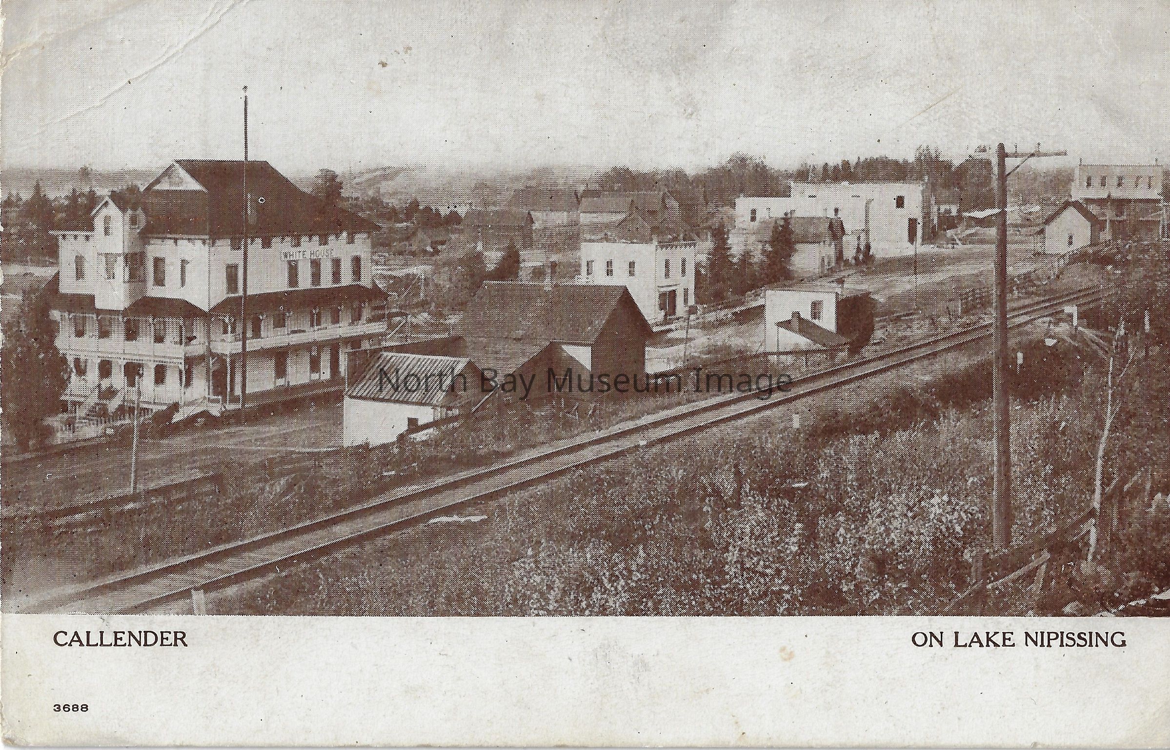 Black and white postcard showing railroad tracks, house with sign "White House", and numerous houses and buildings. Front caption: "Callender: On Lake Nipissing". Back inscription: "With-Best-Wishes of Mr + Mrs H.A.Bonsteel, Wisawasa P.O. Ontario.Can."Date(s) of Creation