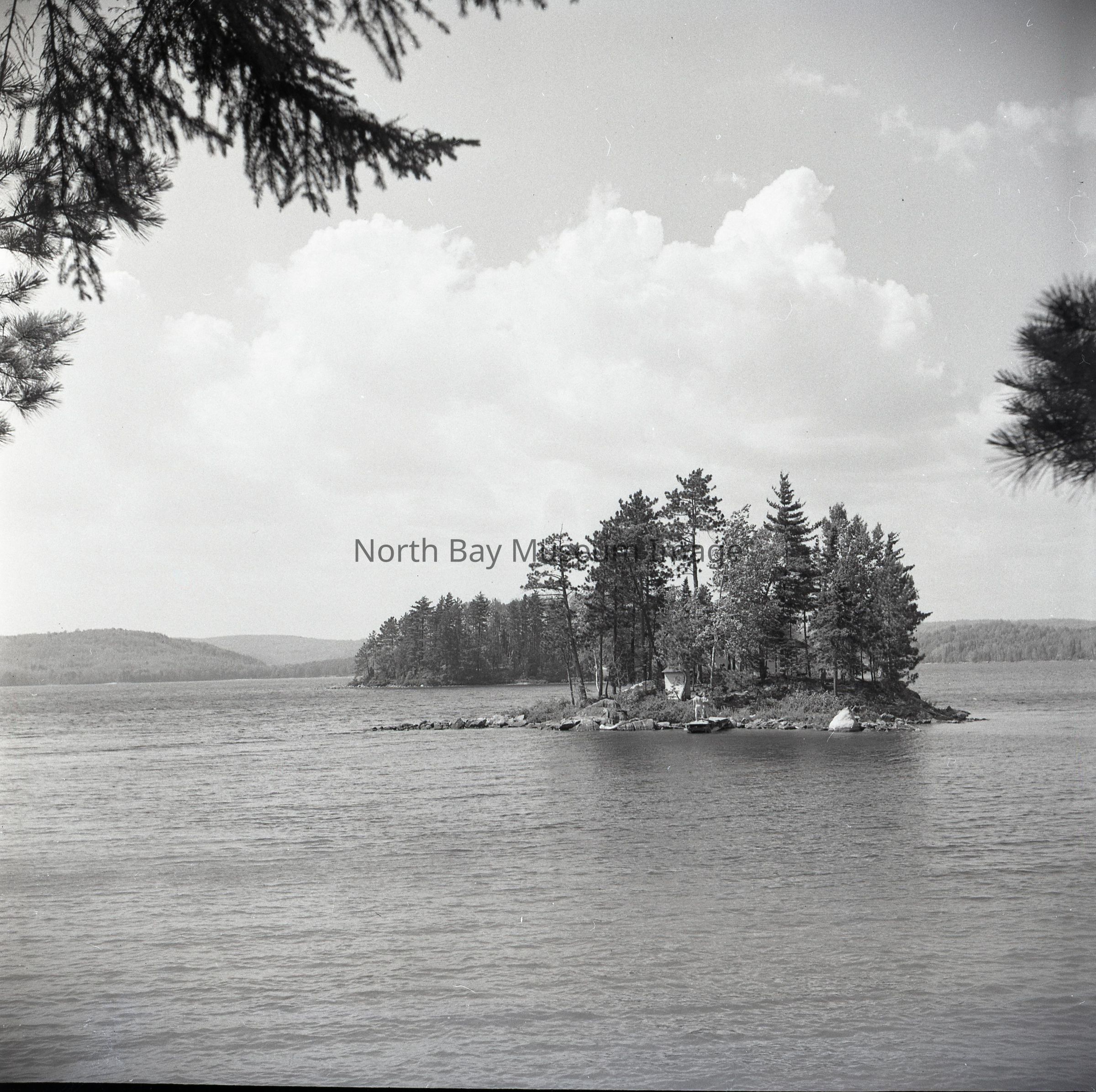 Photographer's Envelope (a) contained the photo and negative (b-c) of and island in Camp Woodcliffe- Island in Trout Lake. The images show a small island in the middle of Trout Lake. There is a deck with children on the small island. Original publications noted on the envelope. A part of the Forder Collection.Creator