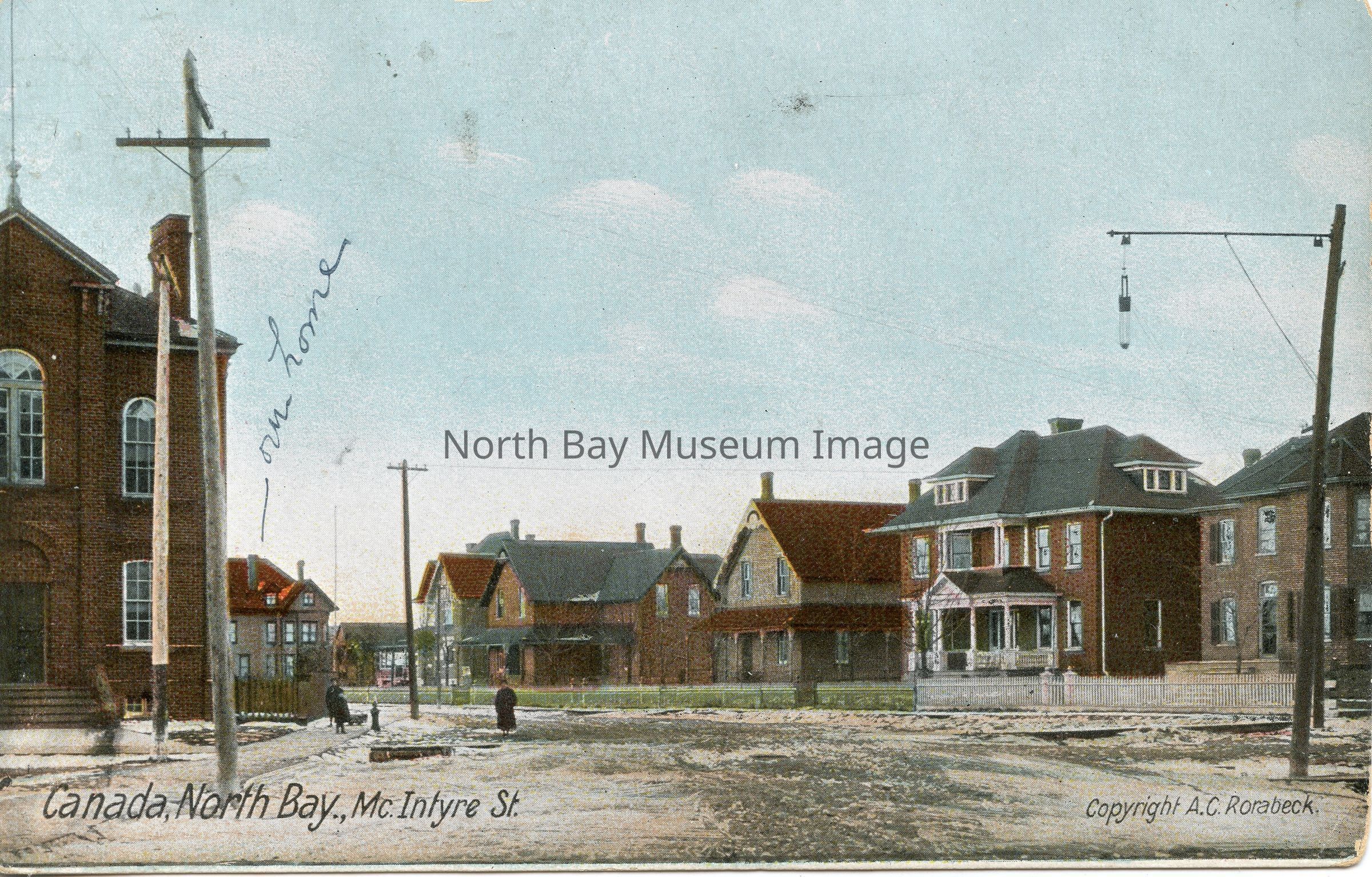 Postcard with color photo. Image is of McIntyres Street looking west with courthouse on the left showing the McIntyre and Plouffe Street intersection. Printed on front: "Canada, North Bay, McIntyre St." Bottom right corner: "copyright A.C. Rorabeck", who was early North Bay druggist. House to the right of courthouse is labelled "our home"