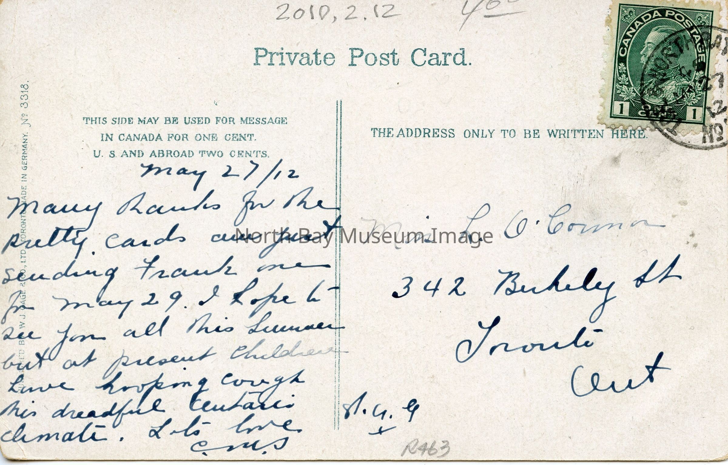 -- Addressee: Miss L. G. Corman (?), 342 Berkely St., Toronto, Ont.