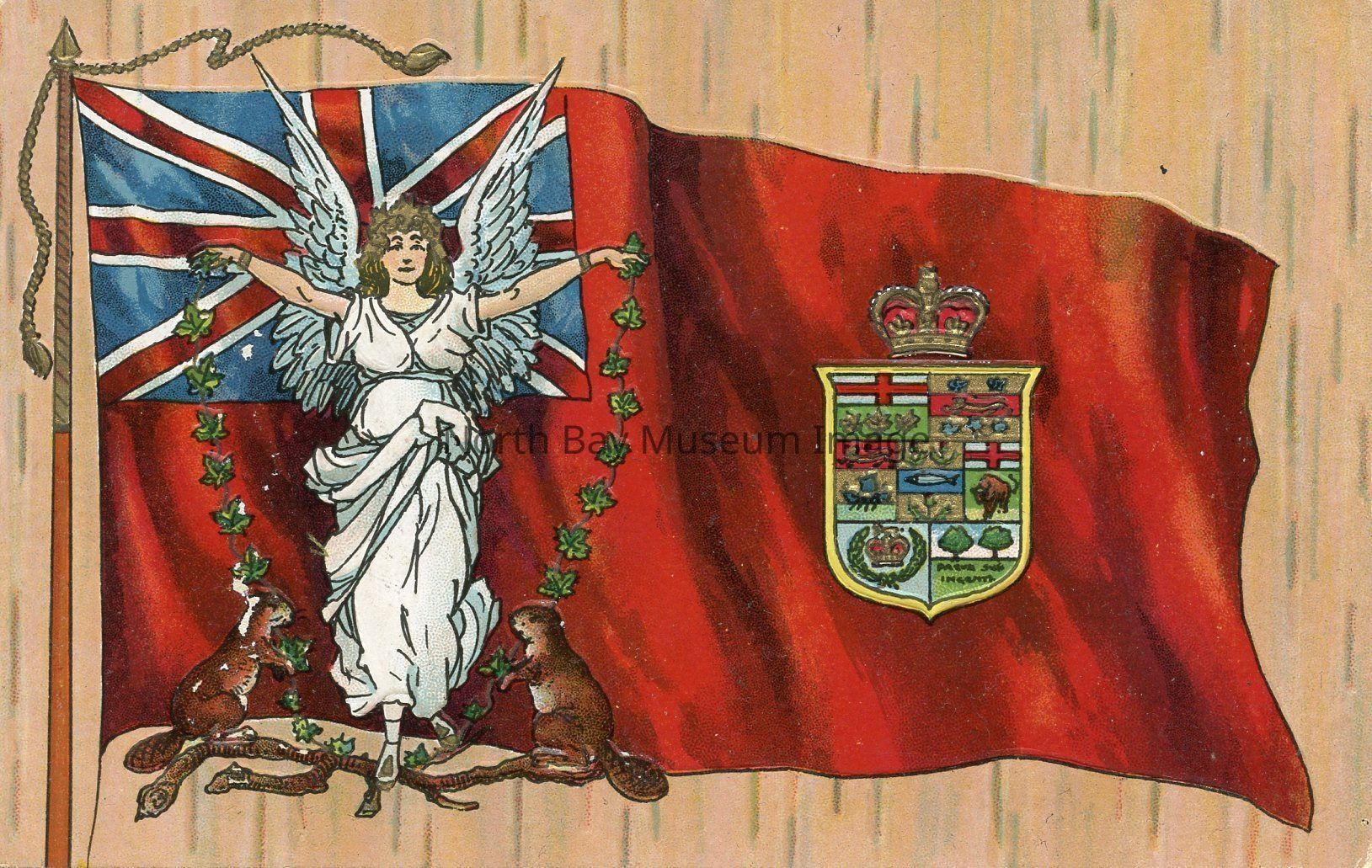 The postcard has a simulated birchbark background. The front of the postcard depicts the Canadian insignia with an angel in white on the left hand side along with two small beavers and a chain of maple leaves.