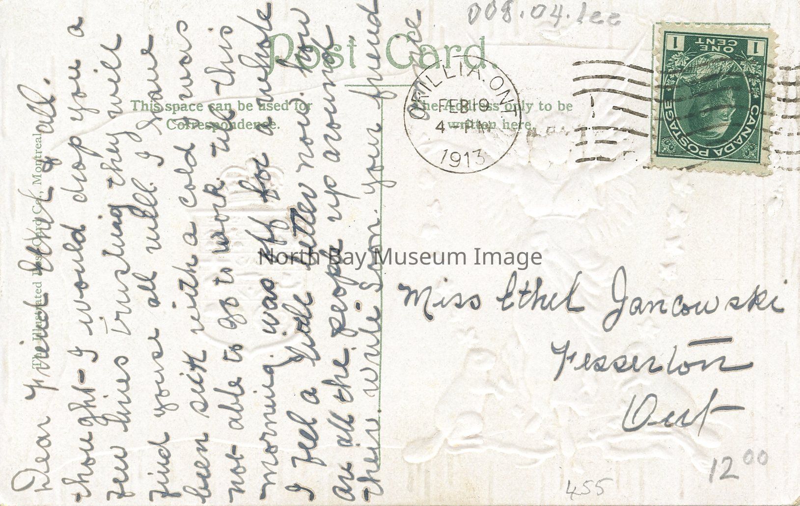 On the back of the postcard is the signage "green one cent stamp - King Edward V11 (upside down)." There also is a circular postal stamp that reads "ORILLIA,ONT Feb 19 4 p.m. 1913." There is a handwritten message in ink written vertically on the left hand side saying: "Dear Friend Ethel and all. Thought I would drop you a few lines trusting they will find youse all well. I have been sick with a cold I was not able to go to work till this morning was off of a whole I feel a little better now how are all the people up around their write soon your friend Annie"