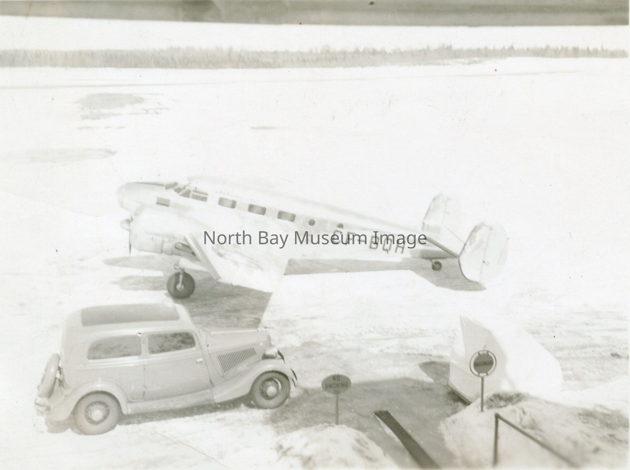 Photograph of small car and Beech A-18A airliner. Although North Bay's airport was owned by Trans Canada Airlines this airplane was owned by Canadian Pacific Airlines until it was sold to a gentleman in British Columbia in 1948. In front of the plane is a small Ford car and airport signage. The back of the picture has text which reads "Lorne Hicks 1935? Ford Car North Bay Airport"