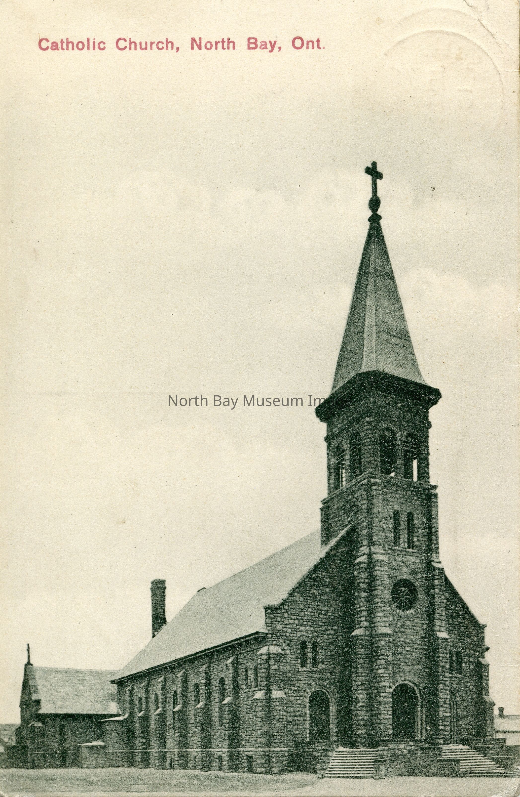 Postcard with B&W photo of Pro-Cathedral in North Bay, located at Algonquin Ave and McIntyre St. West. Construction of the $65,000 St. Mary’s Church, designed by architect Angus, was finished in Fall 1905; it was blessed and dedicated on 17 December 1905. It had been renamed as the Pro-Cathedral by 1910.