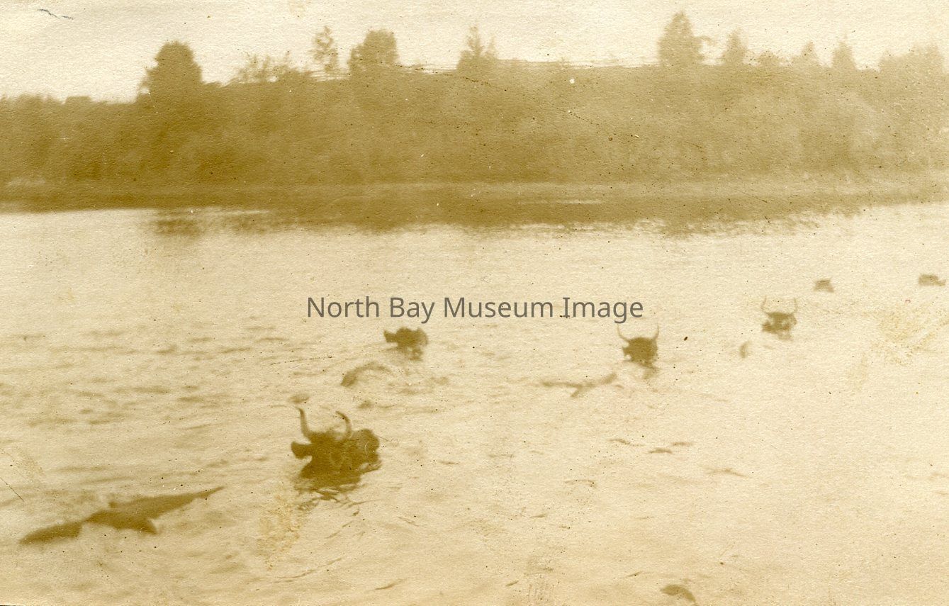 Cattle Swimming - sepia photograph - shows cattle swimming across a body of water - bush spans the background of the photograph - appears to be half a dozen (6) cattle, possibly more