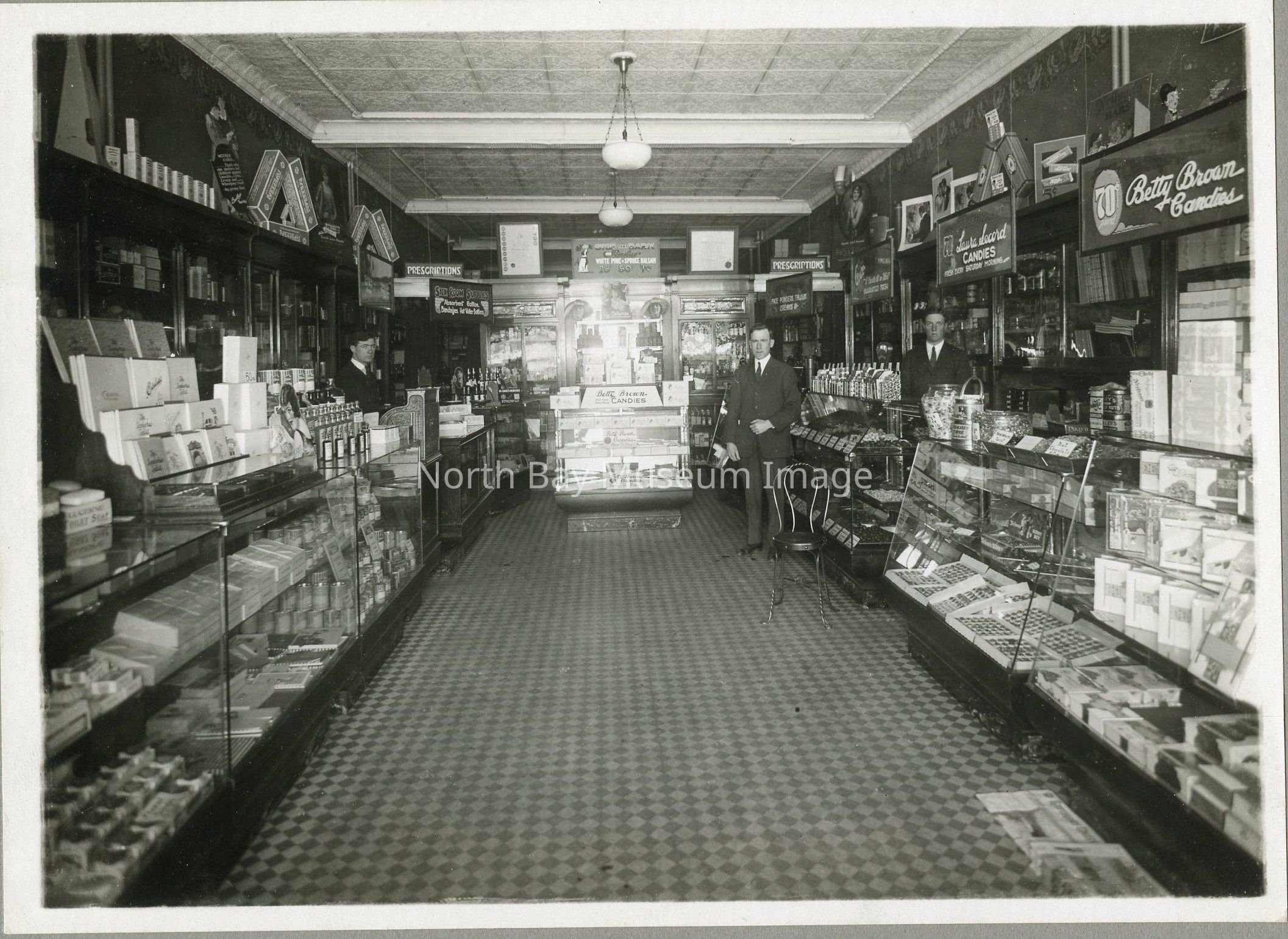Black and White Photograph on grey mat depicting the interior of Lambertus Drug Store (whole store) on Main Street. Man in center, J. Lambertus, Dated between 1917-1927.