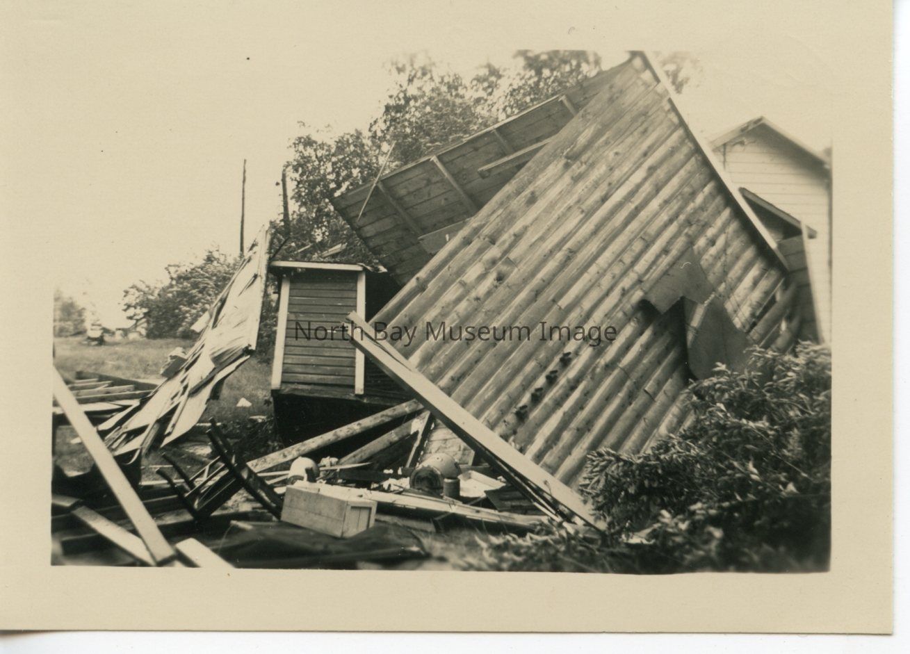 -Black and white photo of a destroyed in Ferris (Torbay?). -Building destroyed by a windstorm, Aug 3, 1943. -9.2 cm wide, 6.6 cm high.