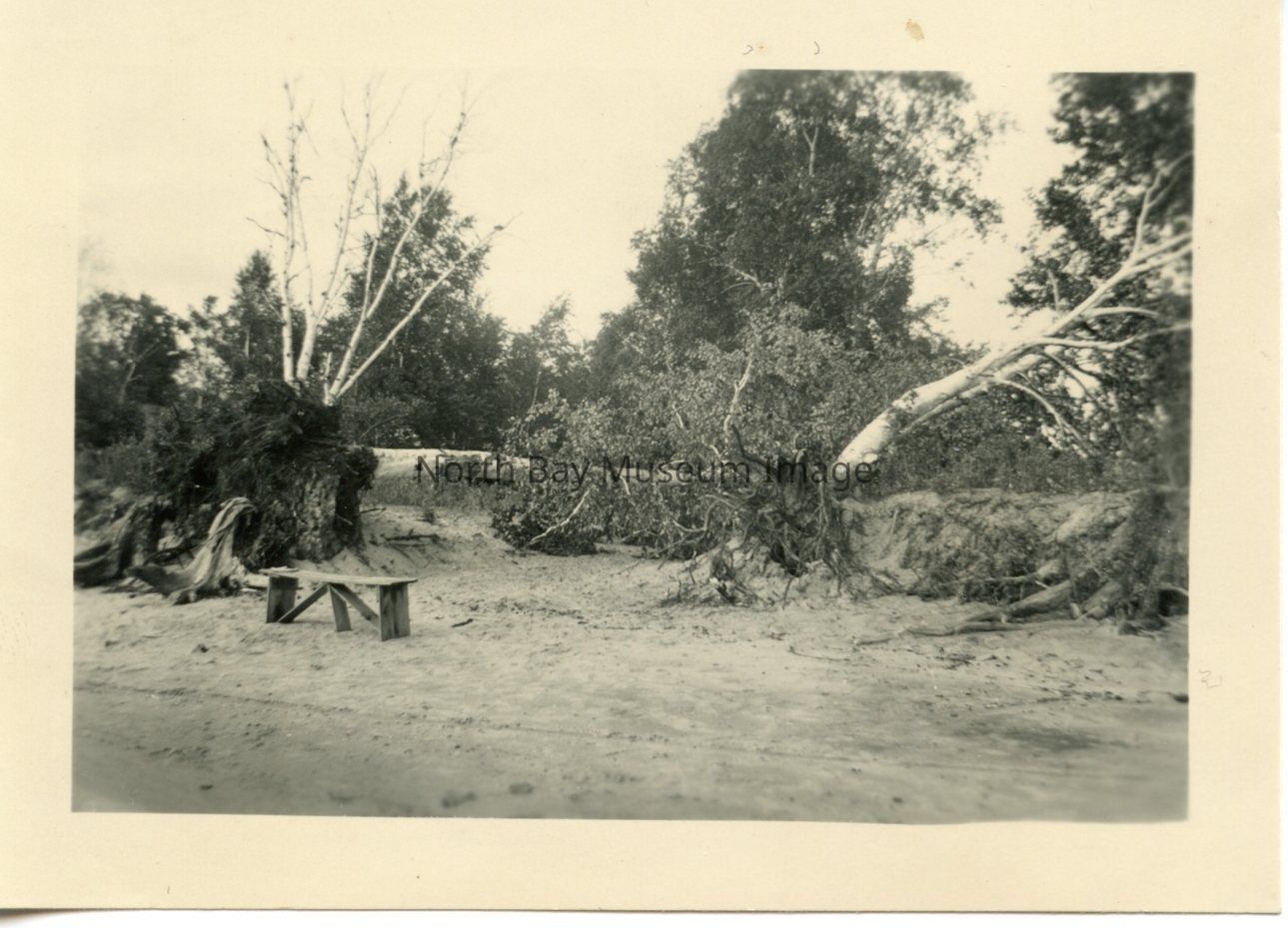 Black and white photo of uprooted trees behind black & white lodge, current site of Leisureworld. Taken Aug. 31, 1943.