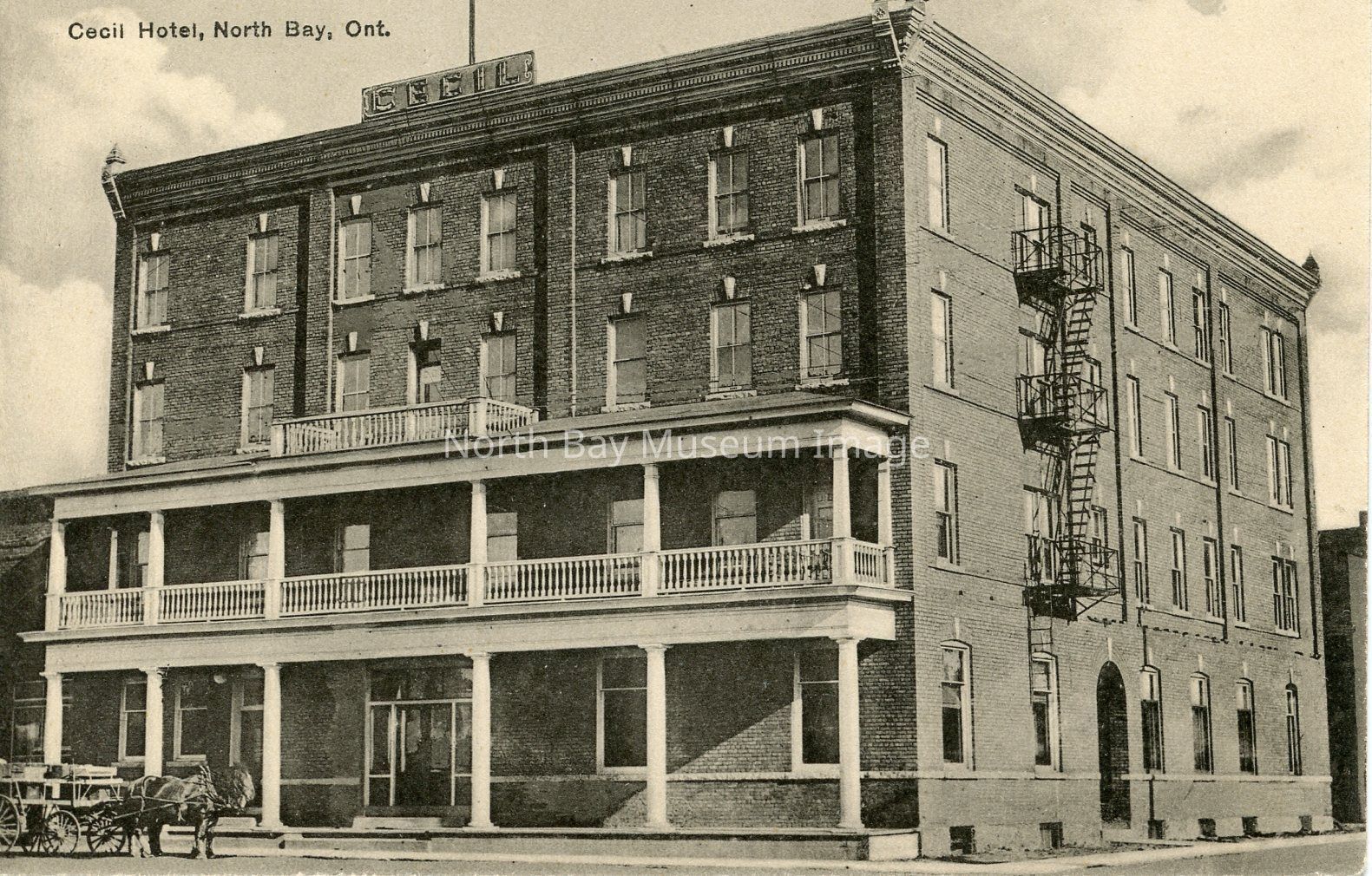 This is a black and white postcard of the Cecil Hotel in North Bay. This picture was taken in the early 20th Century. The Cecil hotel is a 5 storey hotel. There are big windows all around the building. The second storey has a white balcony around it. On the side of the building there is fire escape ladders. The front entrance of the Cecil Hotel is framed by white collums.