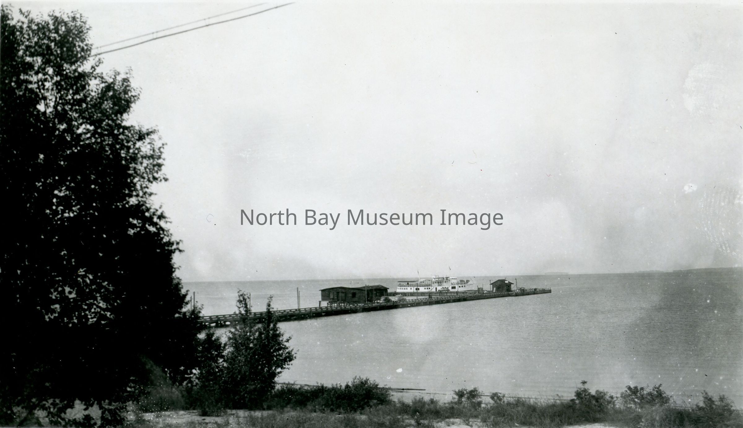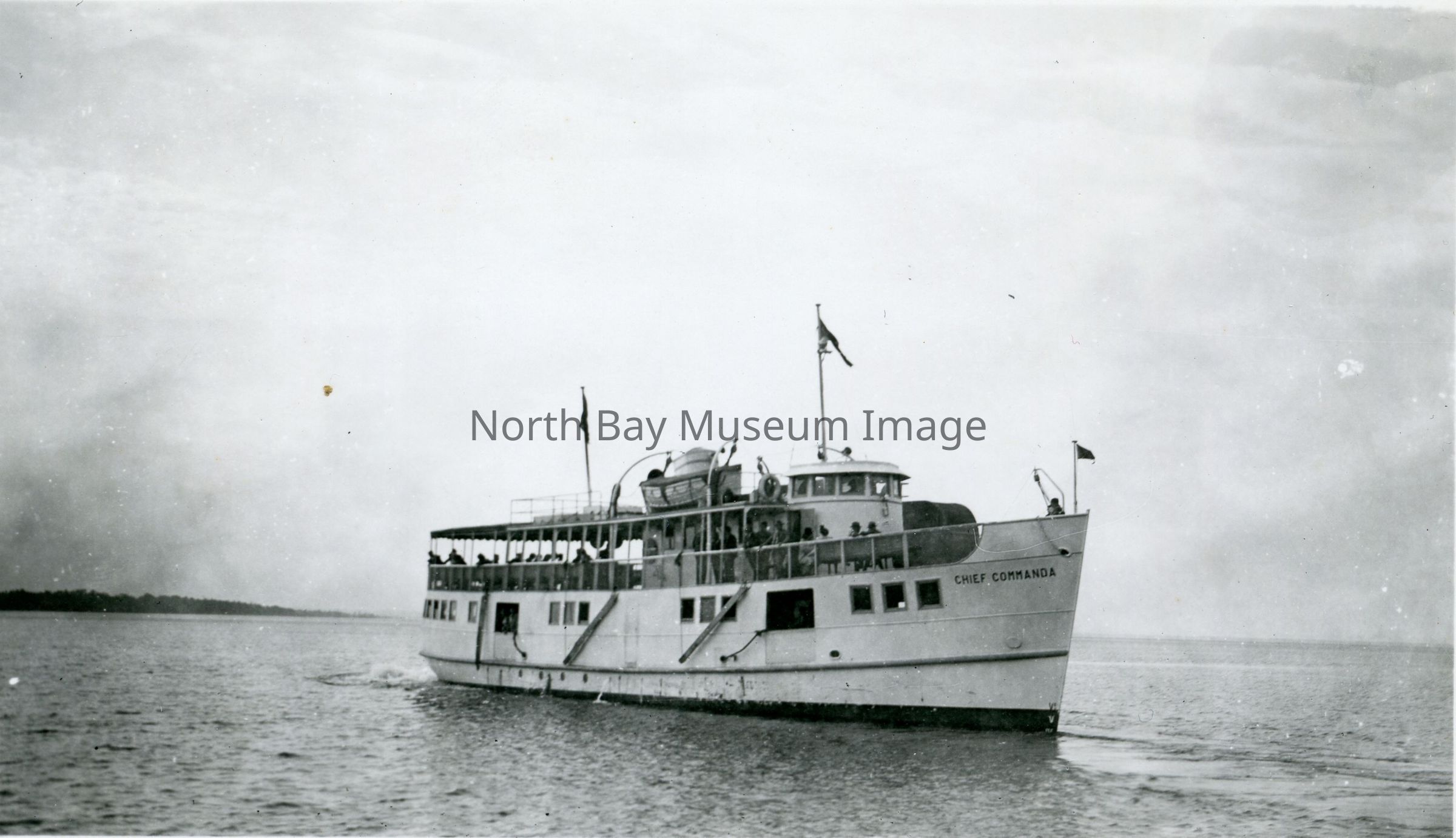 Photograph (a) A shows the Chief Commanda by Government Dock in 1949, taken from afar. Photograph (b) shows Chief Commanda out on the water in North Bay in 1949.