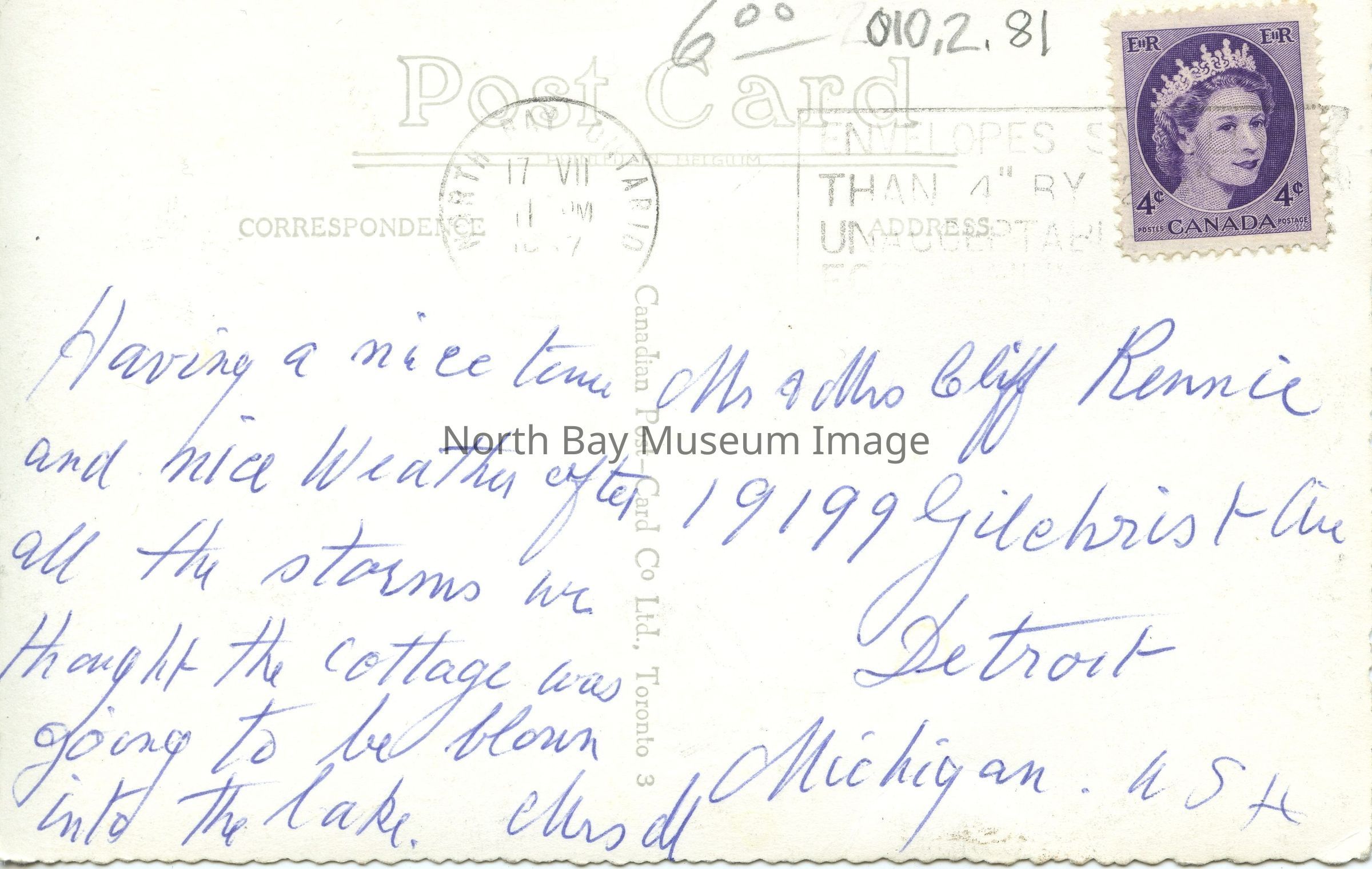 Postmark: North Bay Ontario, 17 VII [July], date mostly faded but could be 1957Creator