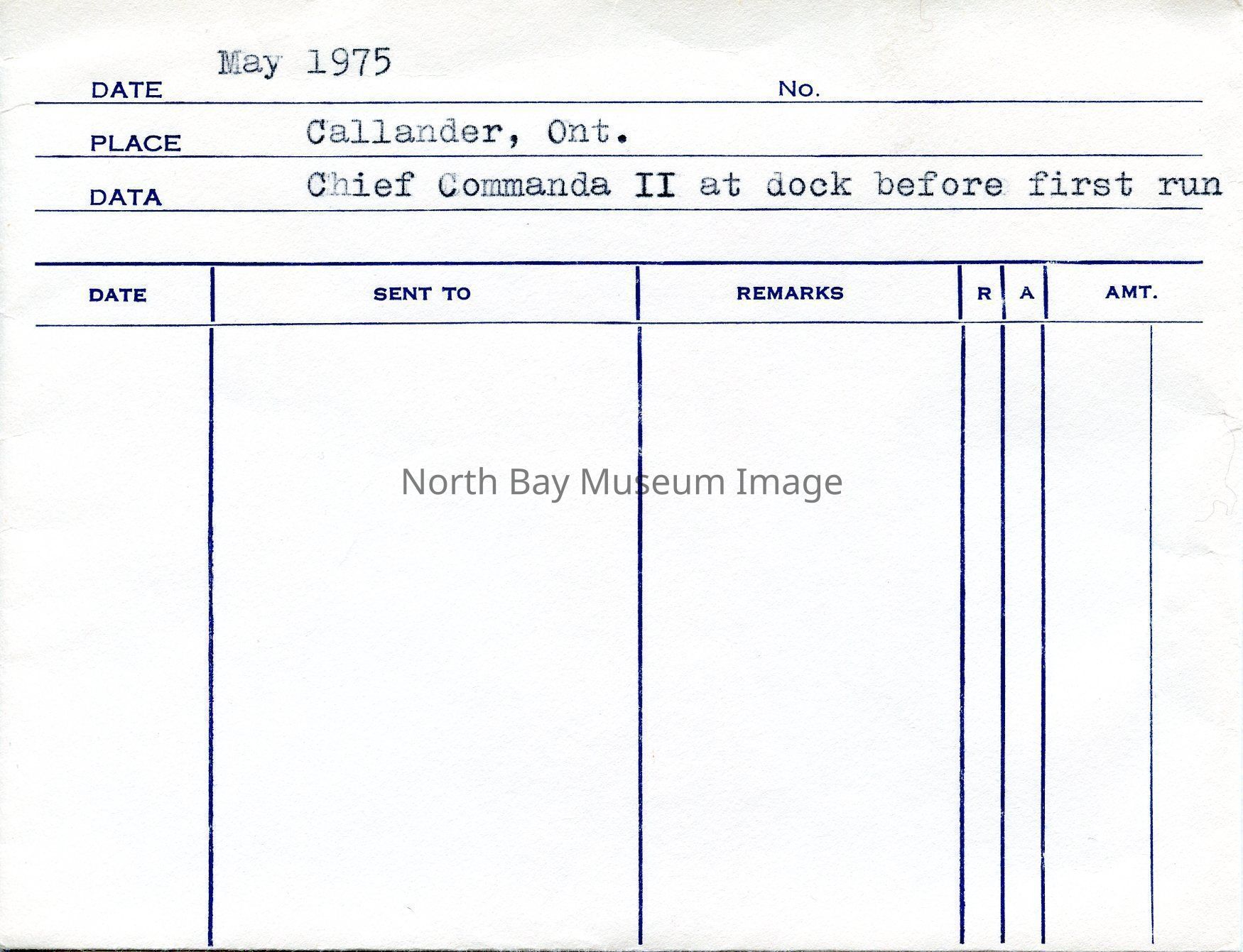Envelope (a) contains the negative (b) of the Chief Commanda at Dock in Callander ON before its first ever run on the water. The images show the grand size of the Commanda as the images are taken from a lower angle across from the water, as well as, highlights the clean and pristine condition the boat is in before its debut on the water. This image is a part of the Forder Collection.Creator