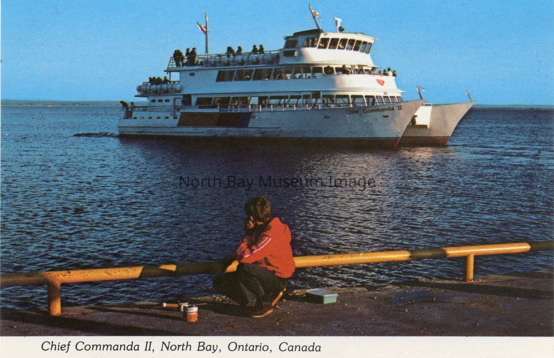 This is a postcard with a Coloured photograph of the Chief Commanda II in North Bay, O.N., Can." The photo shows the Chief Commanda II sailing in the lake. There is a young man in a red shirt, fishing from dock, gazing at the Chief Commanda II.