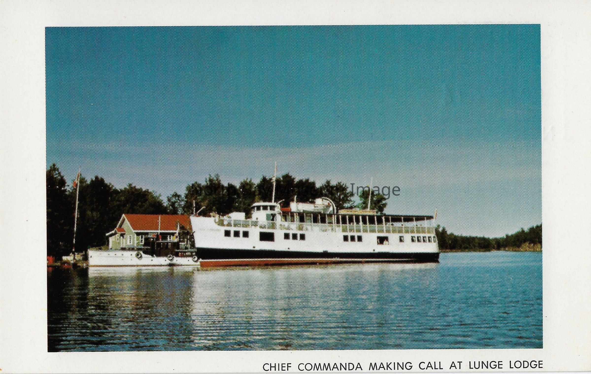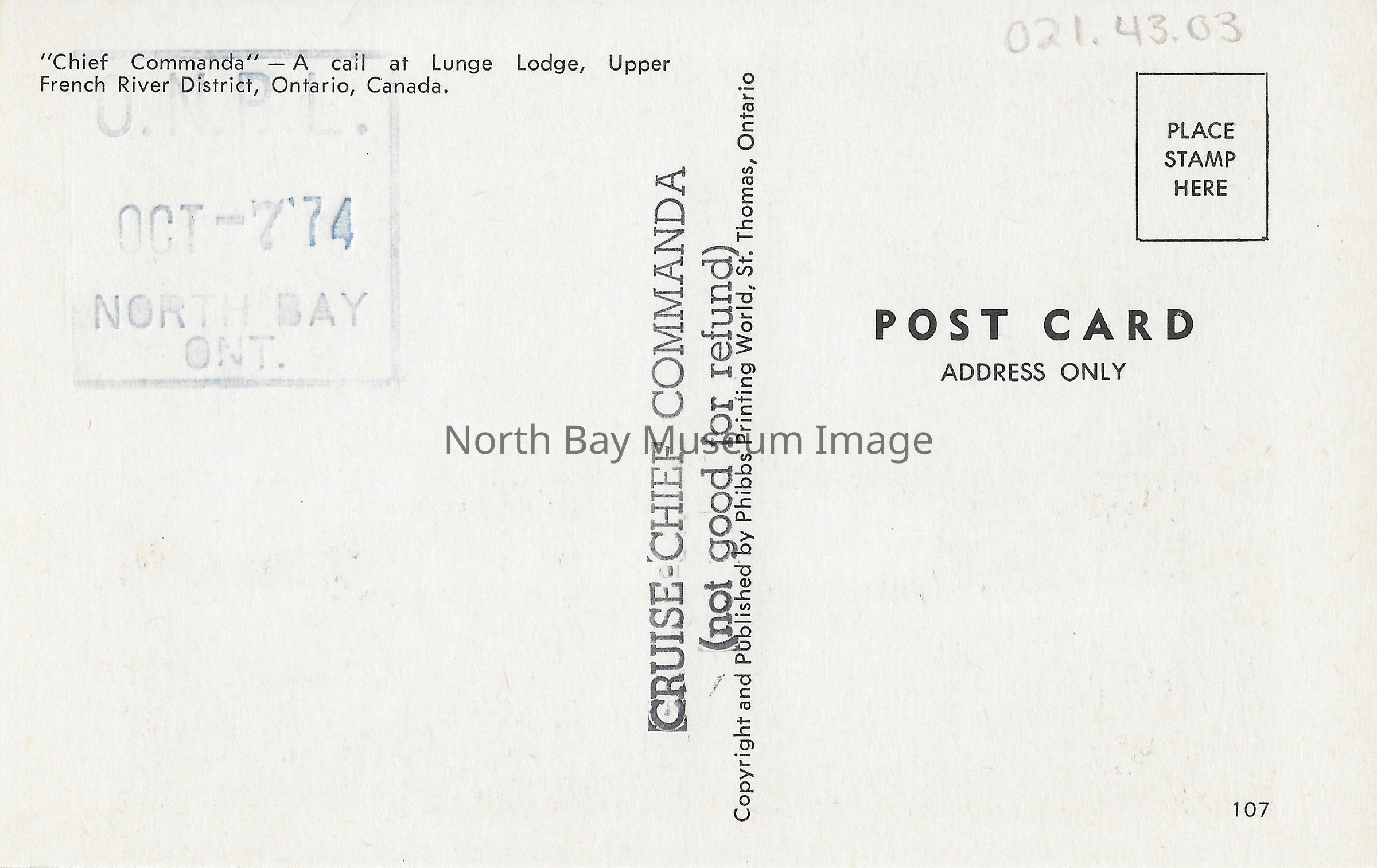 Colour postcard with photograph of the Chief Commanda at Lunge Lodge. On the back "Chief Commanda-A cail at Lunge Lodge, Upper French River District, Ontario Canada." and "Copyright and Published by Phibbs Printing World, St. Thomas, Ontario." Stamped on back is "U.N.B.L Oct-7'74 North Bay ONT." and "Cruise-Chief Commanda (not good for refund)".Creator