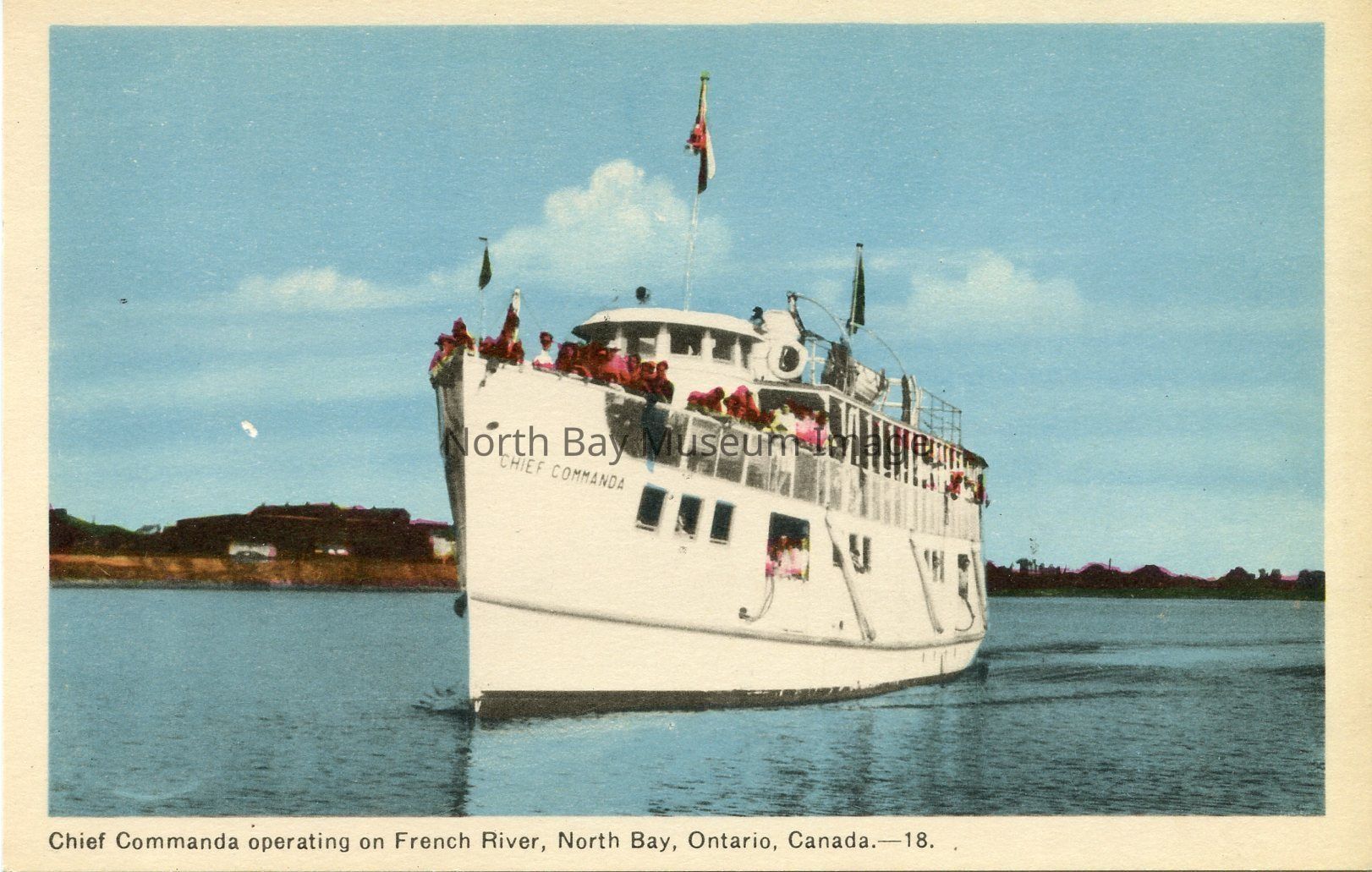This is a postcard with a back and white photo that has been coloured. The photo is of the Chief Commanda cruising on the French River which is located near North Bay.