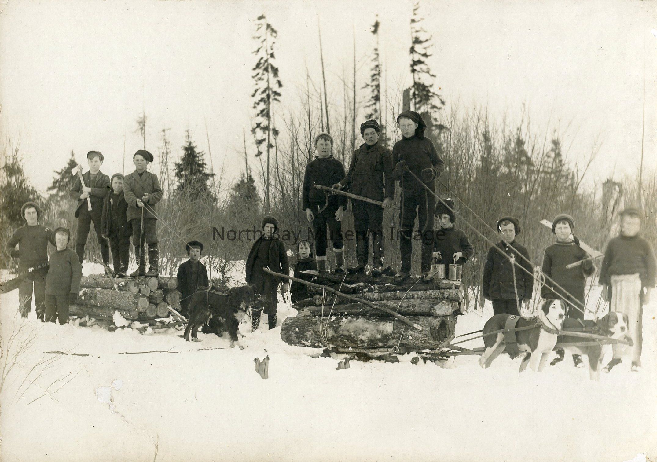 -Photograph. -Black & white. -6.5 x 4.5. -On cream colour mat, 9 x 7. -Group of 15 boys standing on and around bundits of logs. -They are holding axes, saws, and other logging tools. -Taken during winter.