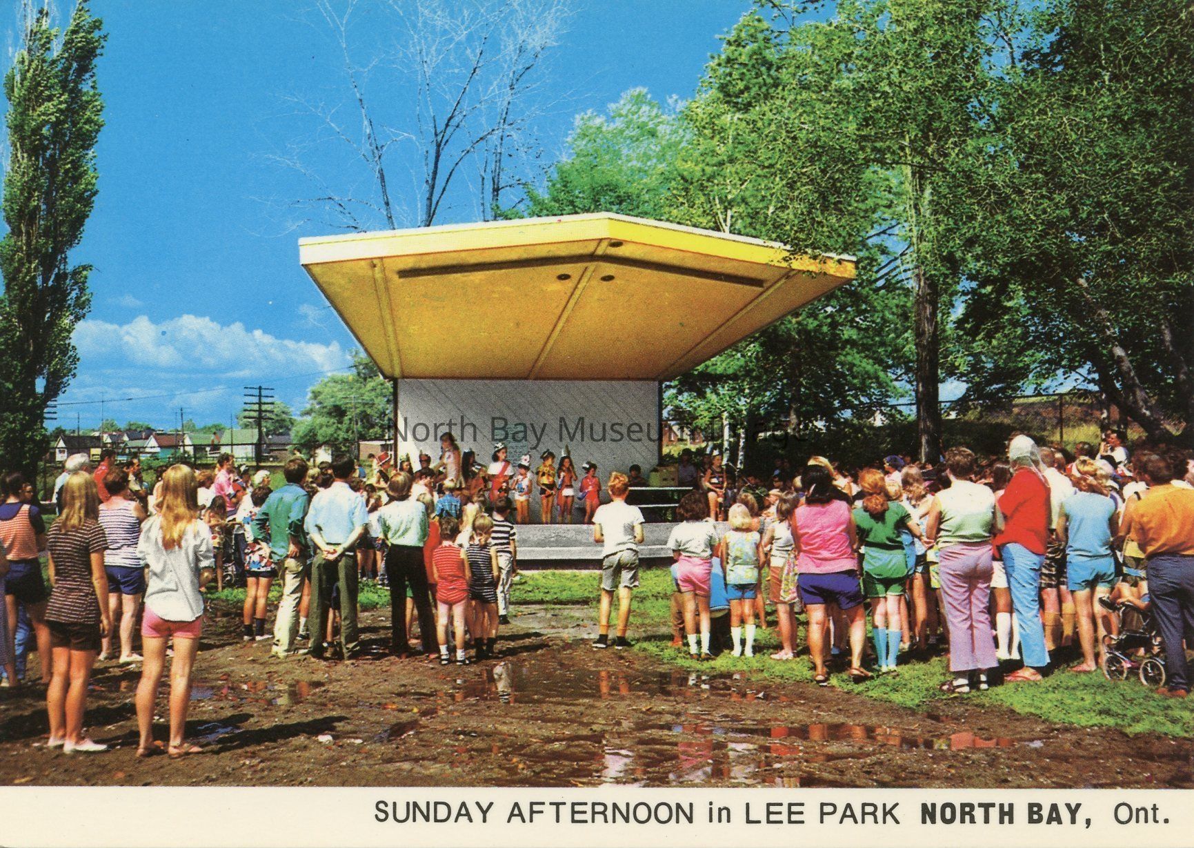 This postcard is of Choosing of a Playground King and Queen on a Sunday Afternoon in Lee Park North Bay, Ont. The postcard shows an image of a large group of children and parents facing the bandstand where a group of children are on the stage.