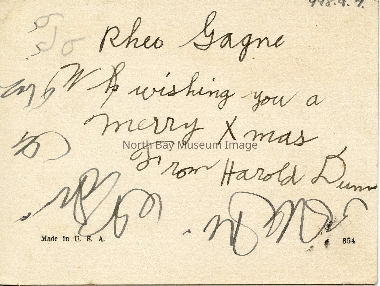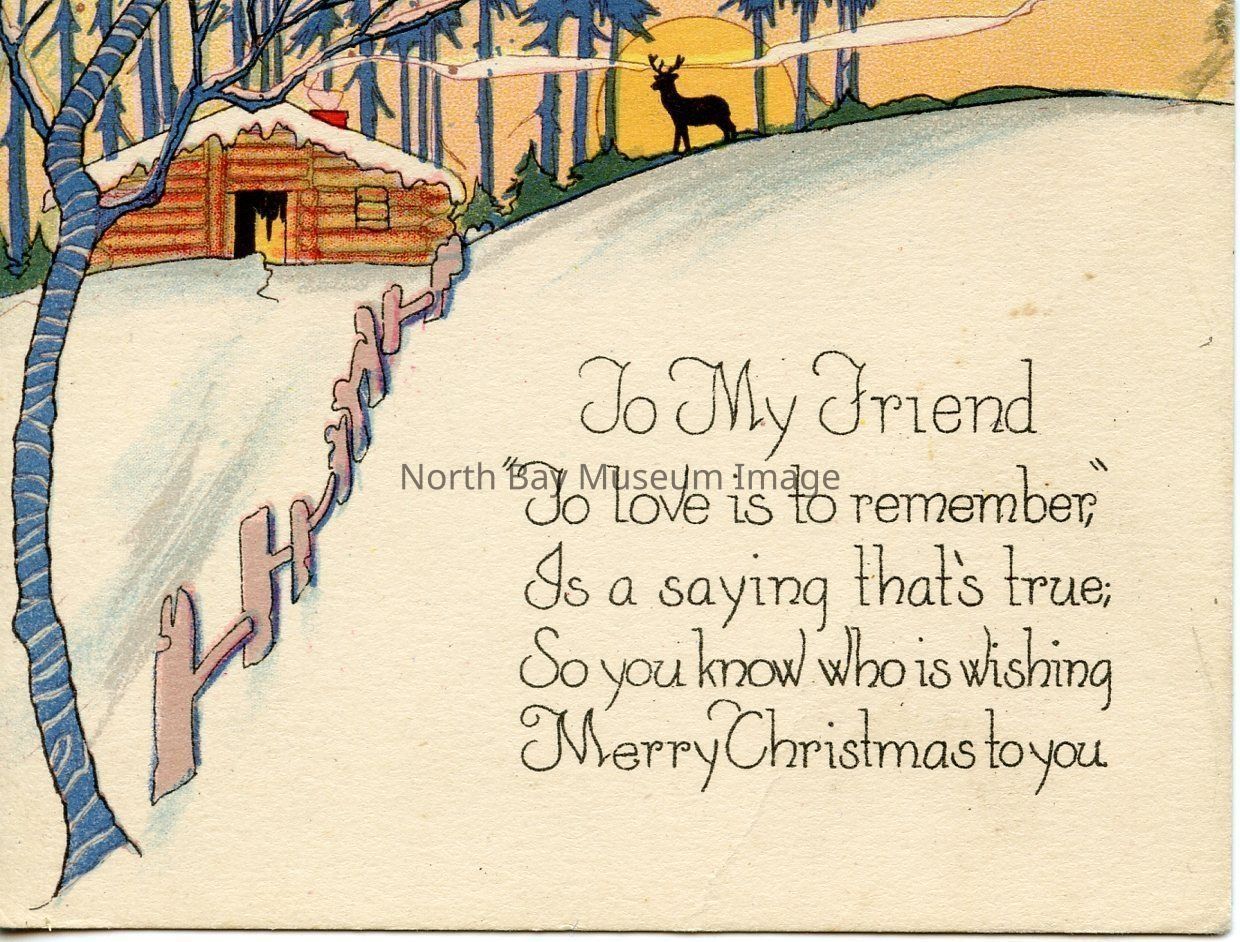 This is a coloured postcard. The postcard is beige, but a majority of the card is white. The card has a picture of a winter's day scene. There is a image of smoke coming from chimney of snow covered roof of a log cabin. The cabin is sitting amongst tall pine trees, on a hill covered with snow. A reindeer can be seen in the glow of the evening sun. There is a wooden fence is running downhill to a tree, blowing in the wind.