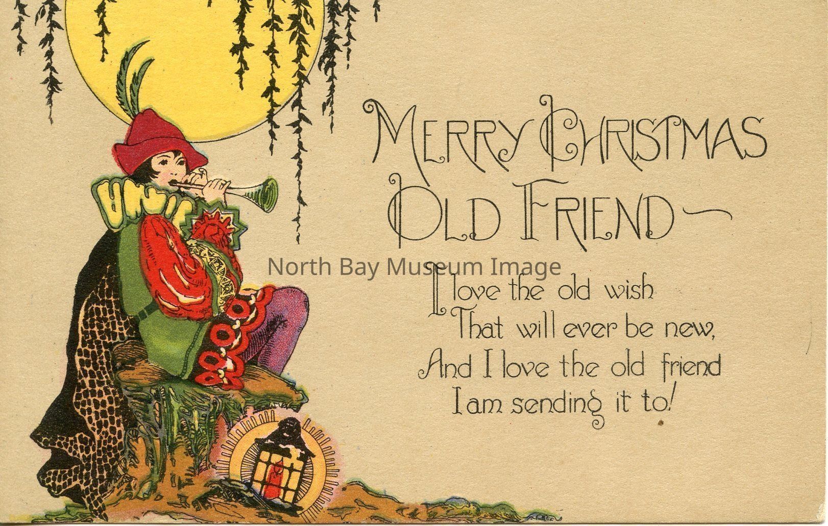 This is a coloured postcard. There is an image of a young trumpet playing boy dressed in a yellow and green costume. He is playing the trumpet sitting on tree stump. There is a lantern at his feet. The full yellow moon, with moss hanging over it, is at the top of the card. On right hand side of card is printed, "Merry Christmas old friend! Love the old wish that will ever be new. And I love the old friend that I am sending it to."