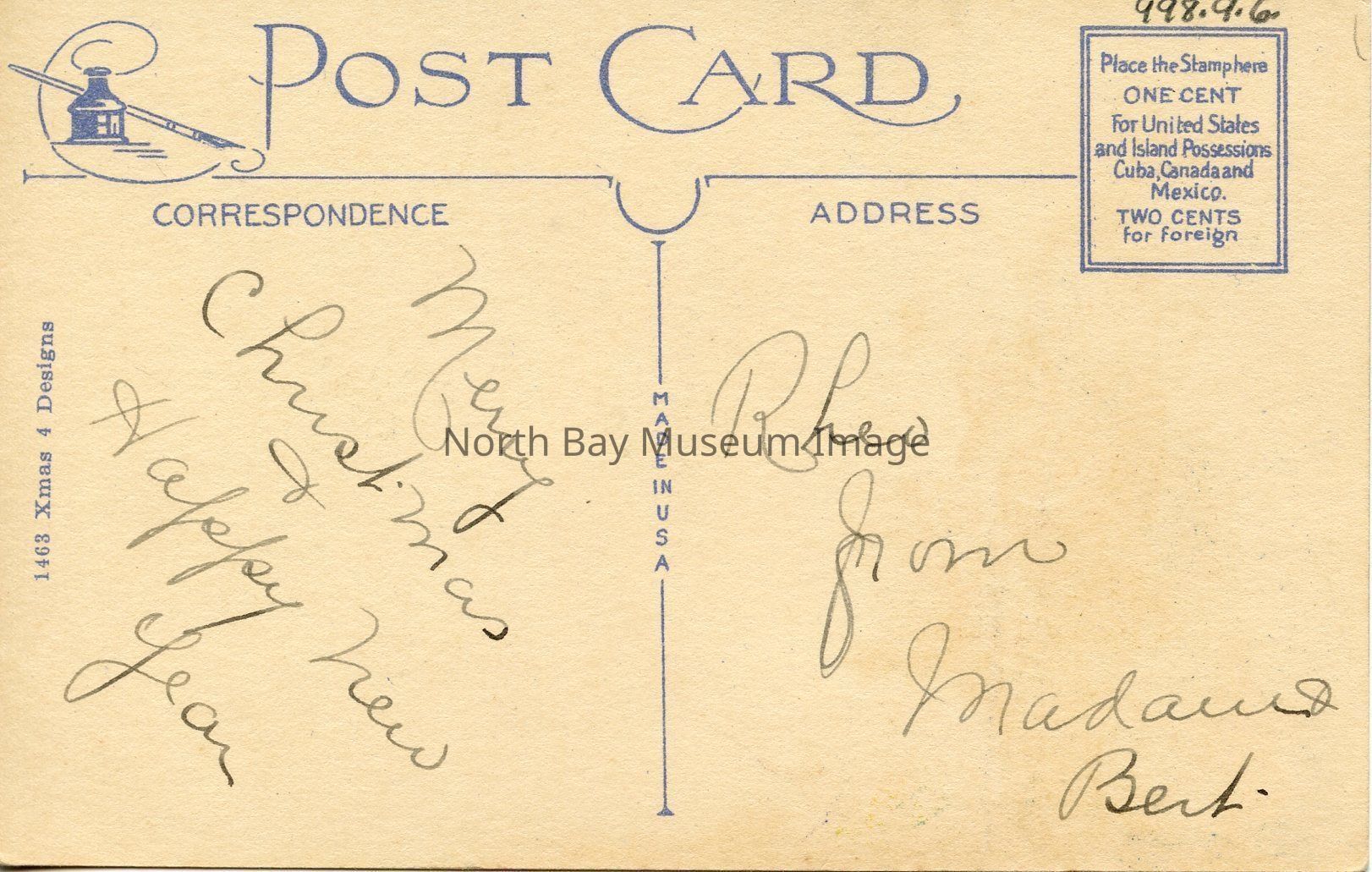The back of the postcard has a handwritten pencil address and message. This postcard appears to not have been sent via mail.