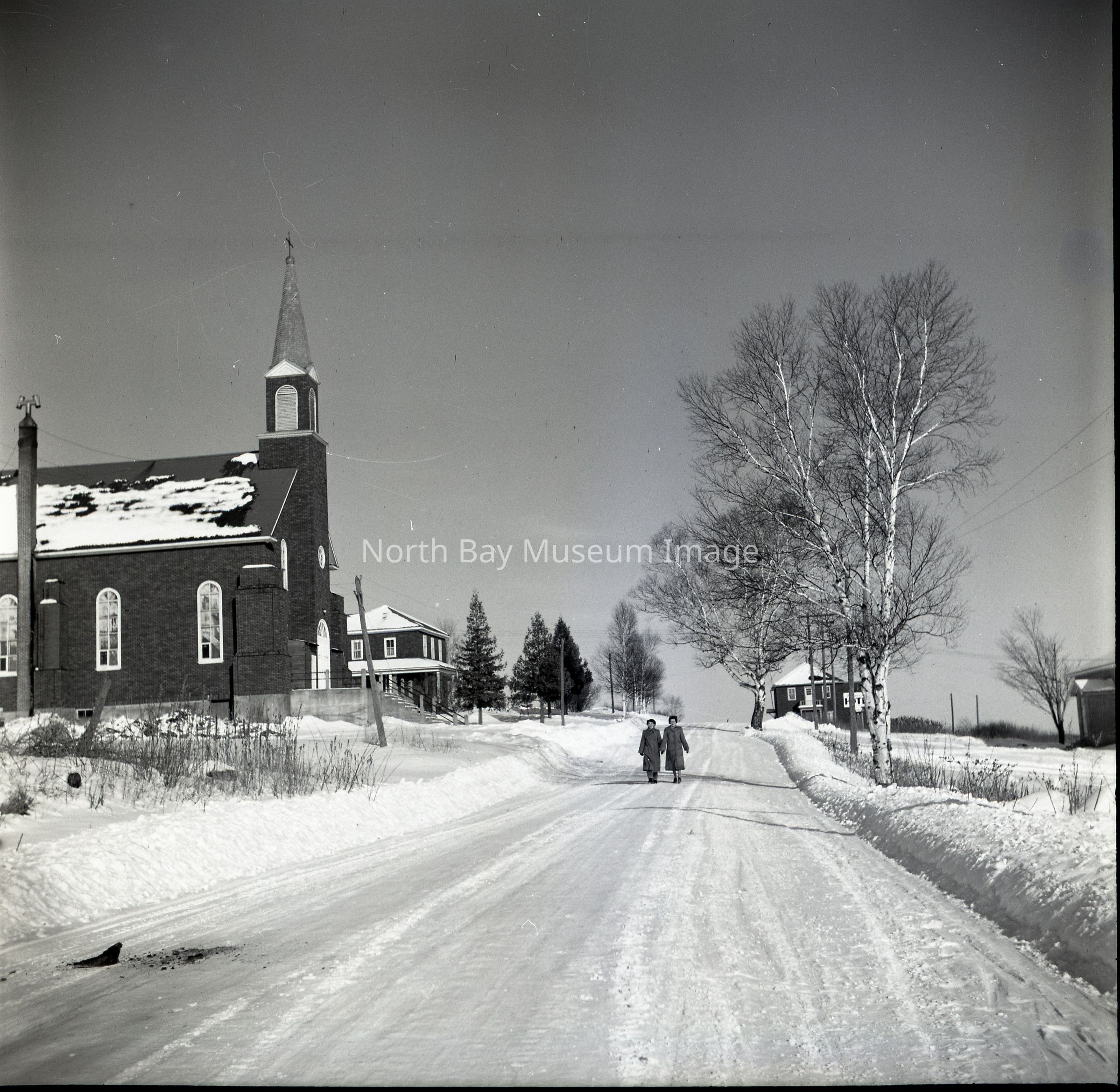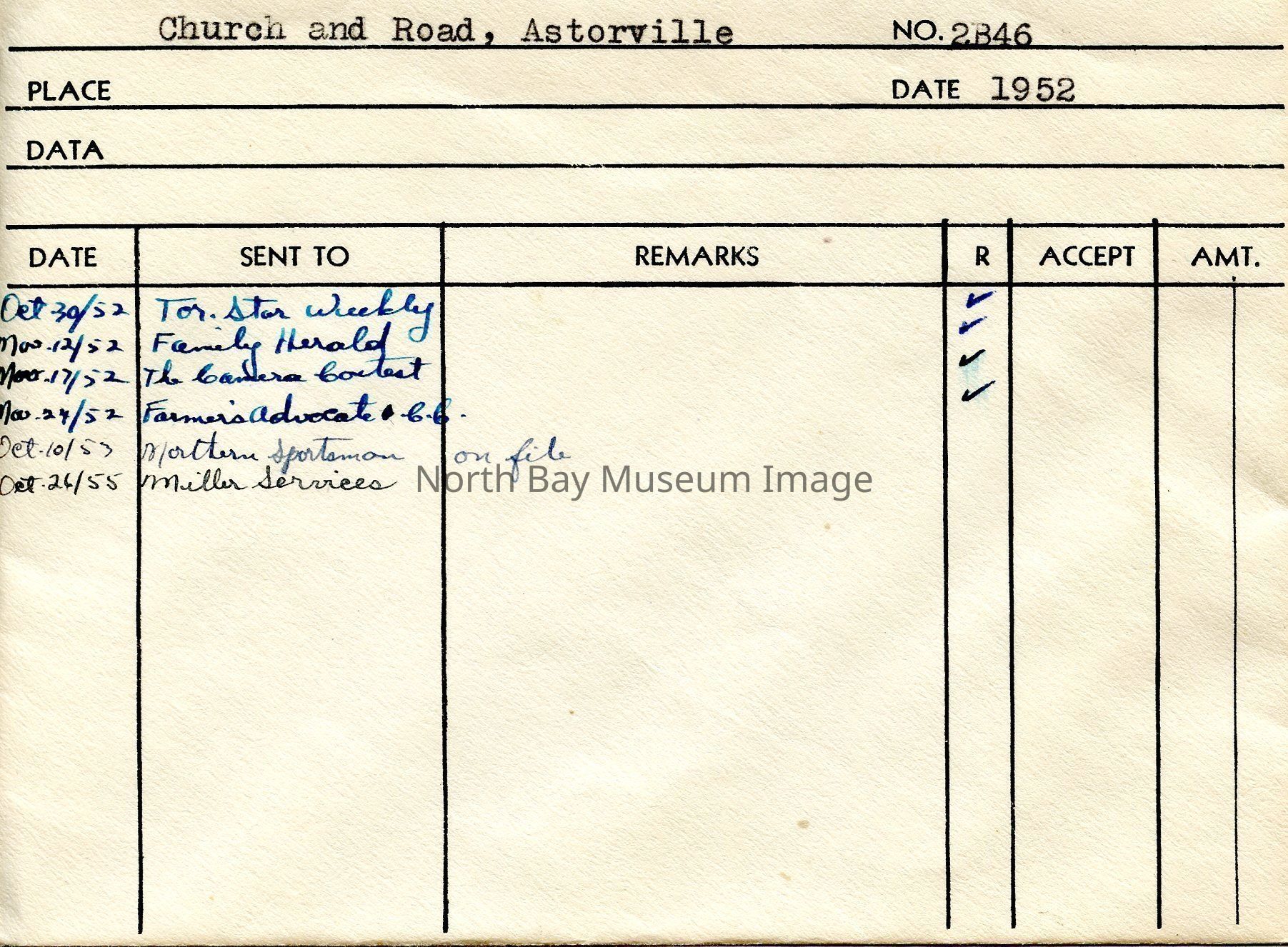 Photographer's original envelope (a) containing photograph and negative (b-c) of a church in Astorville. The image shows a image of two individuals walking in the snow down a road, who are just passing a church on their left. A part of the Forder Collection. The photographers original number is 2B46. All of the photographs publications are listed on the the envelope.Creator