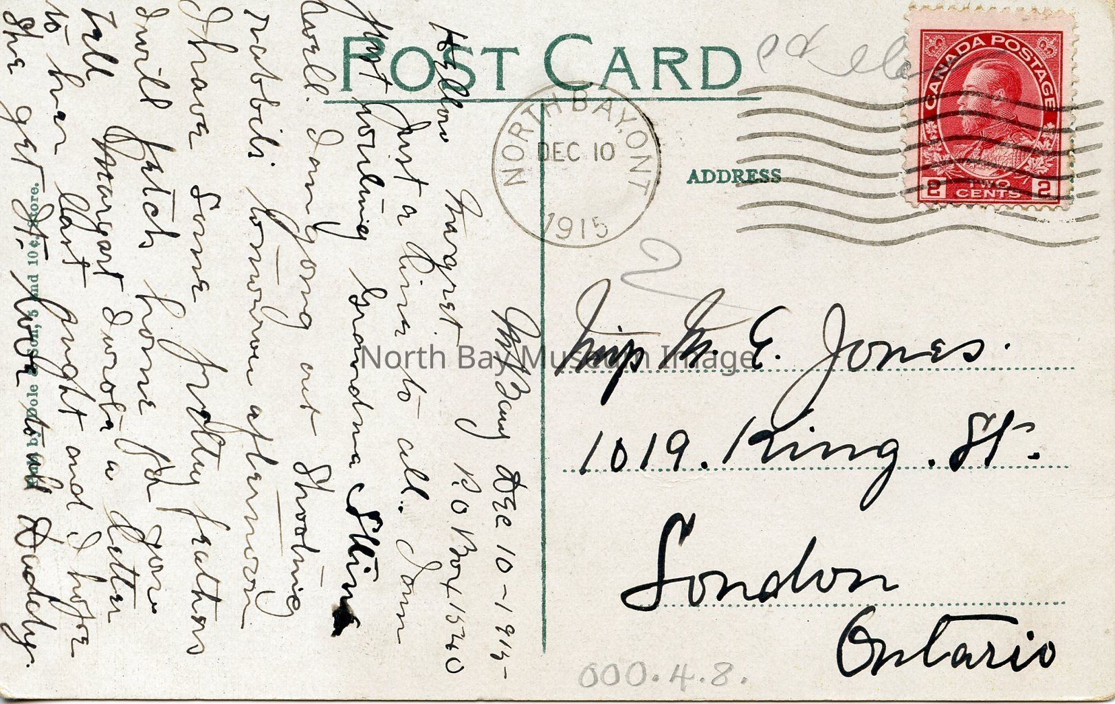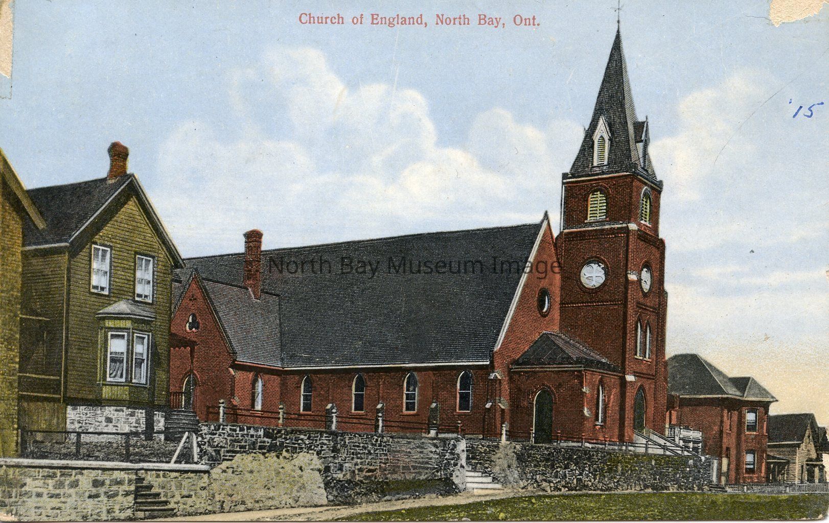This is a coloured postcard with a print of the Church of England in North Bay, Ont. This church is located on Main & Sherbrooke St's. The church is made of red brick with a stone wall across the front. There is a bell tower at the side rises above the steep roof. residential homes can be seen on each side of the church.