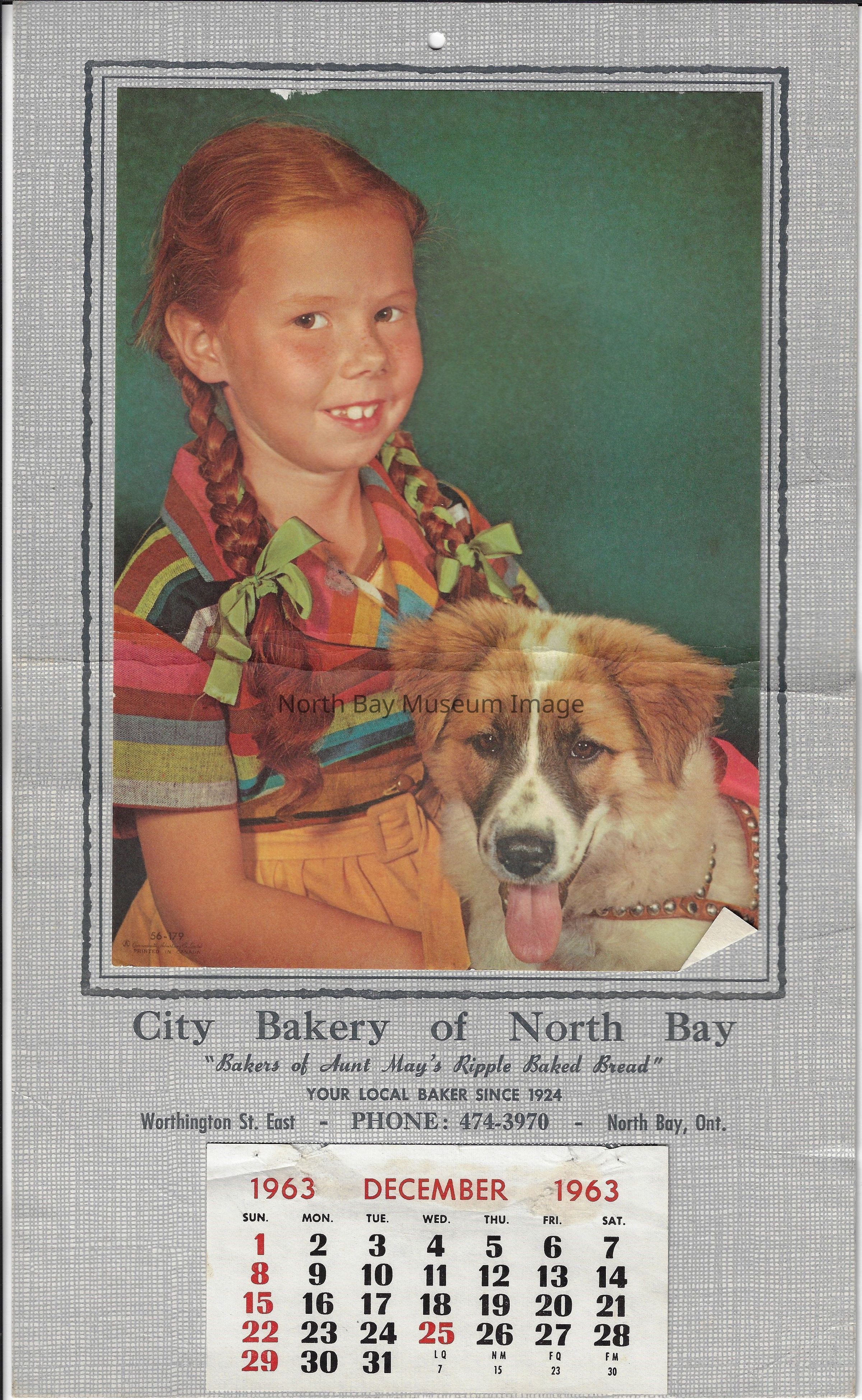 1964 City Bakery Calendar with picture of gitl and dog and tear off pages. All pages have been torn off except December . Text reads "City Bakery of North Bay 'Bakers of Aun May's Ripple Baked Bread Your Local Bakery Since 1924 Worthington Street East Phone 474-3970 North Bay ON"