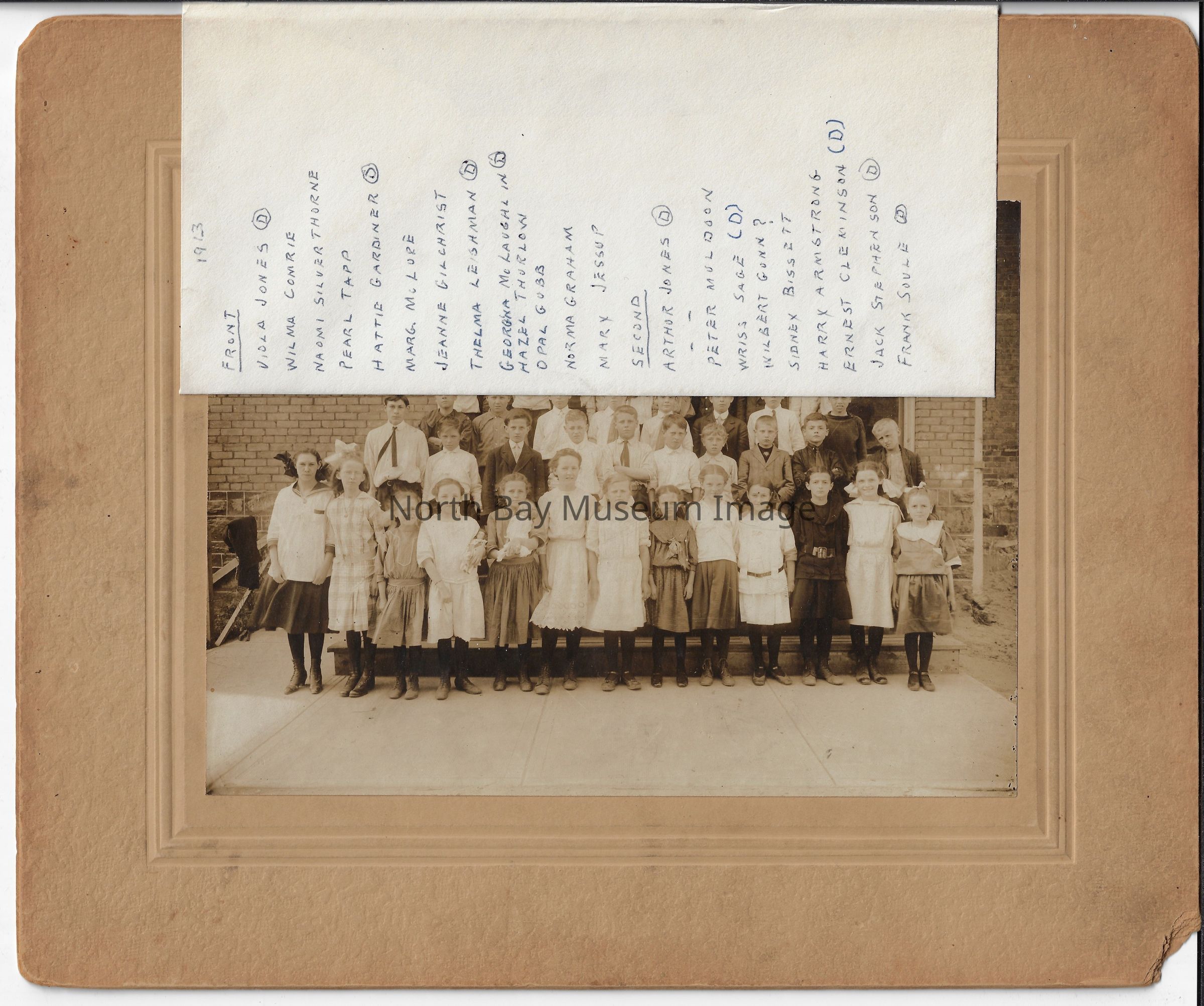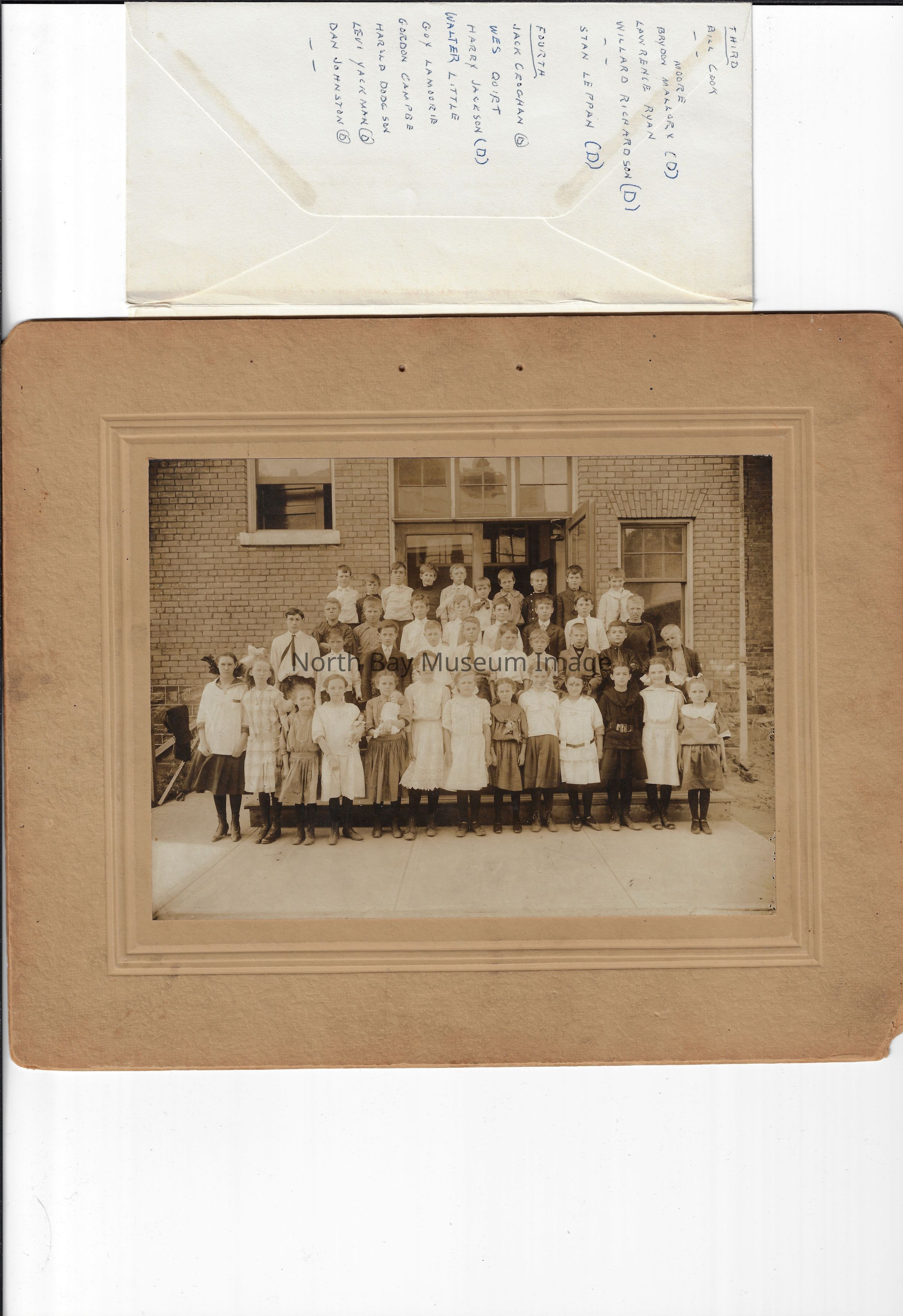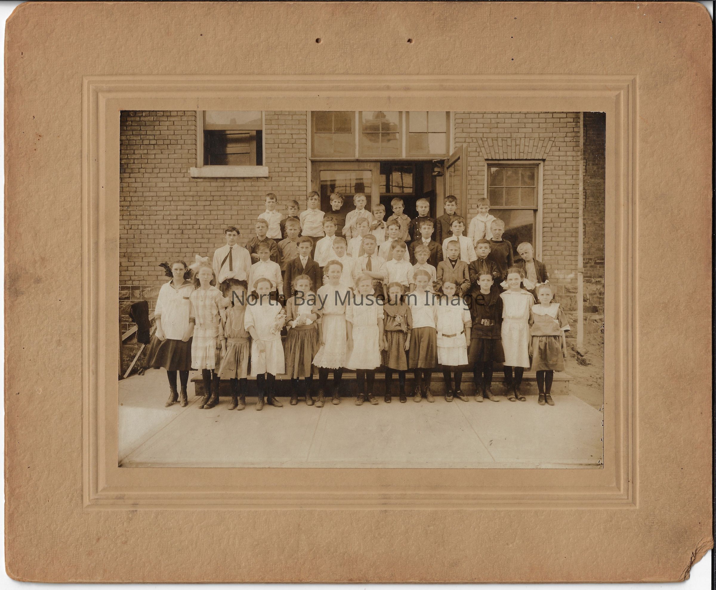 The image is sepia toned, and depicts 4 rows of children posing infront of a school entrance. The photograph is glued to a thicker matt board, which has yellowed over time. The bottom right corner of the matt appears to have some damage.
