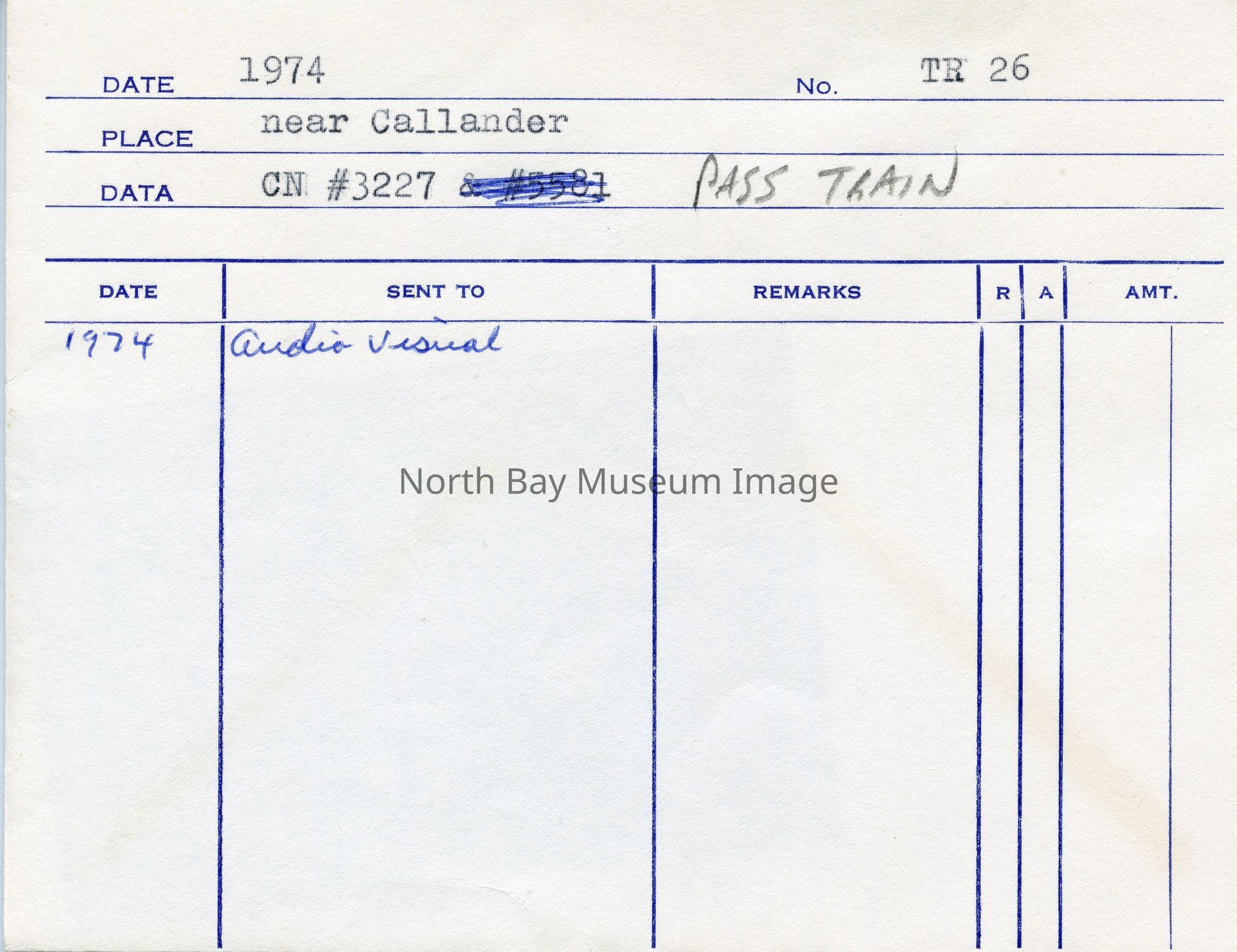 Inscriptions: "1974", "TR26", "near Callander", "CN #3227", "Pass Train". Forder put the item(s) in this envelope, so contents have original order.