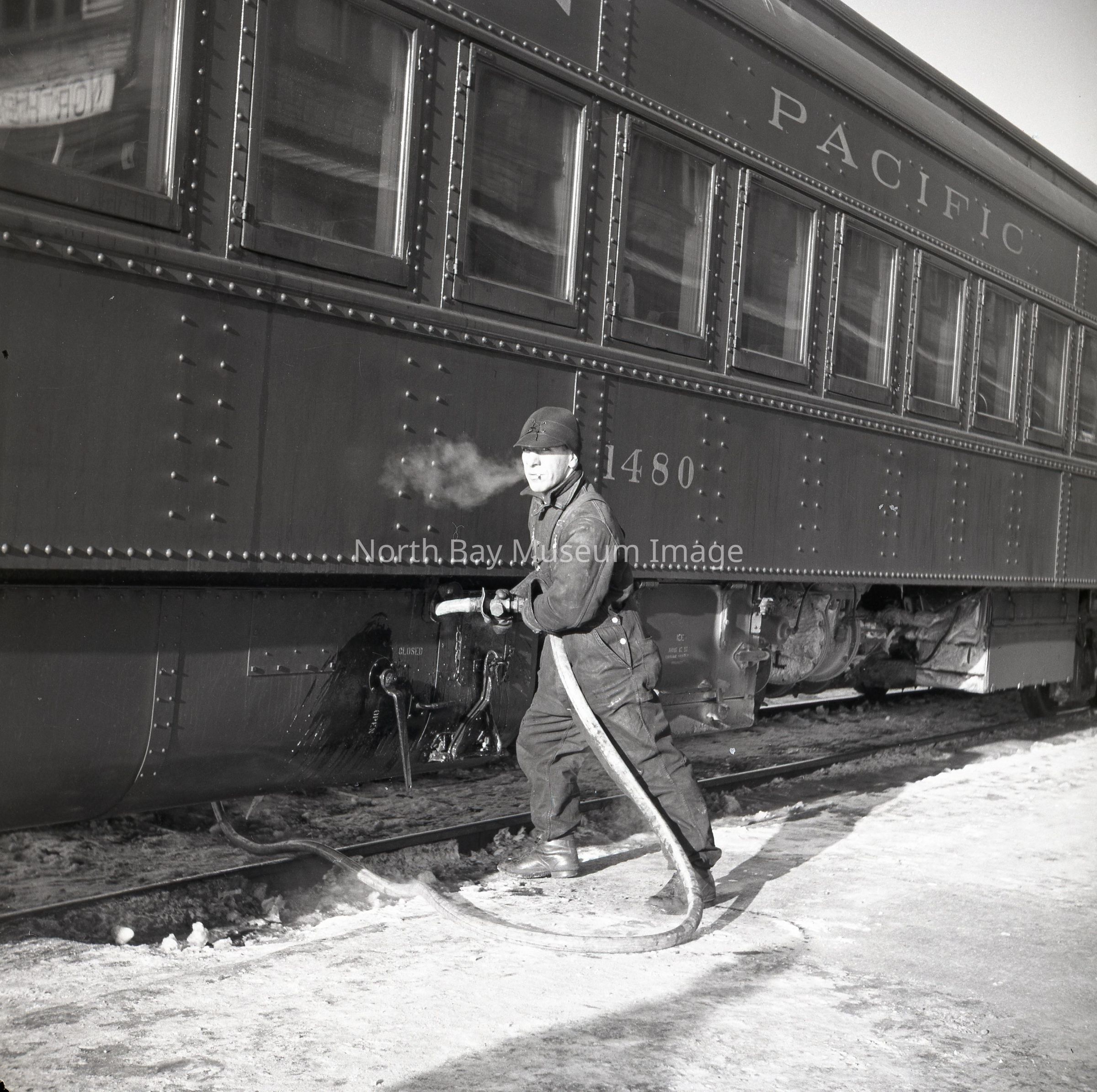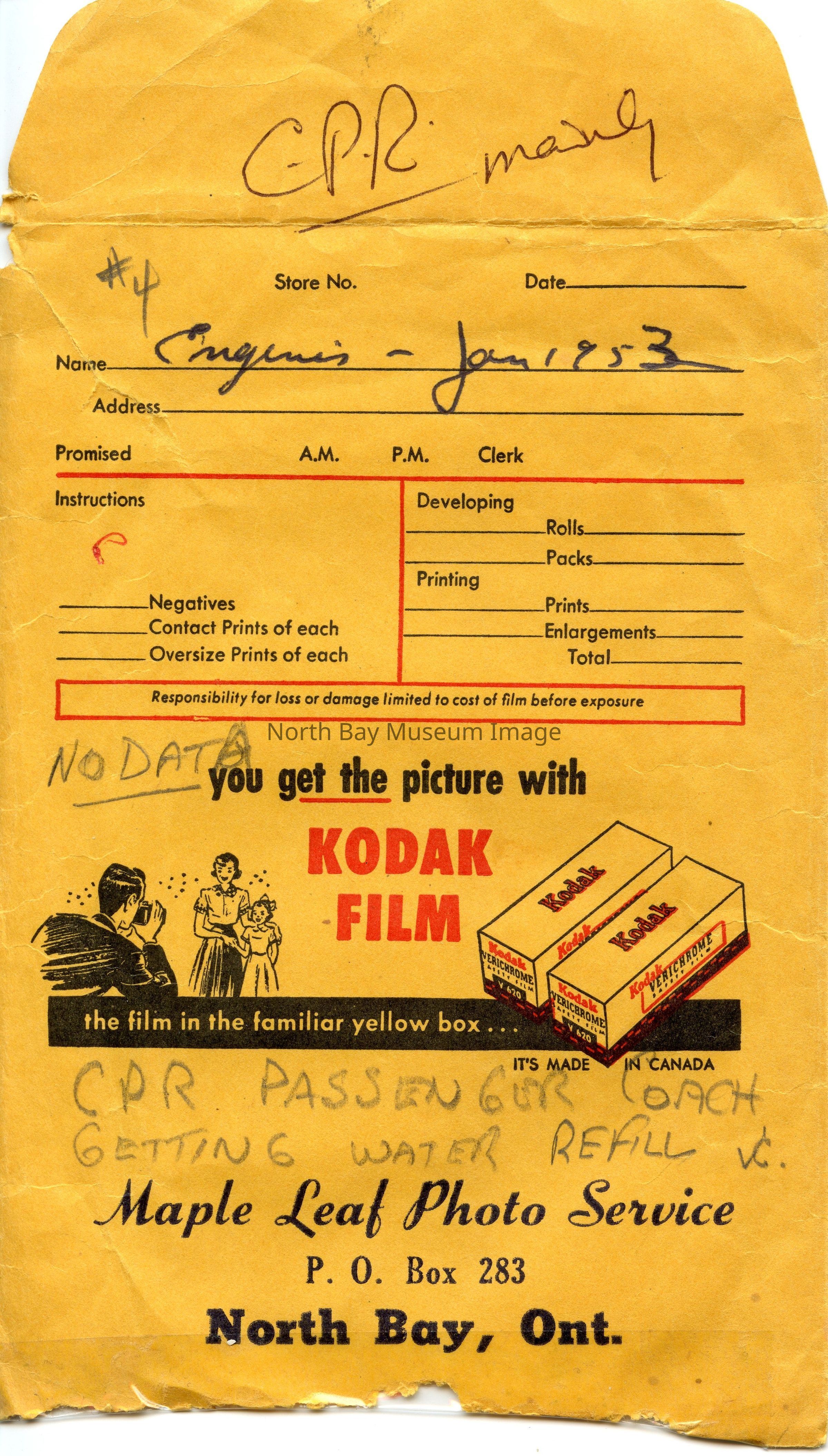 (a) is a yellow photograph Envelope. The envelope is Kodak Film. The photos appear to be developed at "Maple Leaf Photo Service" in North Bay. (b) is a Negative. of a CP. Steam coach # 1480. This is a Water Fill Up, Jan. 1953. (b) is a photo of a man beside the steam coach. He appears to be holding a long hose to the train. It appears to be winter in this photo.Creator