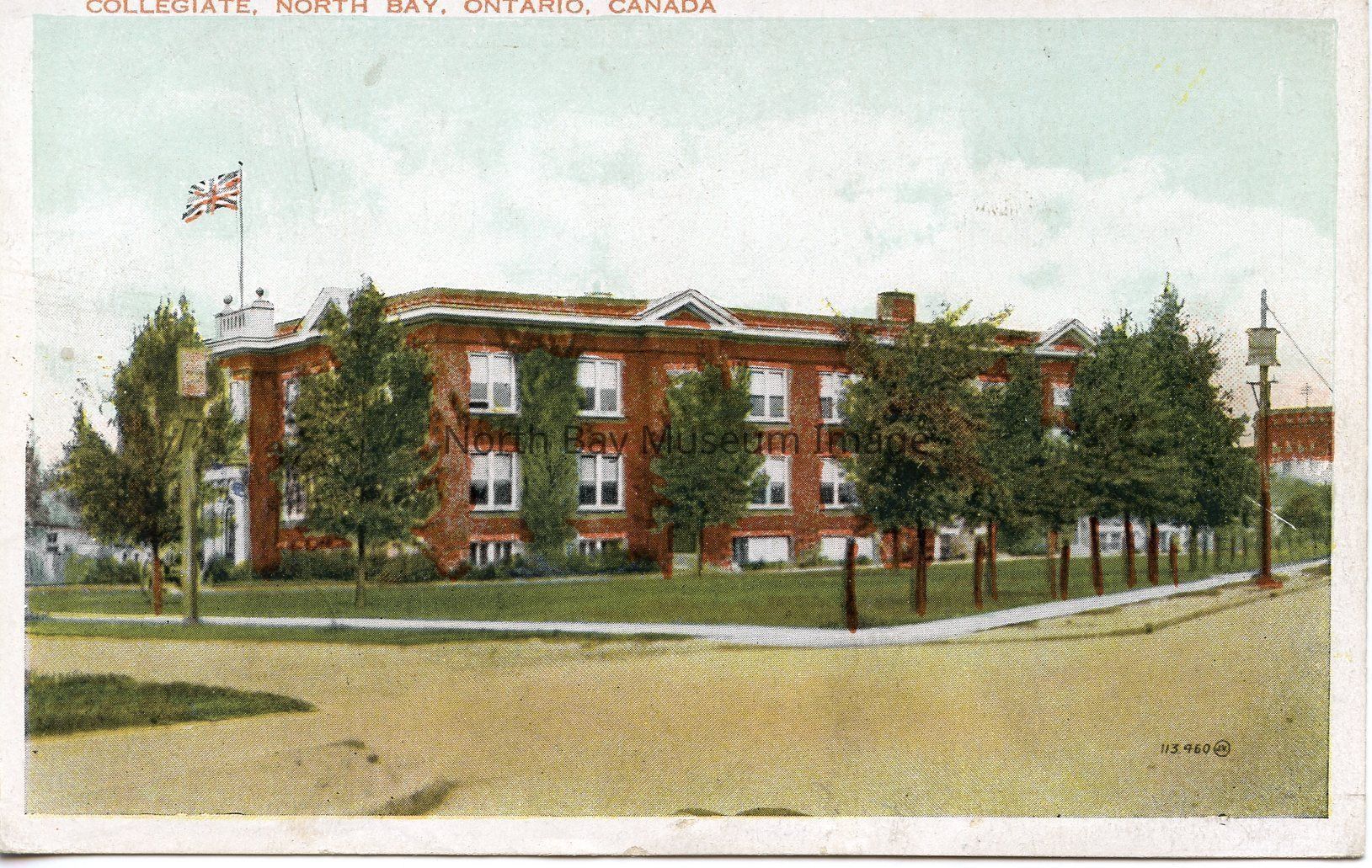 Postcard of the Collegiate Institute in North Bay, ON. The postcard is a coloured photo of the institute from the side, there is sand on the ground, and well groomed trees in fron the of the building. There appears to be a flag pole flying the Union Jack.