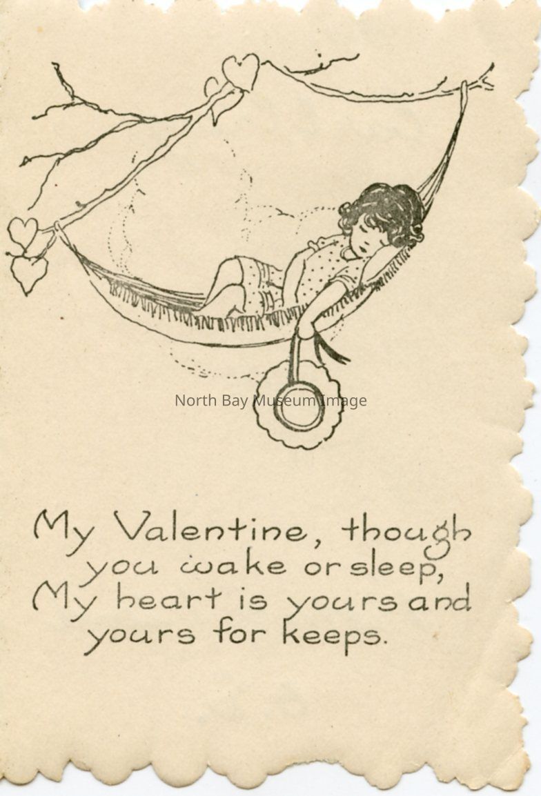 The cover of the card is a green pink cover with a little boy and girl on the front with 'Valentines Greeting for you' written at the bottom of the card. The inscription inside the card says, "My Valentine though you wake or sleep, my heart is yours for keeps", Whitney Made, Worcester Mass., made in U.S.A. The card also has a illustrattion of a little girl sleeping in a hammock holding a hat from her hand.