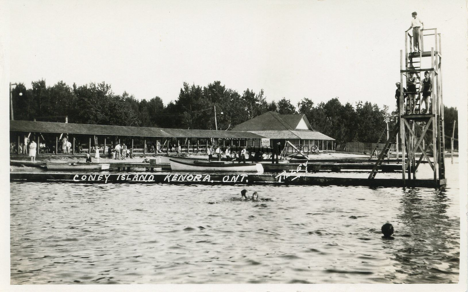 This Black and White postcard is of Coney Island Kenora, Ontario. The image shows a boathouse, and water. There are children playing in the lake and swimming. In the right side of the picture you can see children climbing up onto a diving board to jump off into the water.
