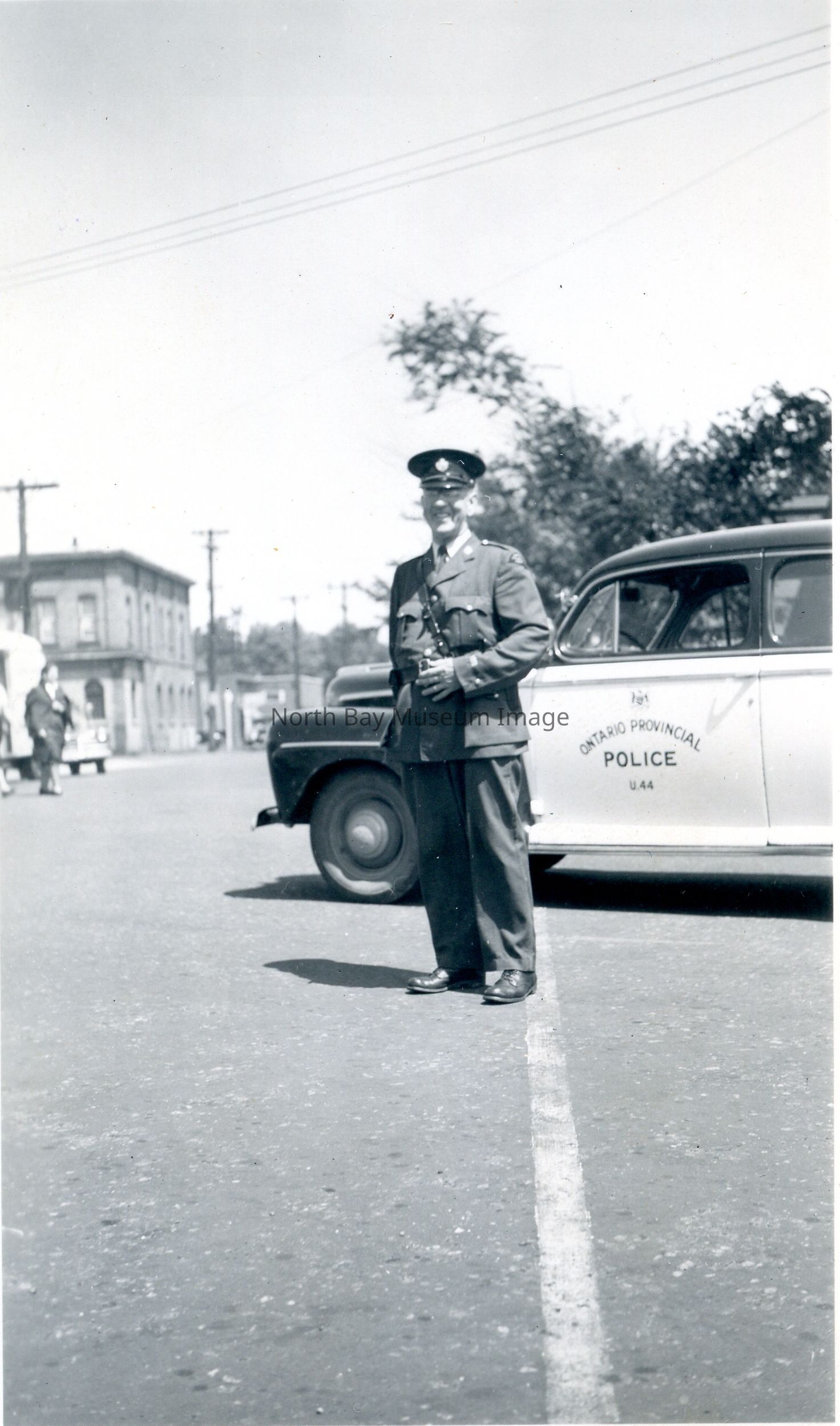 Photgraph of OPP Constable G. Porter on Algonquin Avenue in North Bay standing in front of his car. Part of Muldoon photo collection.