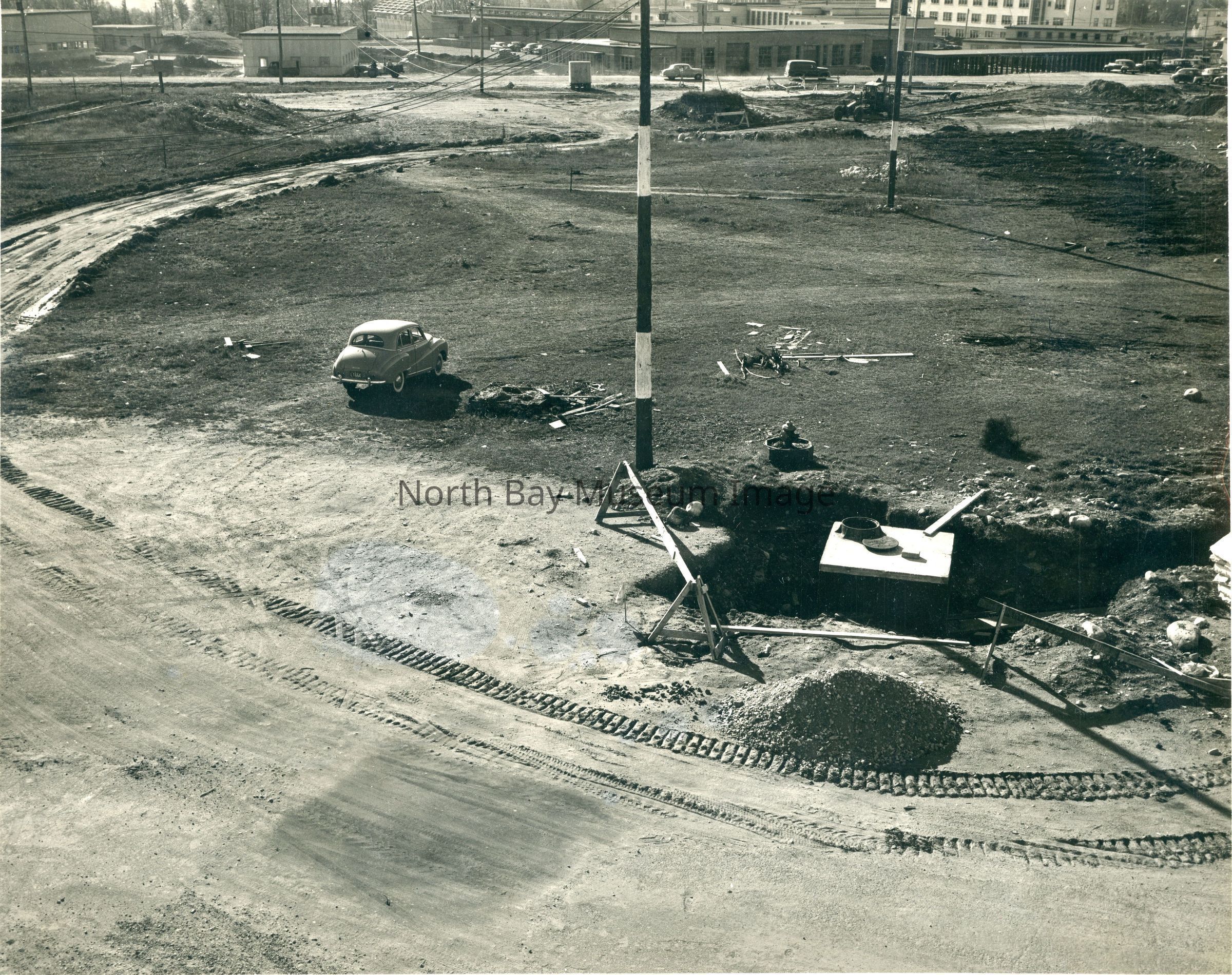 Black & white photo of construction work going on at North Bay airport.