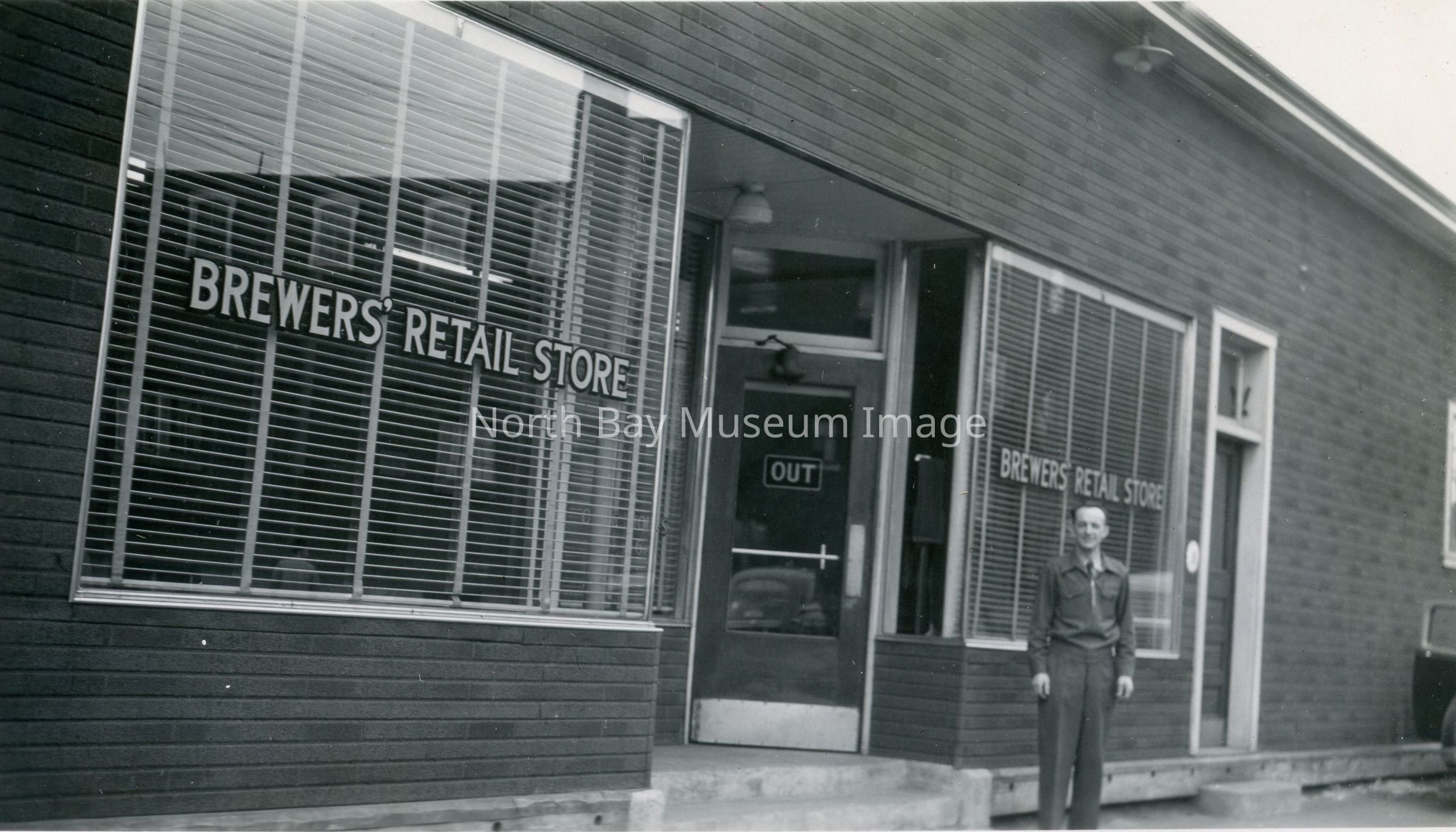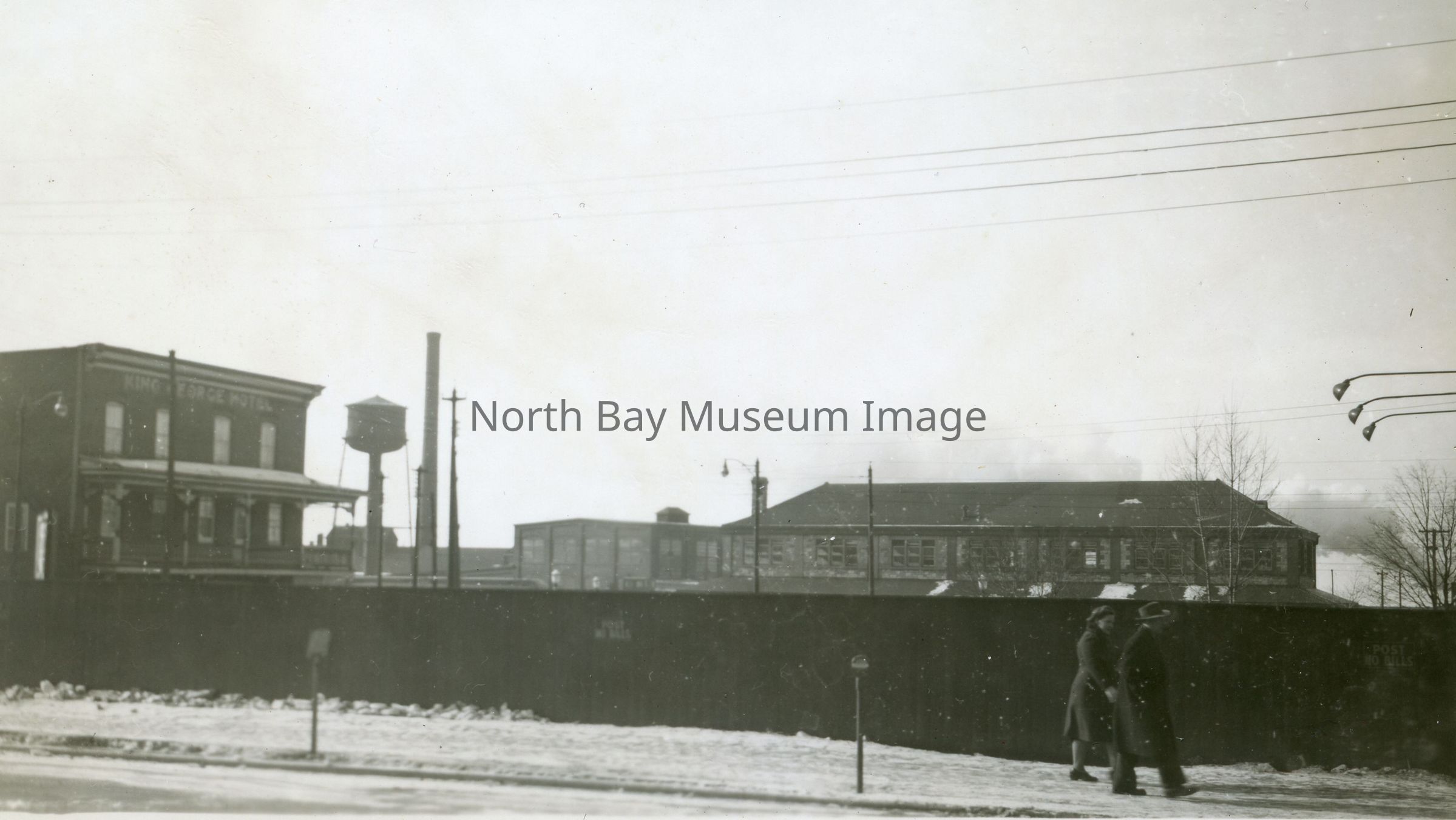 Photograph (a) shows King George Hotel (previously Winnipeg hotel), CPR Shops, and Station behind gate (taken from Main Street) with two people walking by. The CPR station is clearly visible from Main Street because this photo was taken after the Mackey House Block fire and before the area was rebuilt. Photograph (b) shows part of CPR Freight Shed in 1947 with man standing in front of windows that say "Brewer's Retail Store".