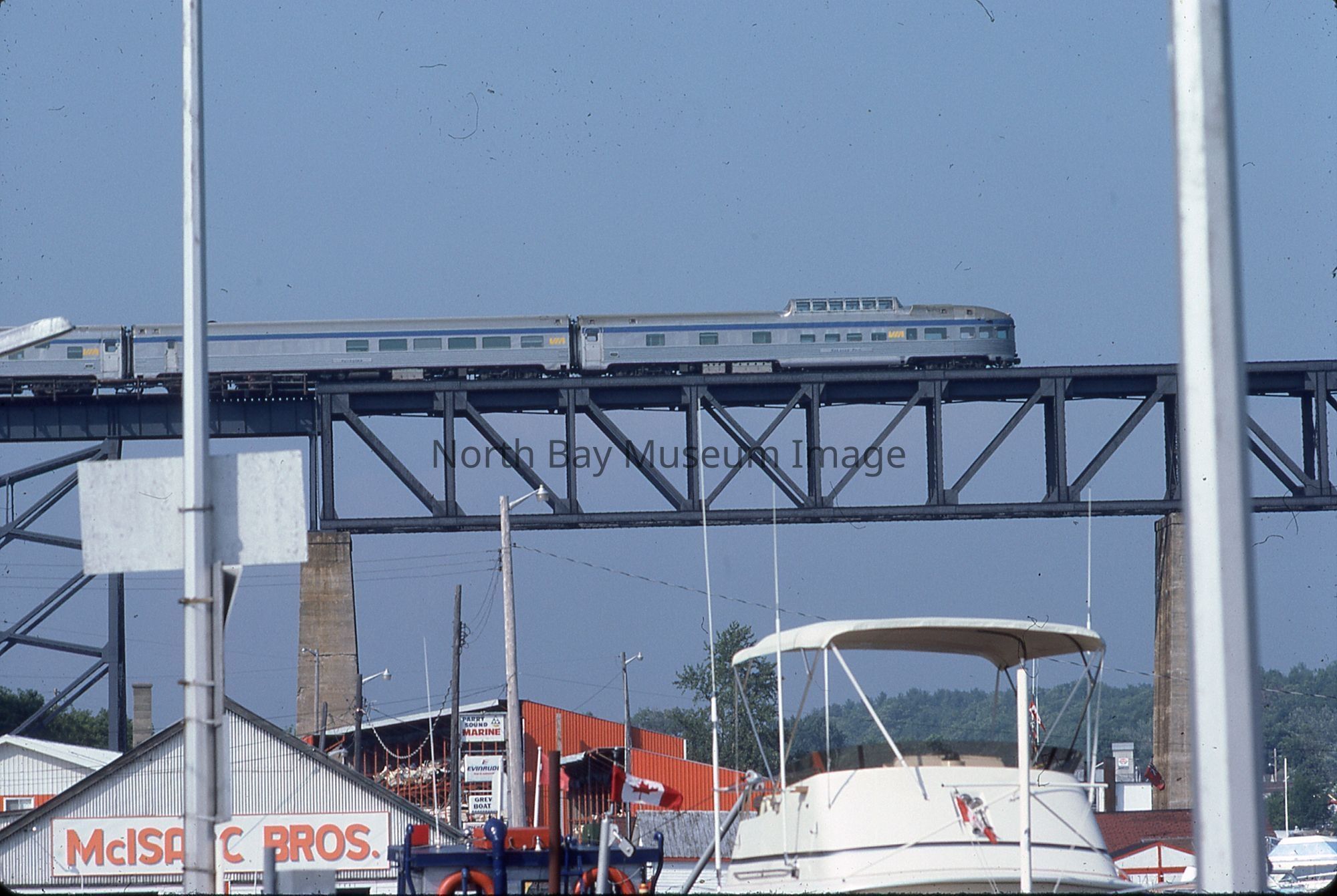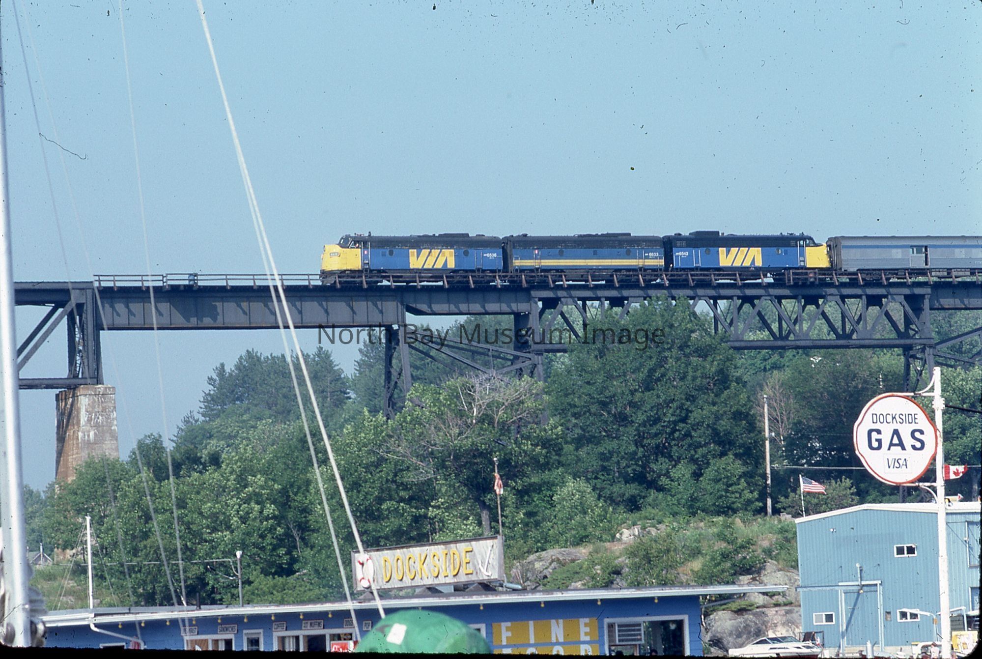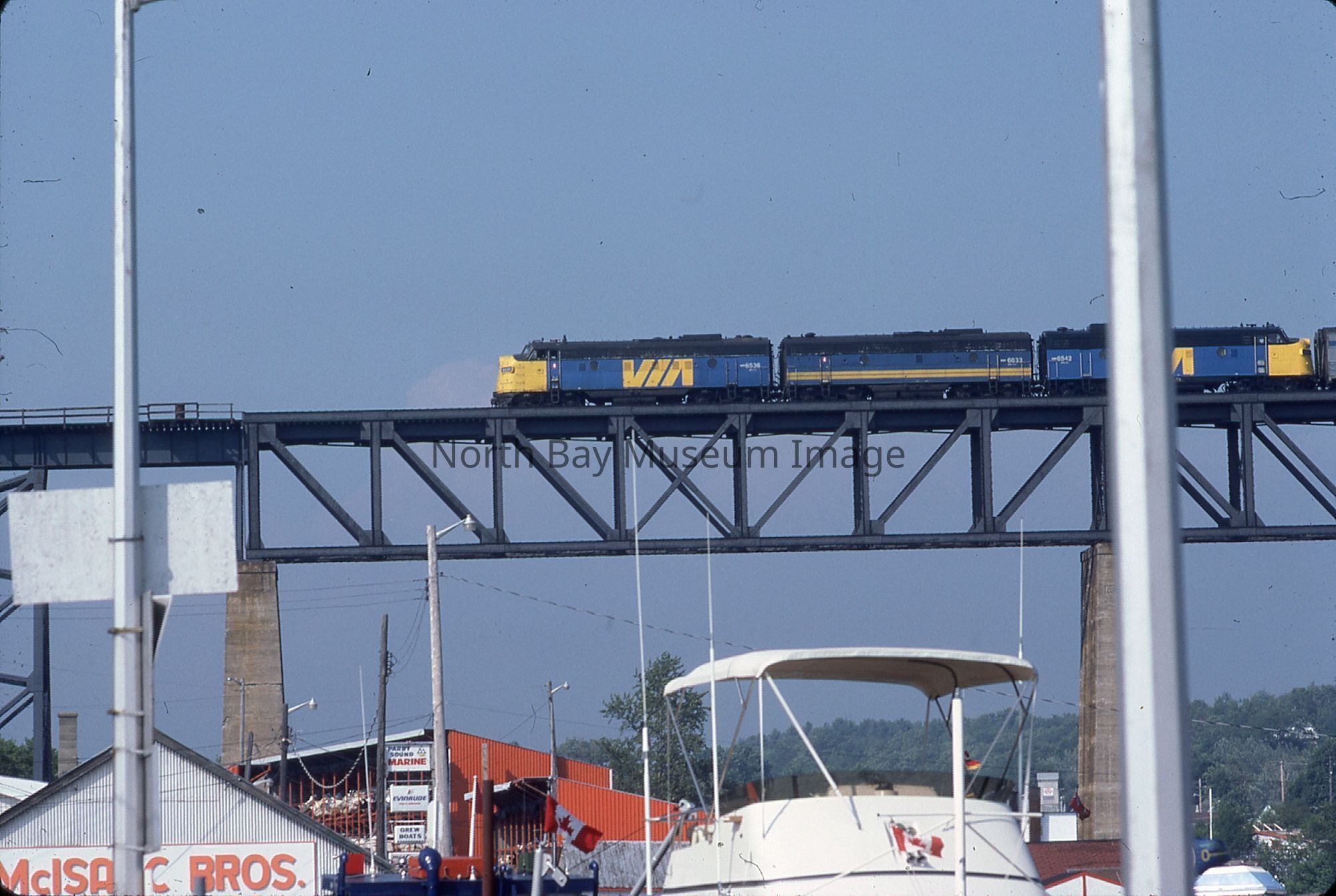 (a) (b) and (c) are photographs of the Canadian Pacific Railway (CPR) diesel "Canadian" Locomotive at Parry Sound. The locomotive appears to be driving over a bridge. These are 35 mm slides. Part of the William Forder Collection.Creator