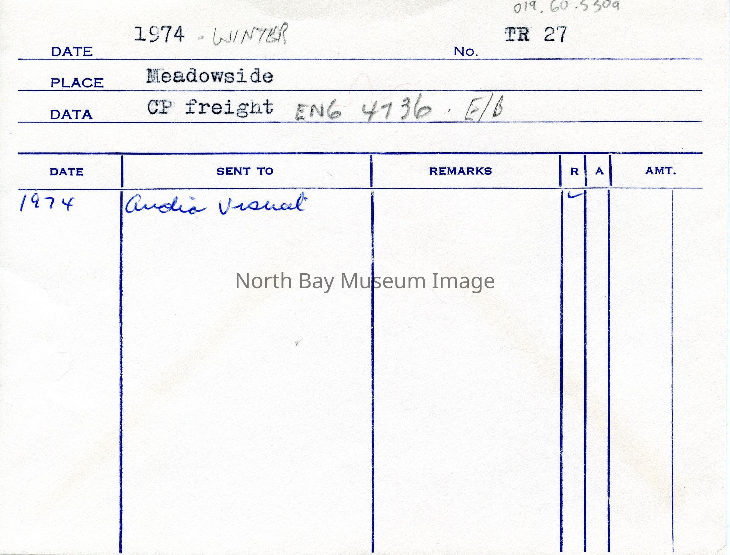 (a) is a photograph envelope. The envelope is for Canadian Pacific Railway (CPR) freight at Meadowside (engine 4736). This is the original envelope for forders photographs with the original accession/ item number TR 27. (b) is the photograph of the train travelling at Meadowside. The publications are listed on the front of the envelope. This is a part of the William Forder Collection.Creator