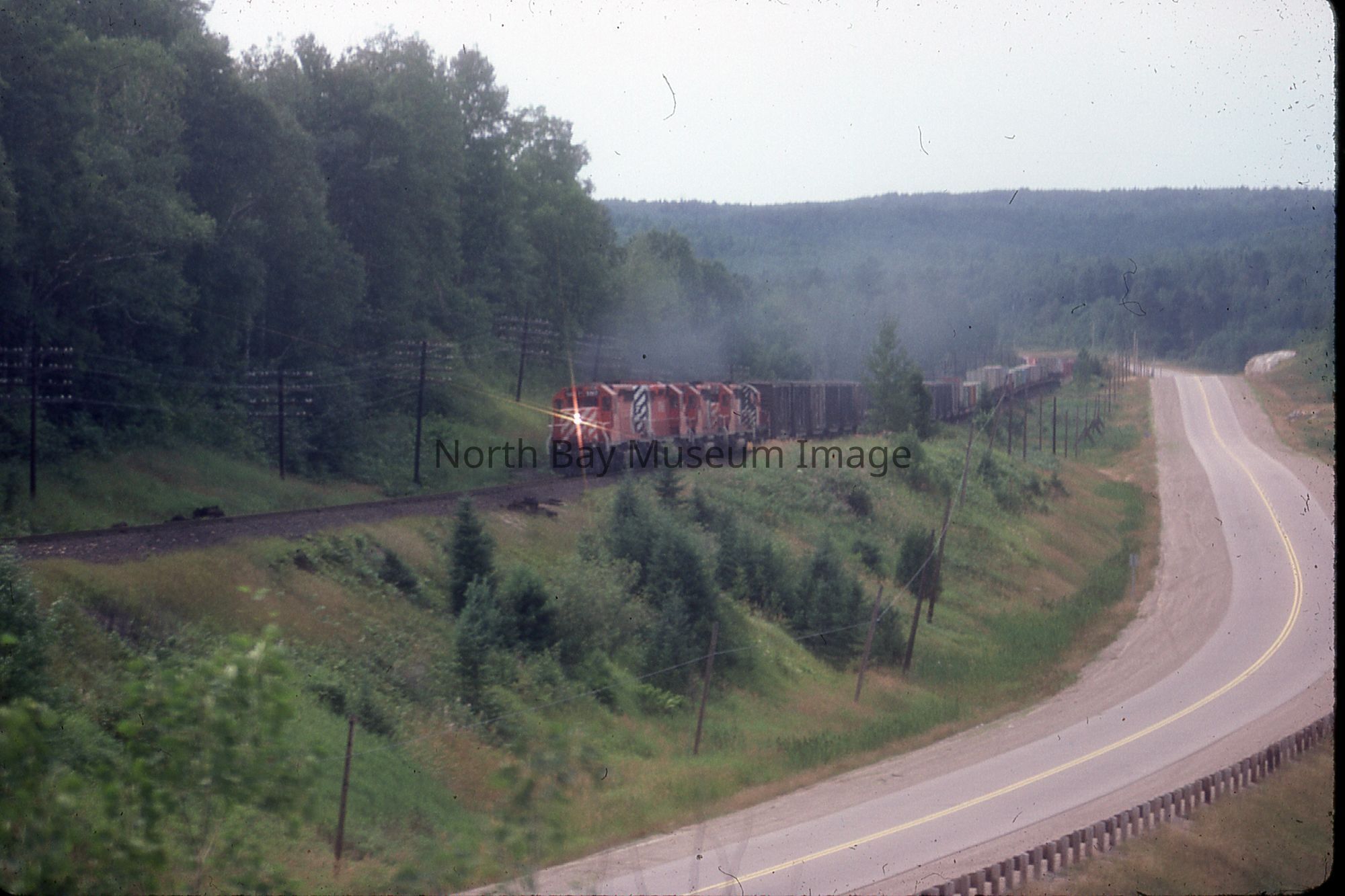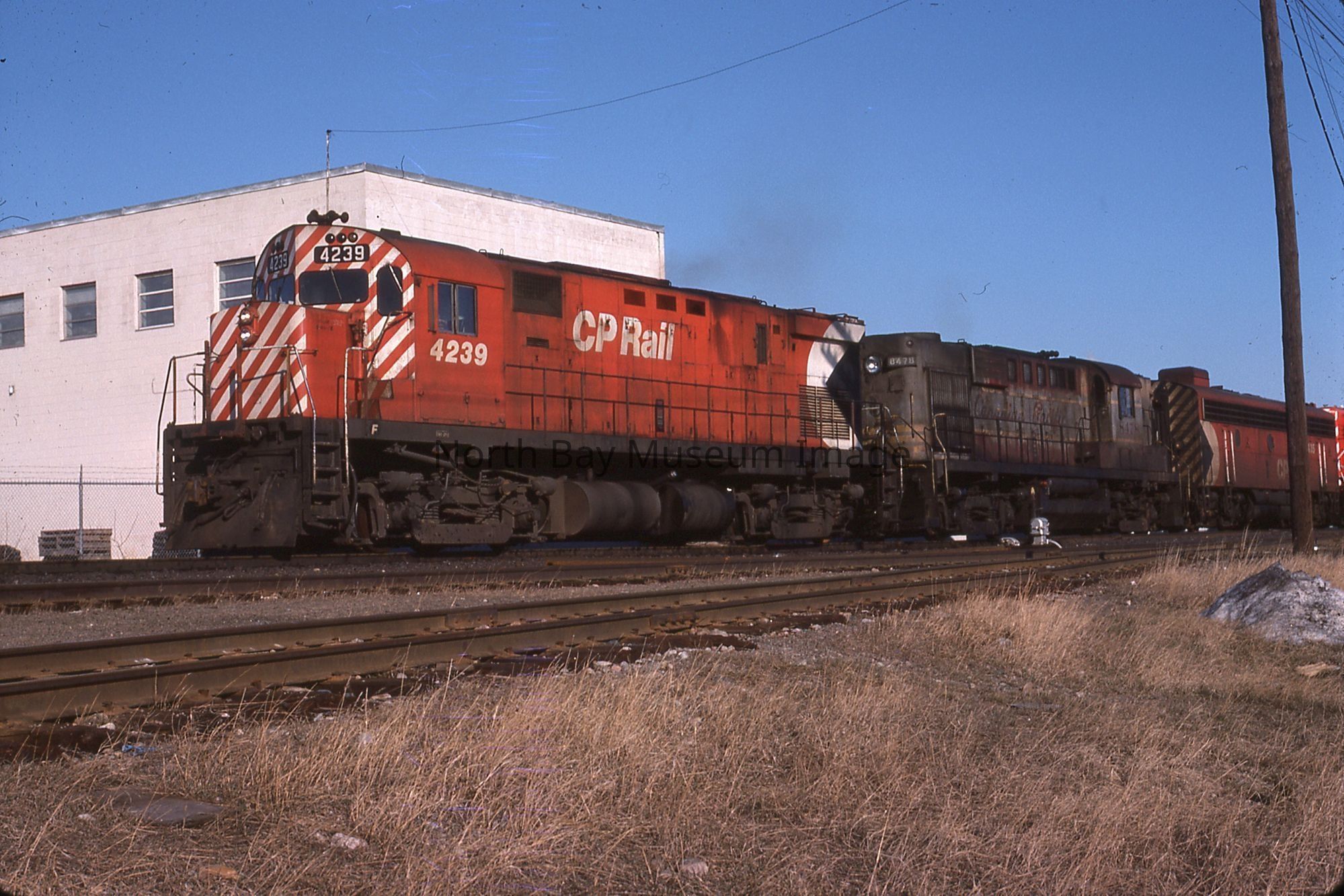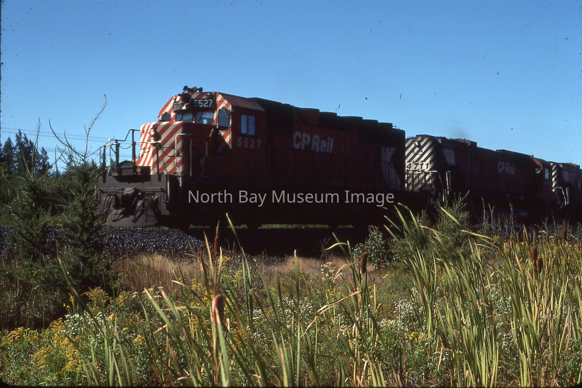 These are photographs of the Canadian Pacific Railway (CPR) diesel (they are 35mm slides). These photos are of a 5 engine freight train at L'amble du Fond. (b) was taken at Jet Ave in North Bay. These are a part of the William Forder Collection.Creator