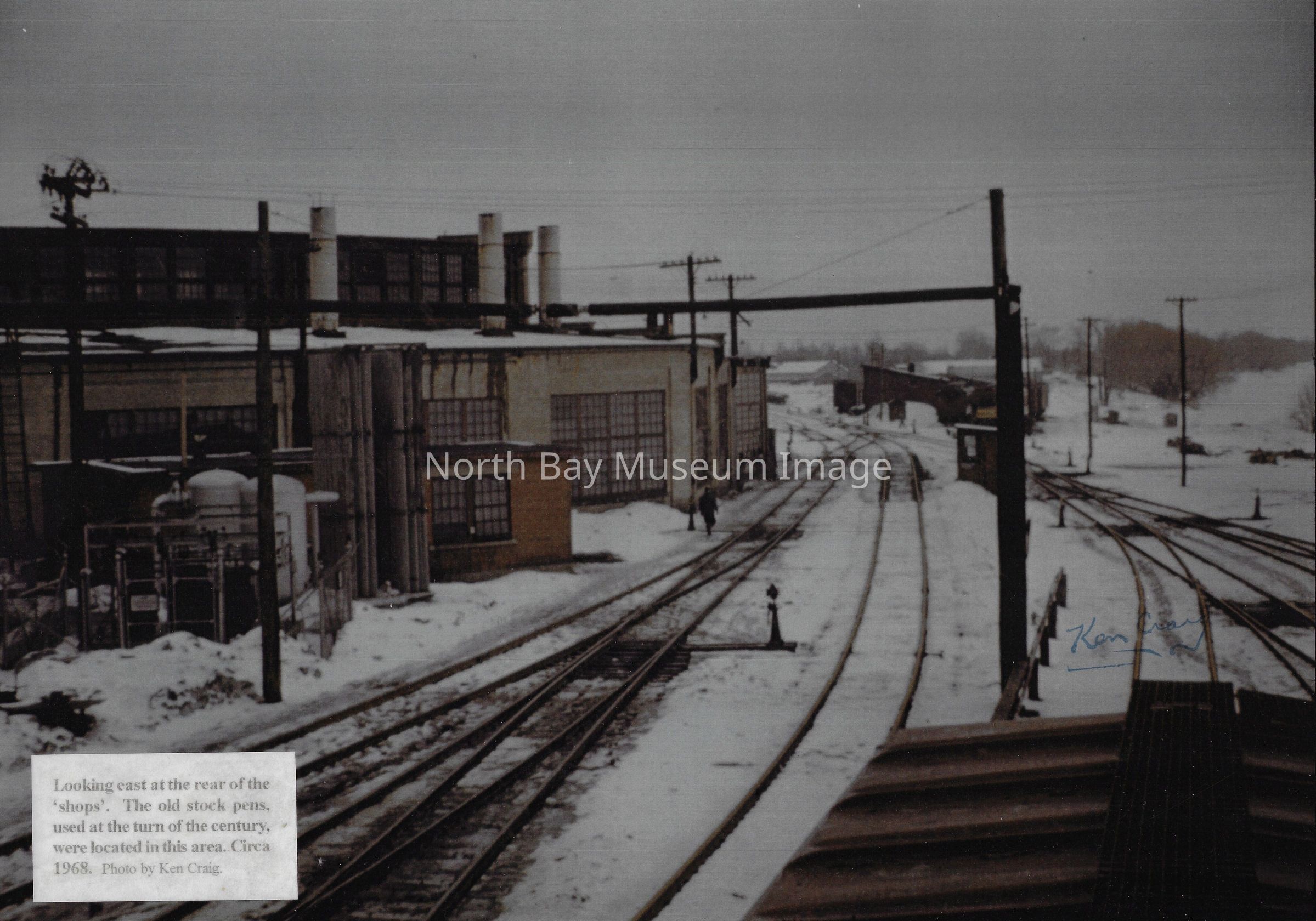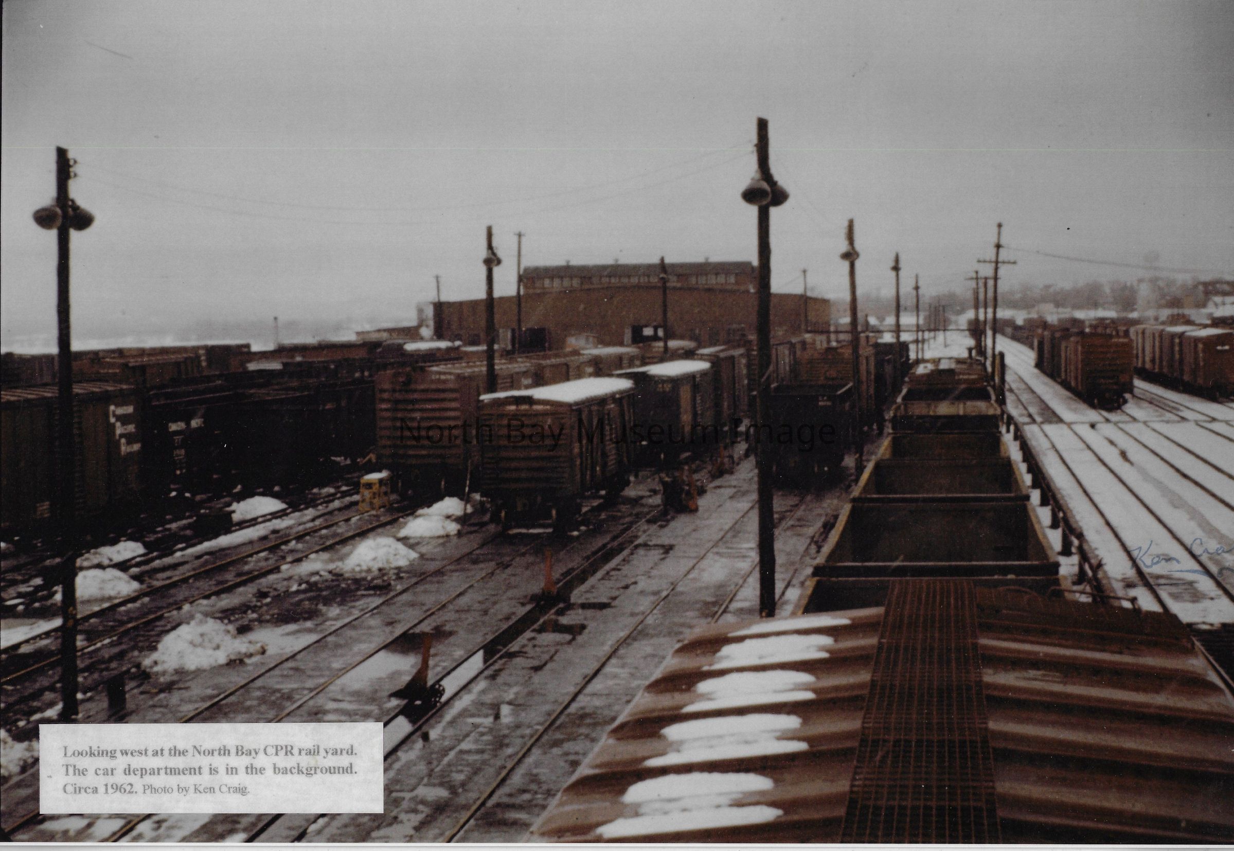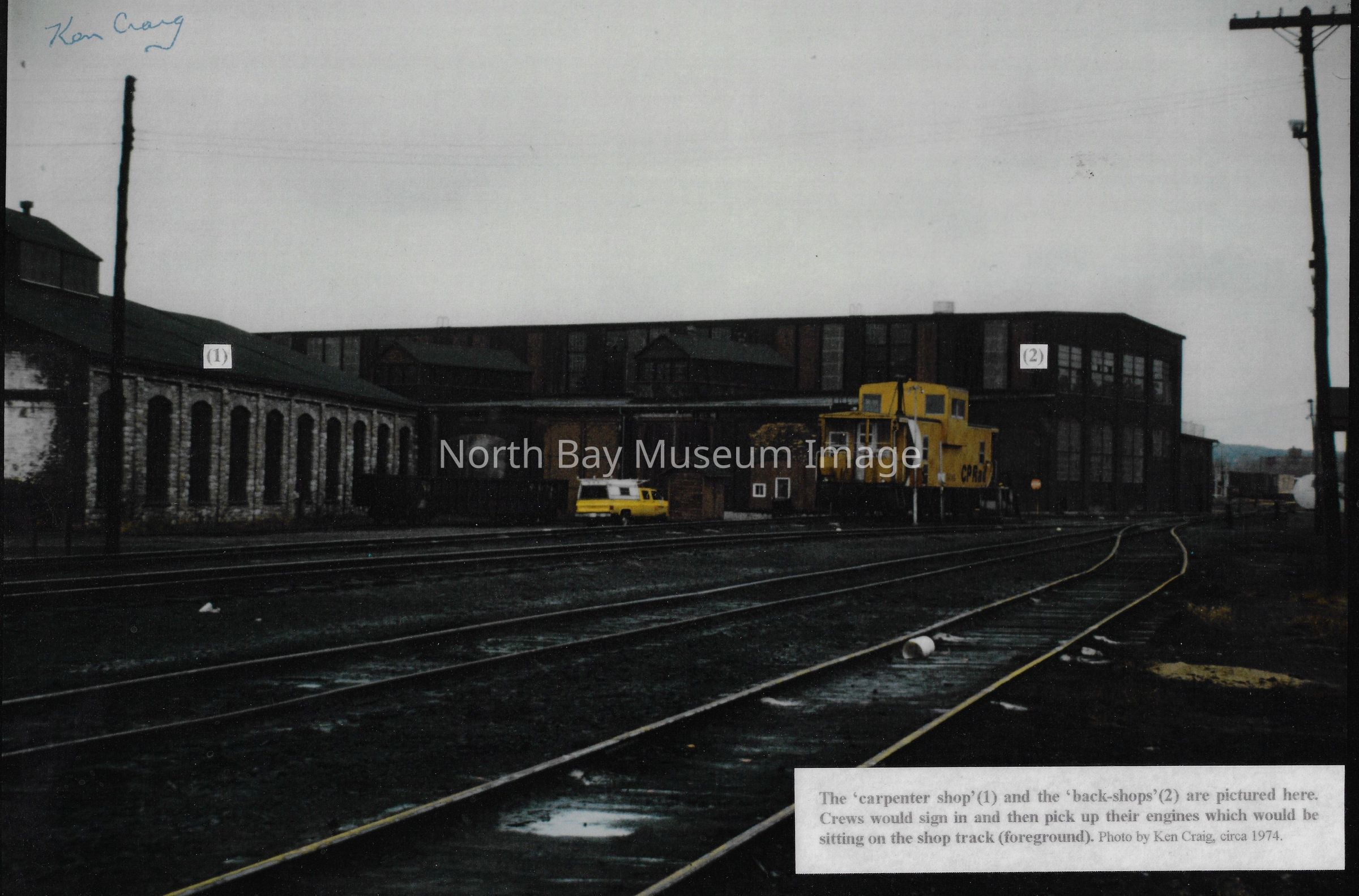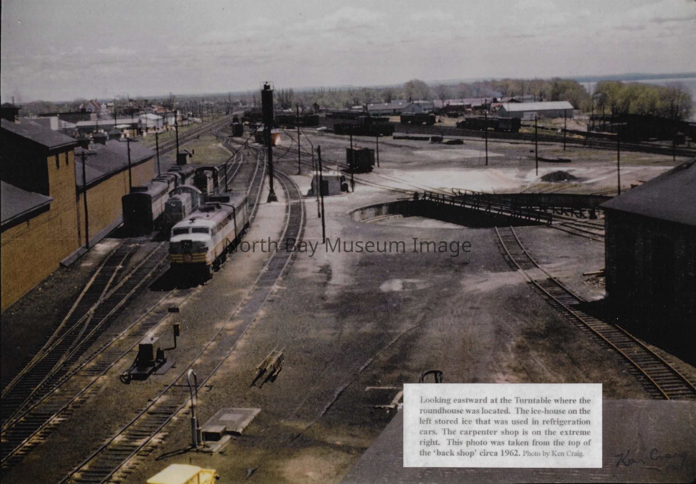 Series of photos by Ken Craig printed and laminated with captions explaining dates and photo captions. Not original photos, for reference of CPR North Bay buildings and yard from 1960-1990.