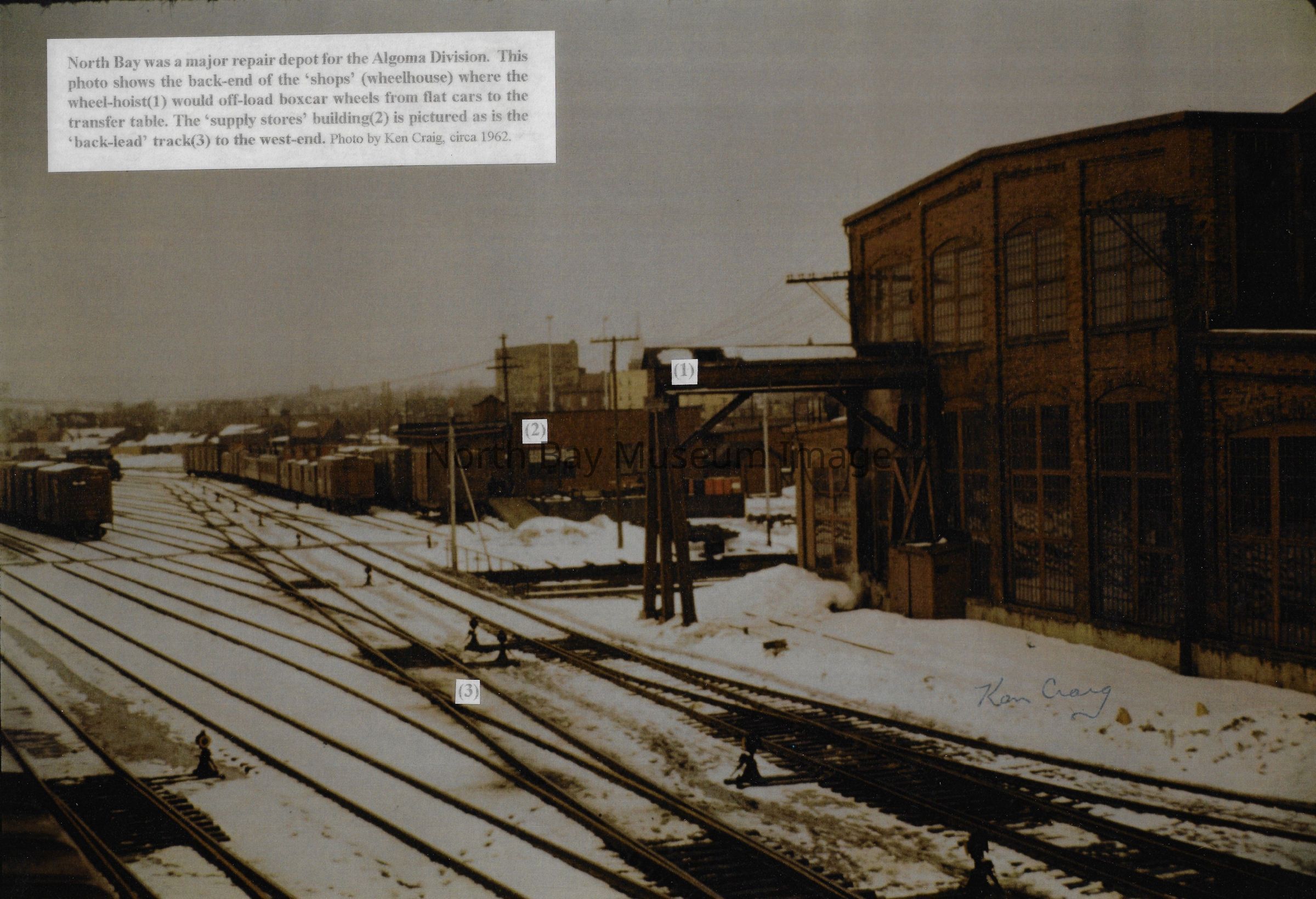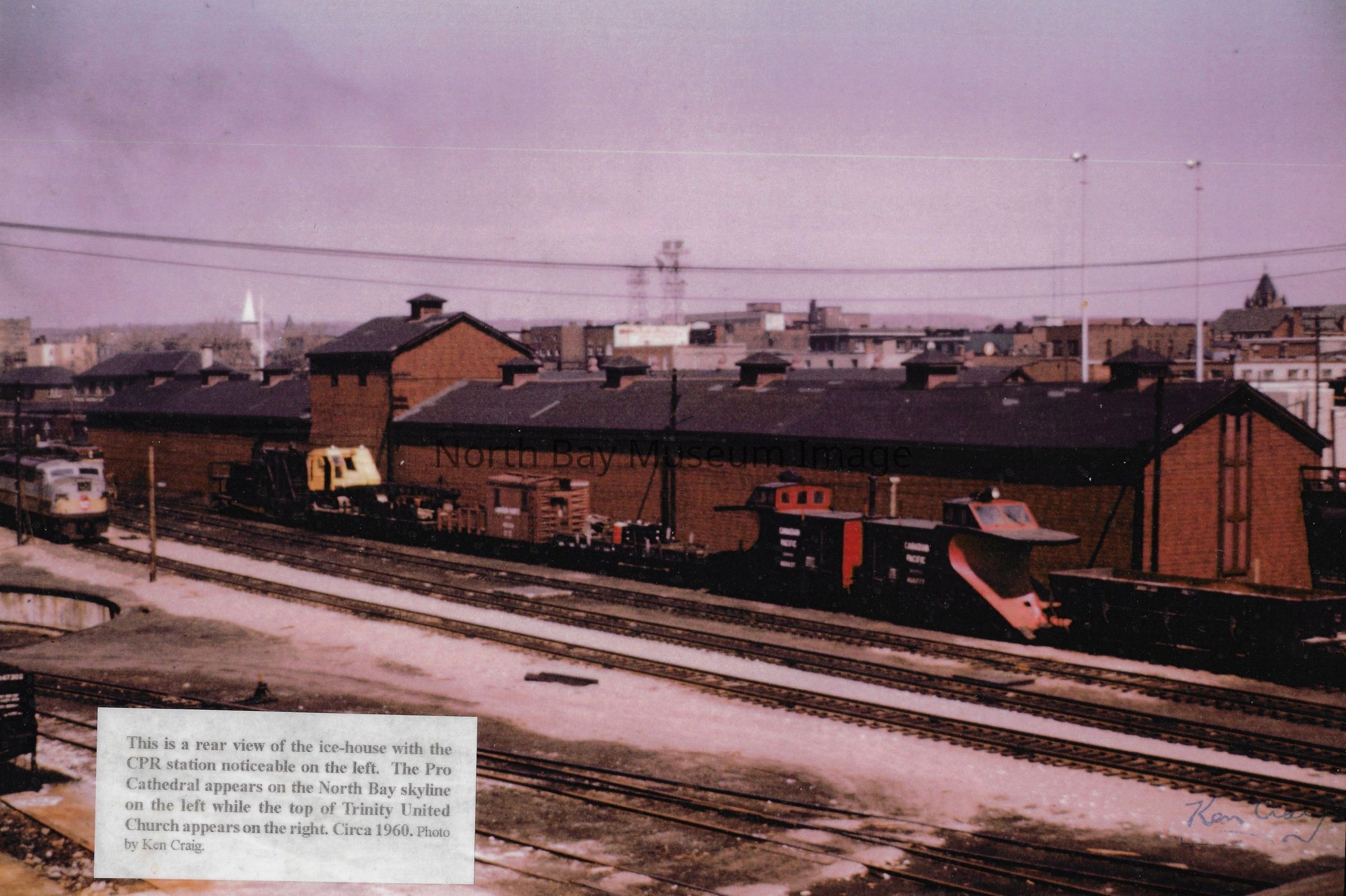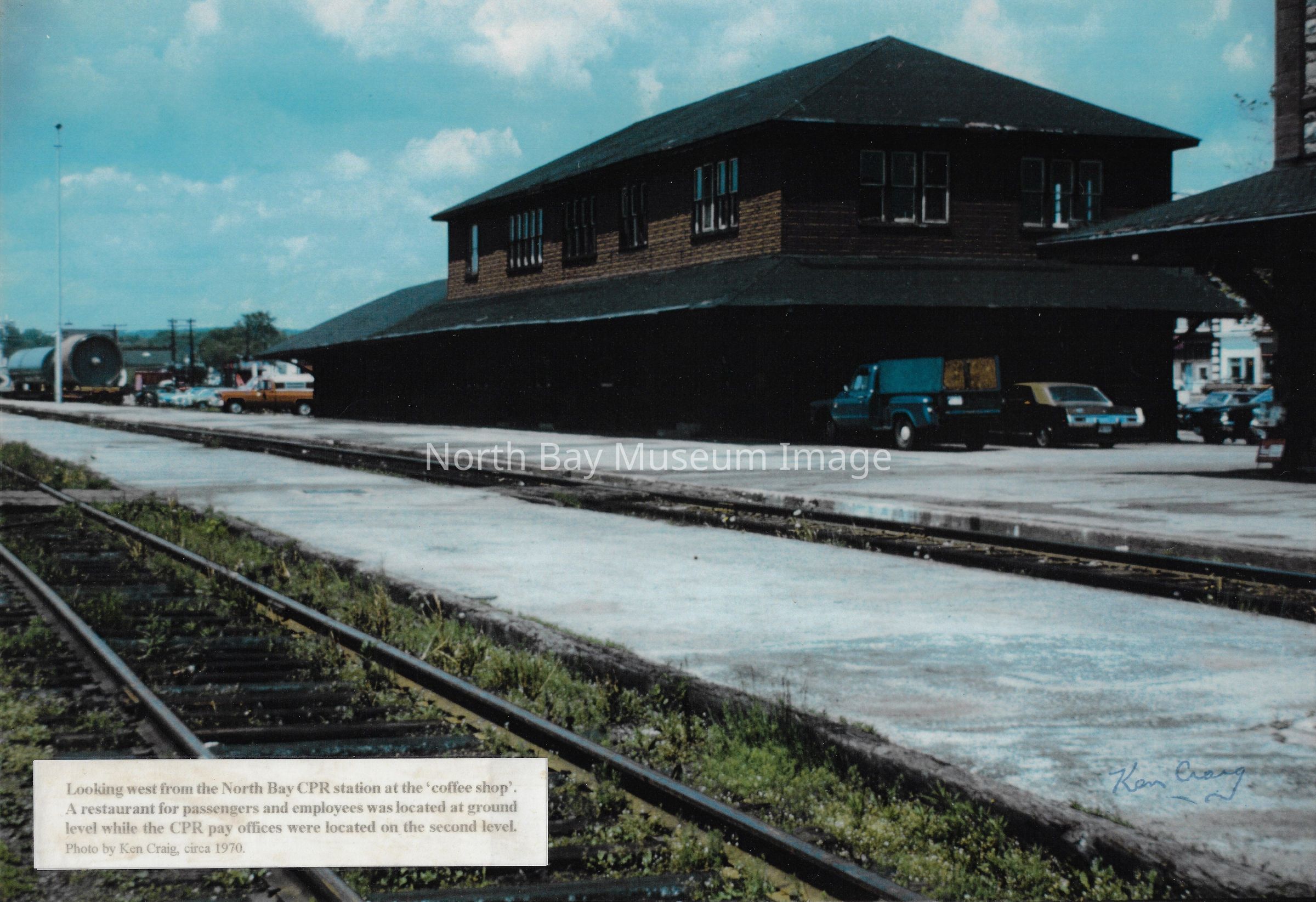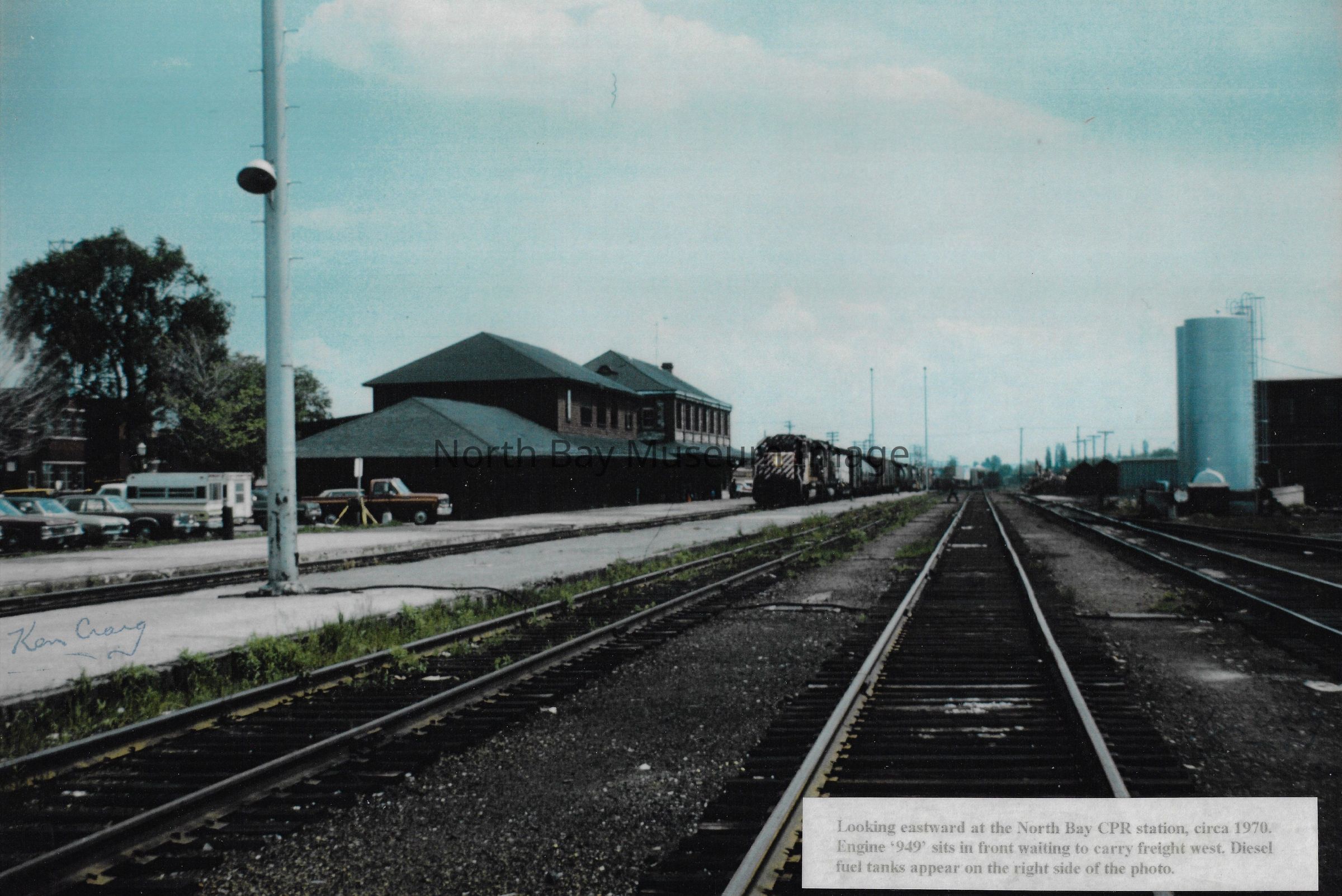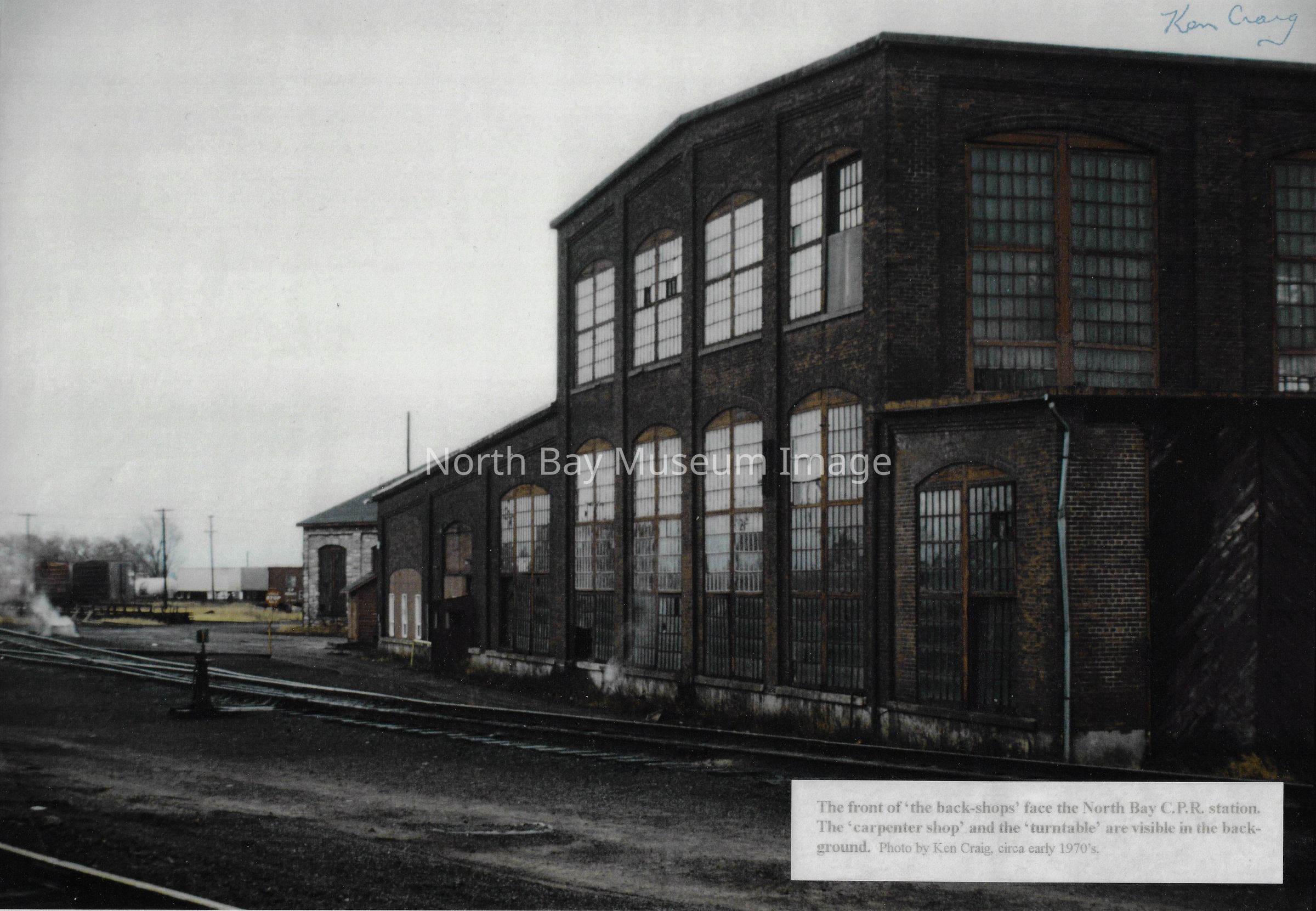 Series of photos by Ken Craig printed and laminated with captions explaining dates and photo captions. Not original photos, for reference of CPR North Bay buildings and yard from 1960-1990.