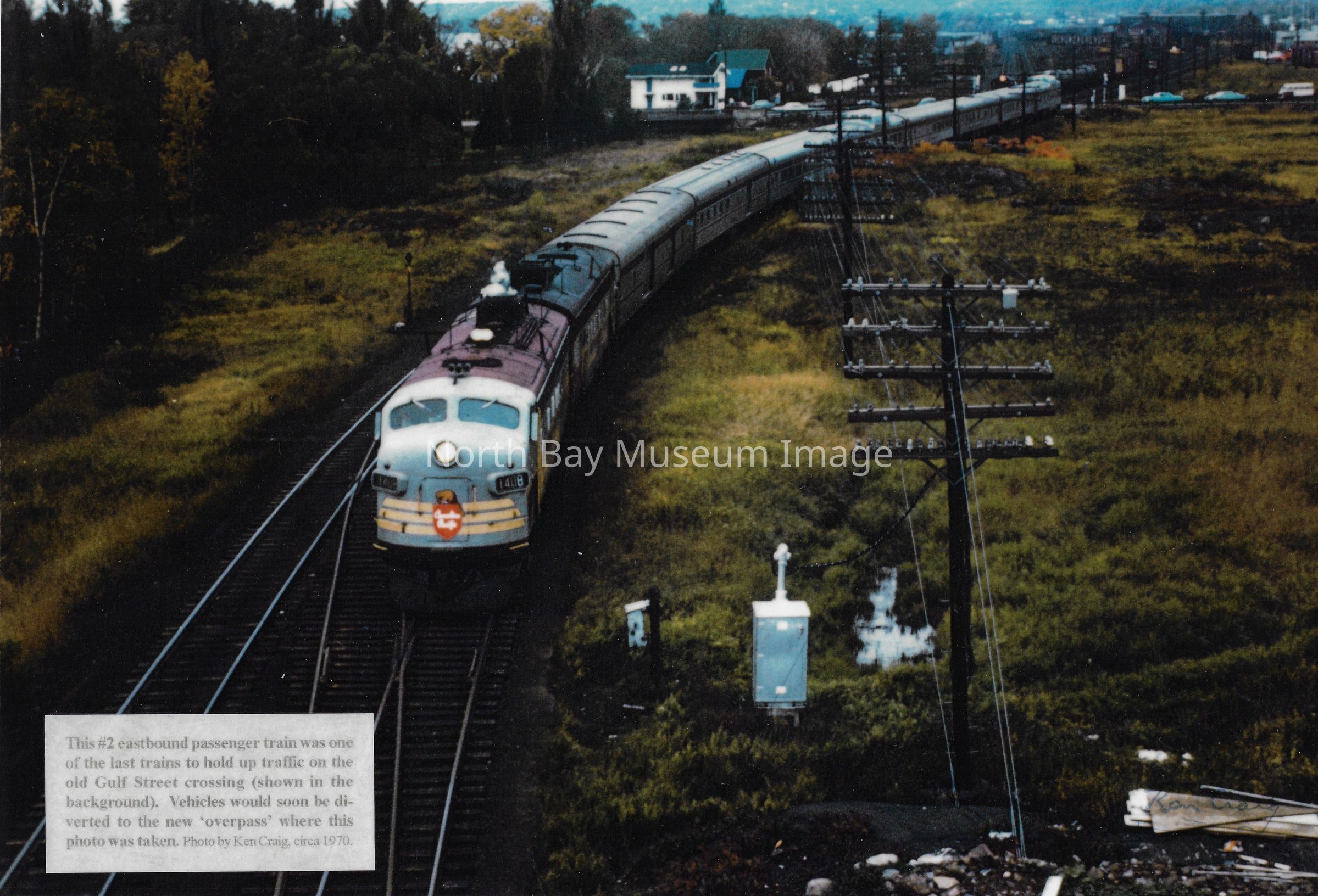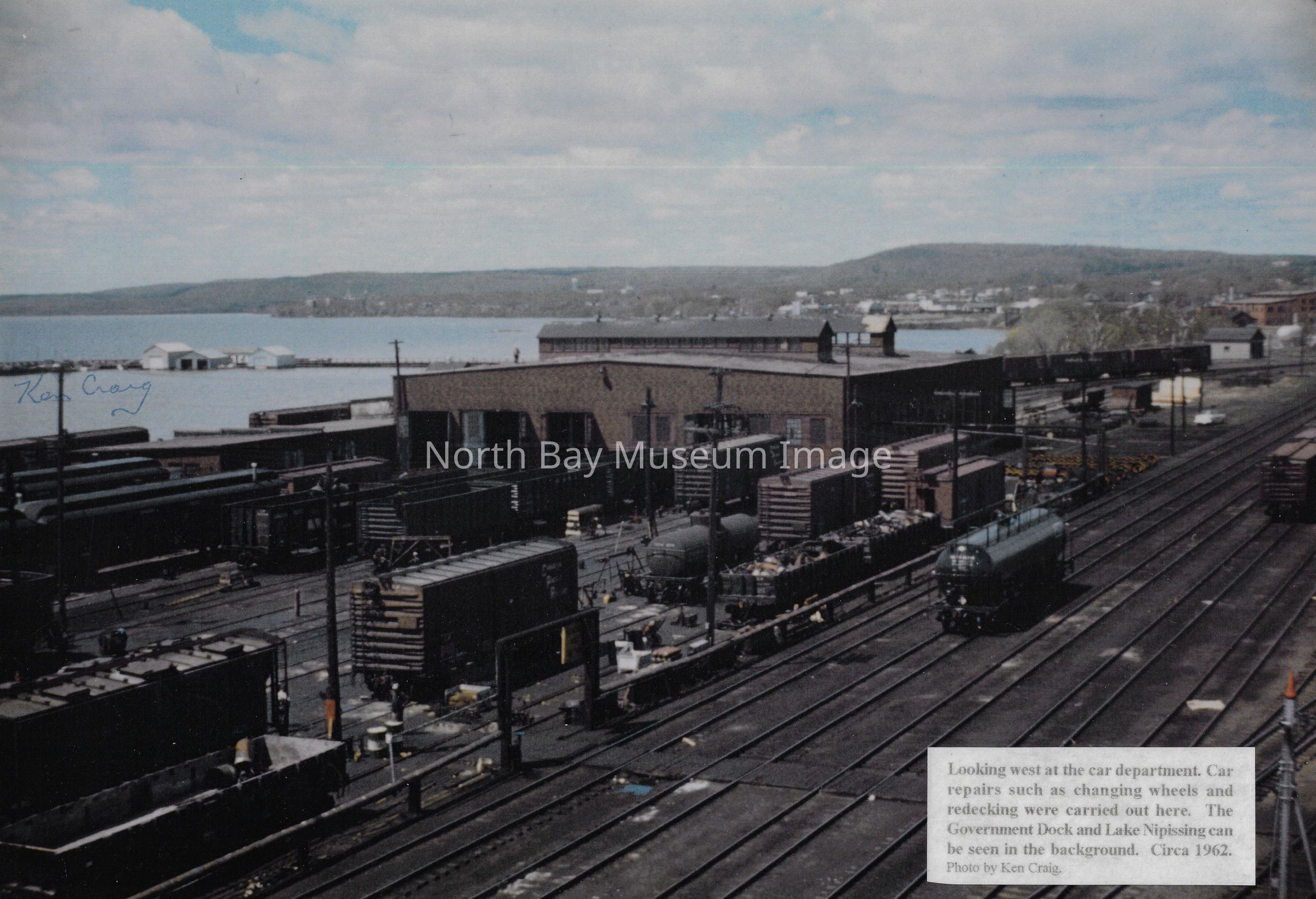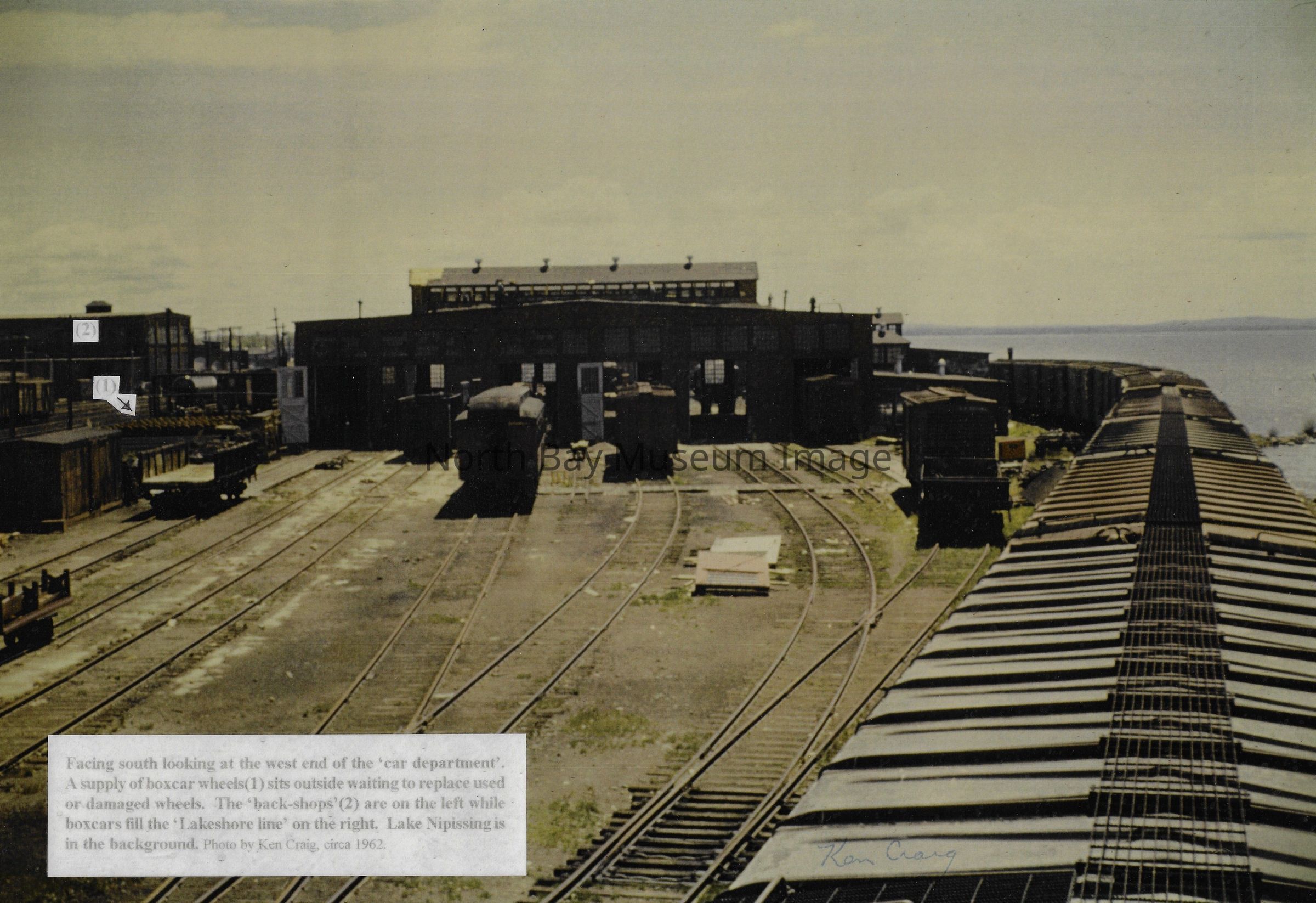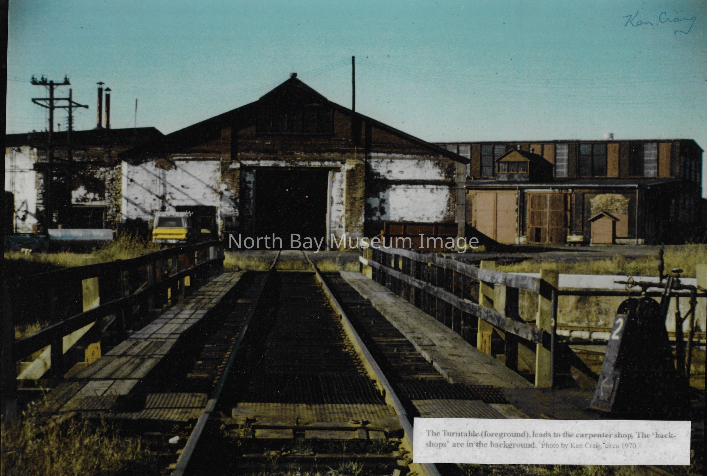 Series of photos by Ken Craig printed and laminated with captions explaining dates and photo captions. Not original photos, for reference of CPR North Bay buildings and yard from 1960-1990.
